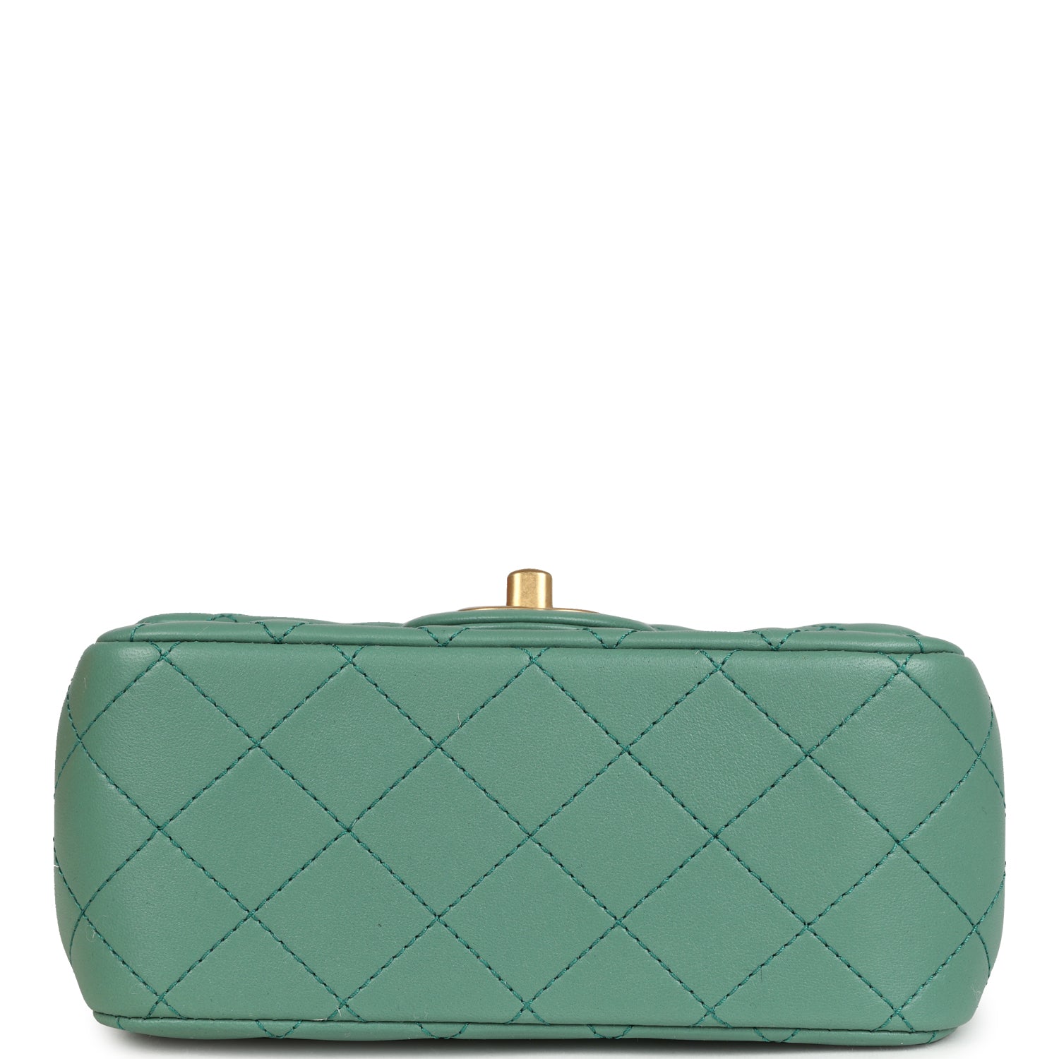 This Chanel Mini Square Pearl Crush Flap Bag is of green lambskin leather with antique gold tone hardware. It has a front flap with signature CC turnlock closure. tonal stitching. rear half moon pocket. single interwoven green leather and antique gold tone chain link shoulder/crossbody strap with adjustable chainlink "pearl" ball stopper.