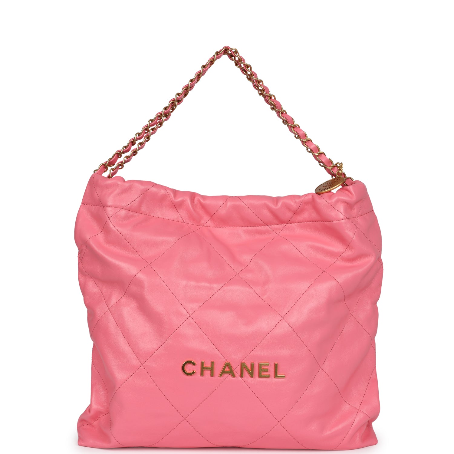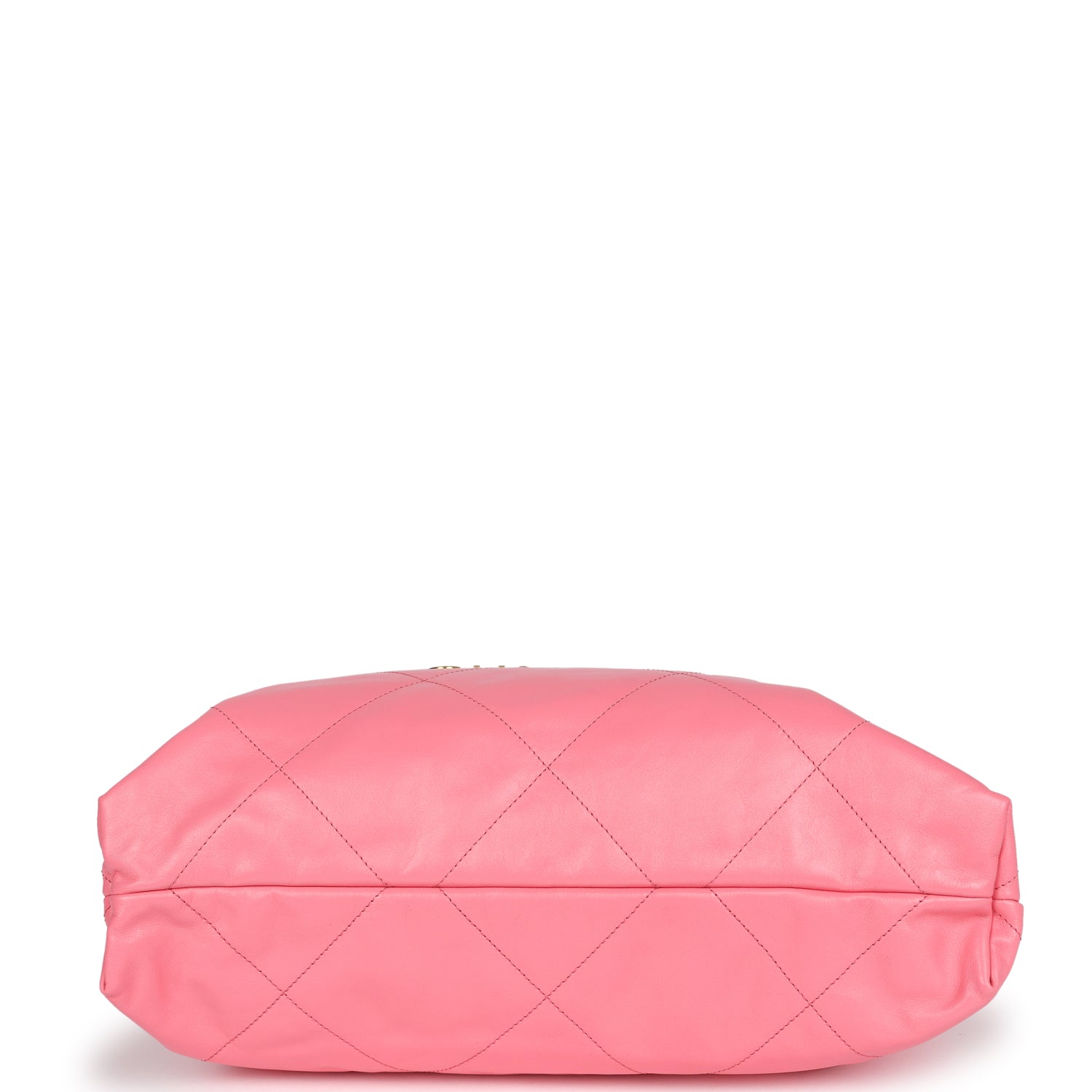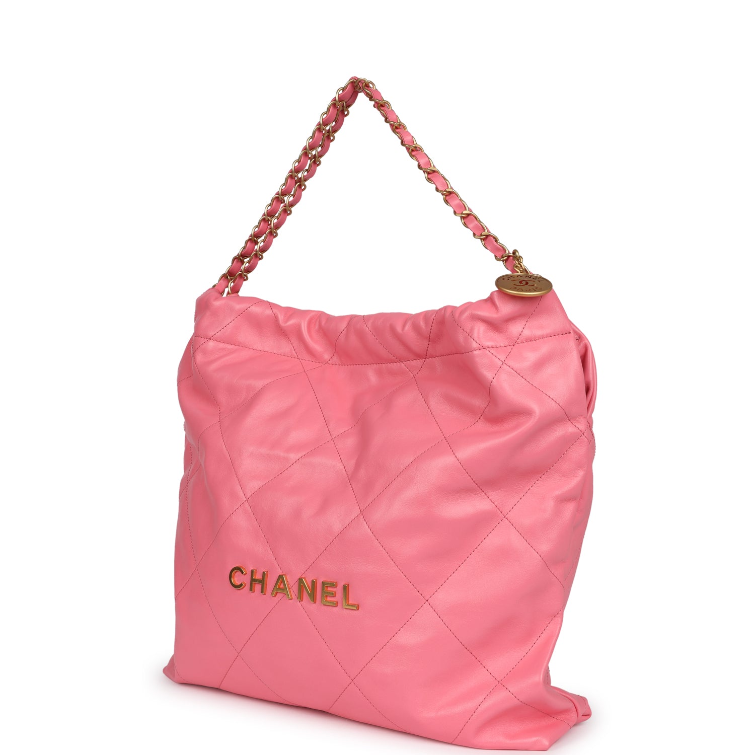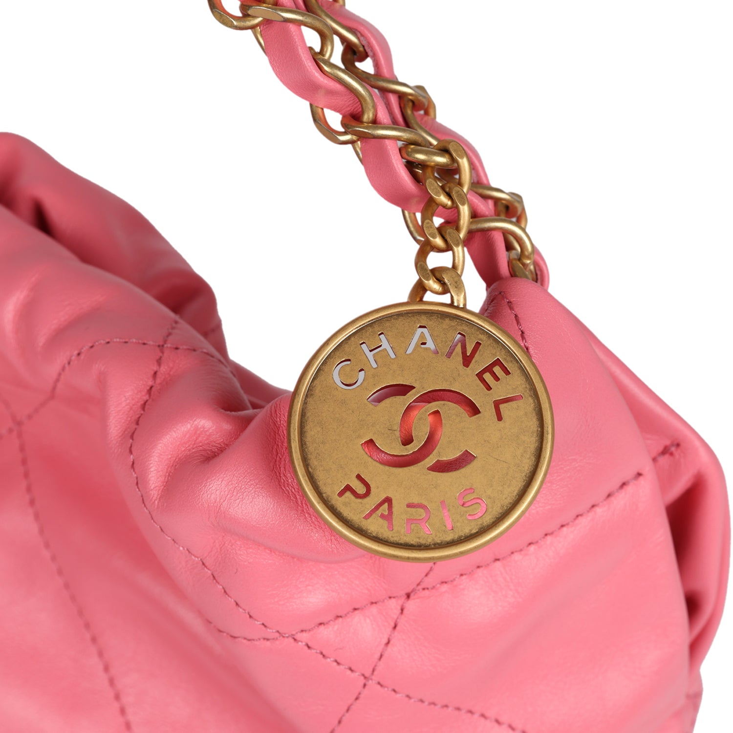 This Small 22 hobo bag is of pink calfskin with gold tone hardware and has the signature diamond quilting. CHANEL on the front in gold metal. removable pouch. and long gold tone and pink leather chain.