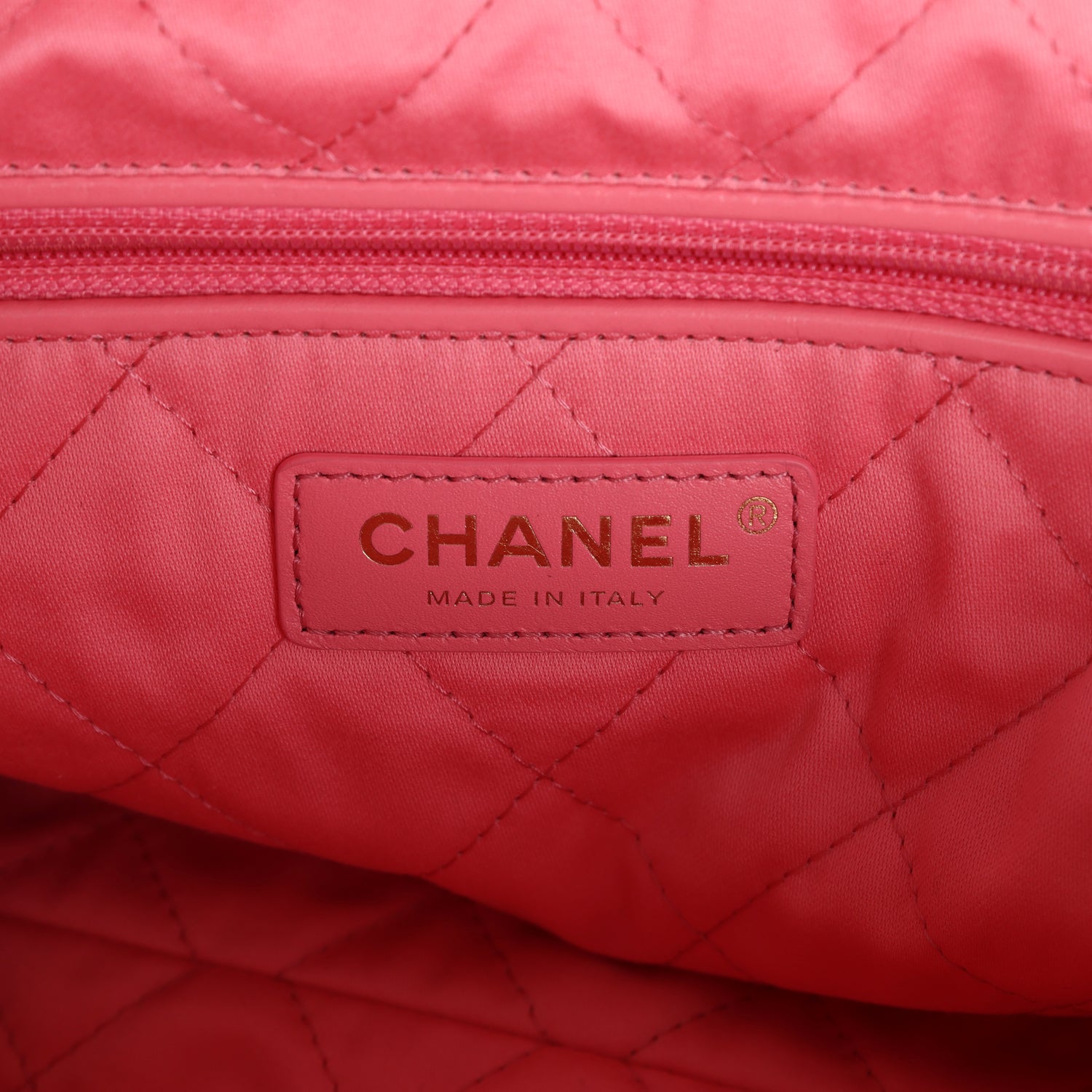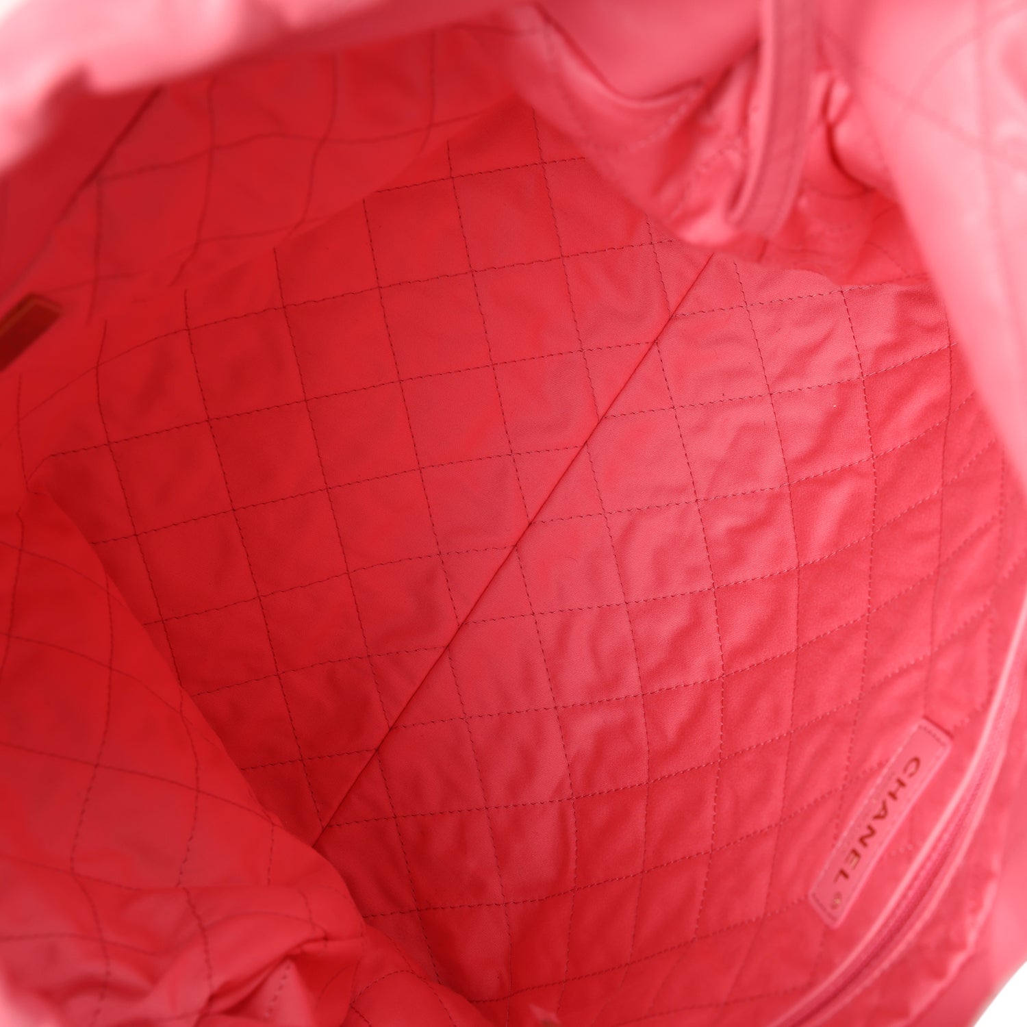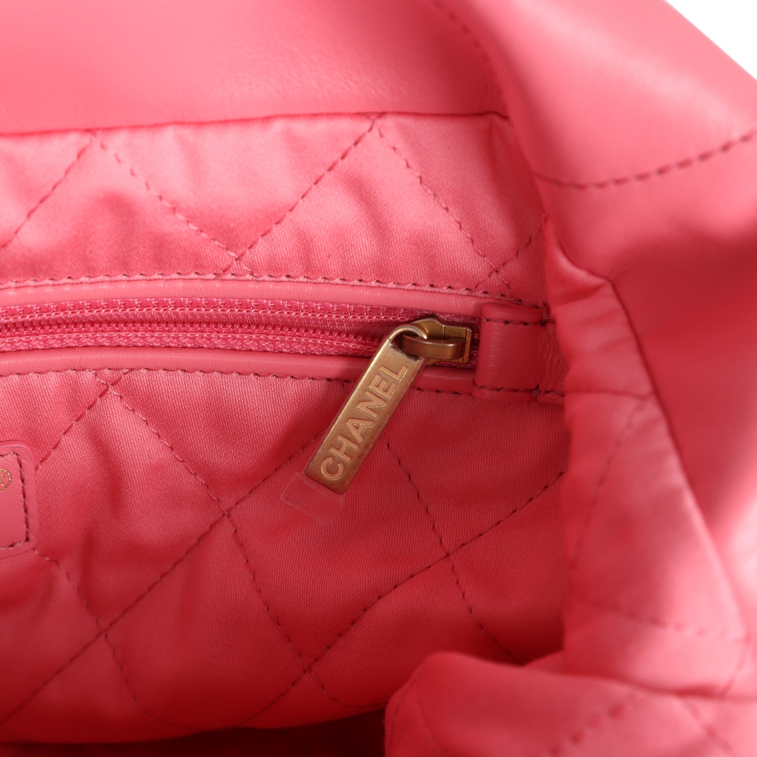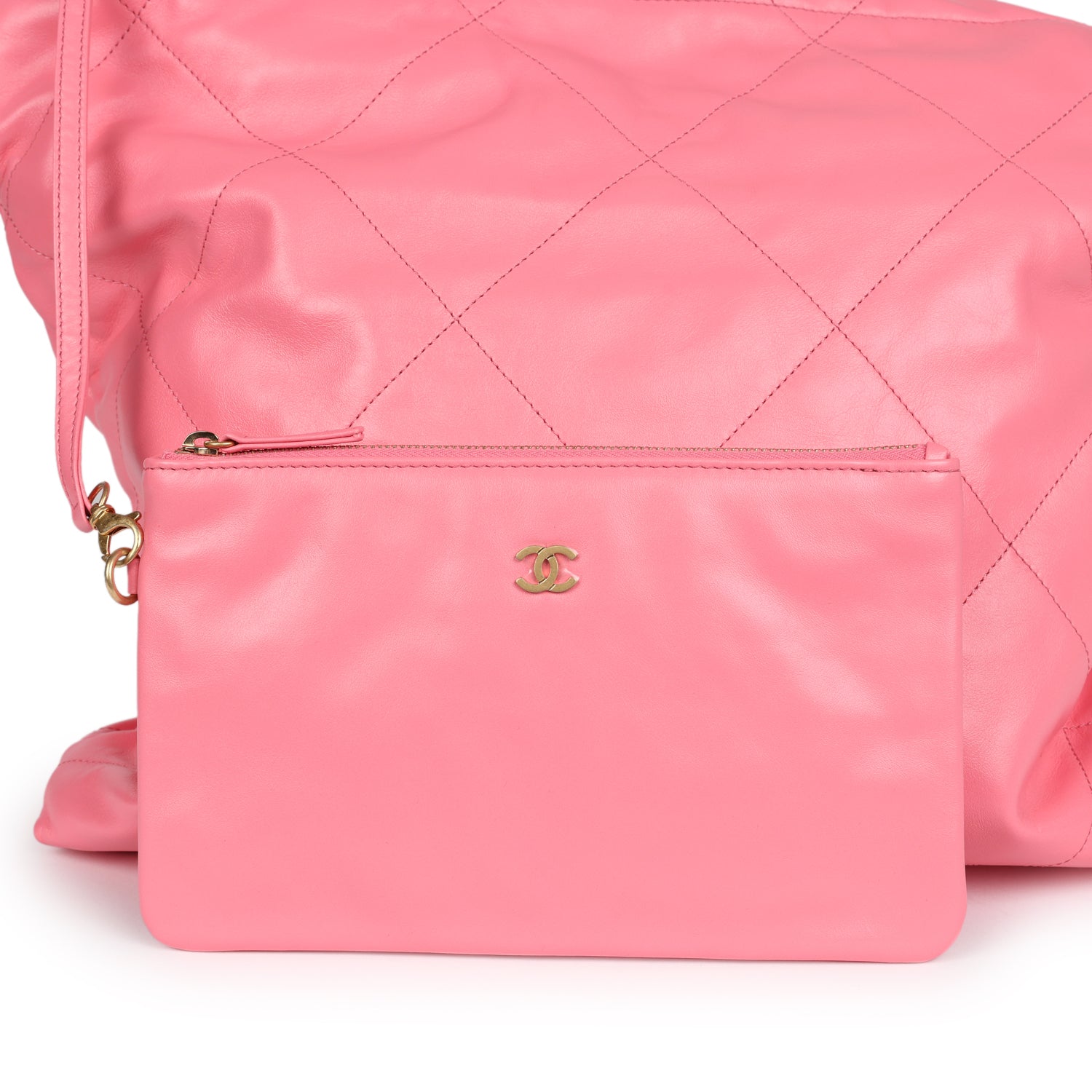 This Small 22 hobo bag is of pink calfskin with gold tone hardware and has the signature diamond quilting. CHANEL on the front in gold metal. removable pouch. and long gold tone and pink leather chain.