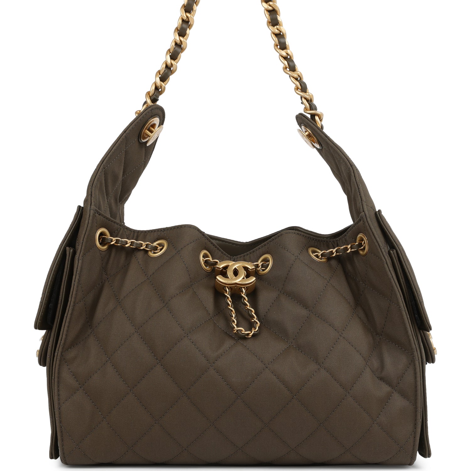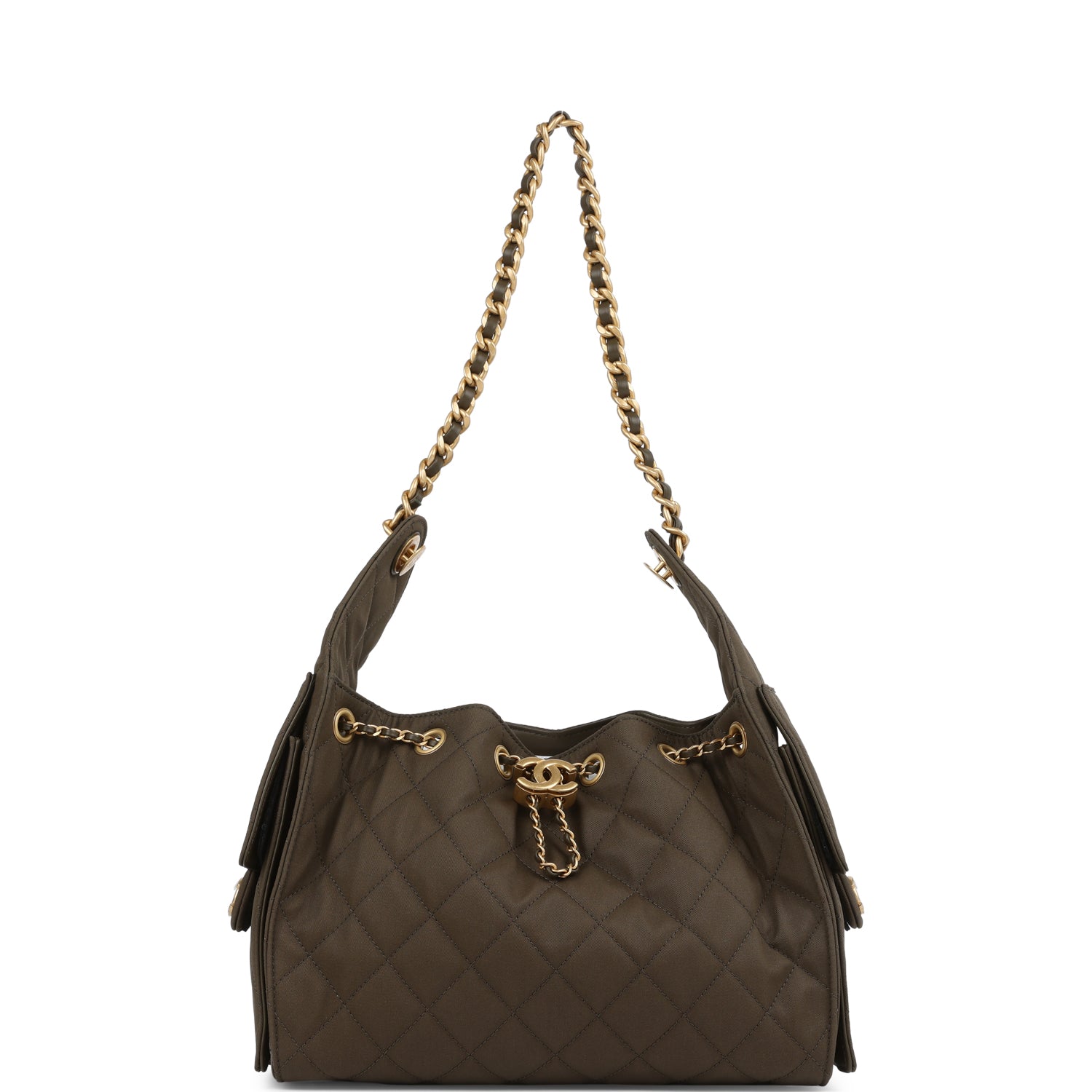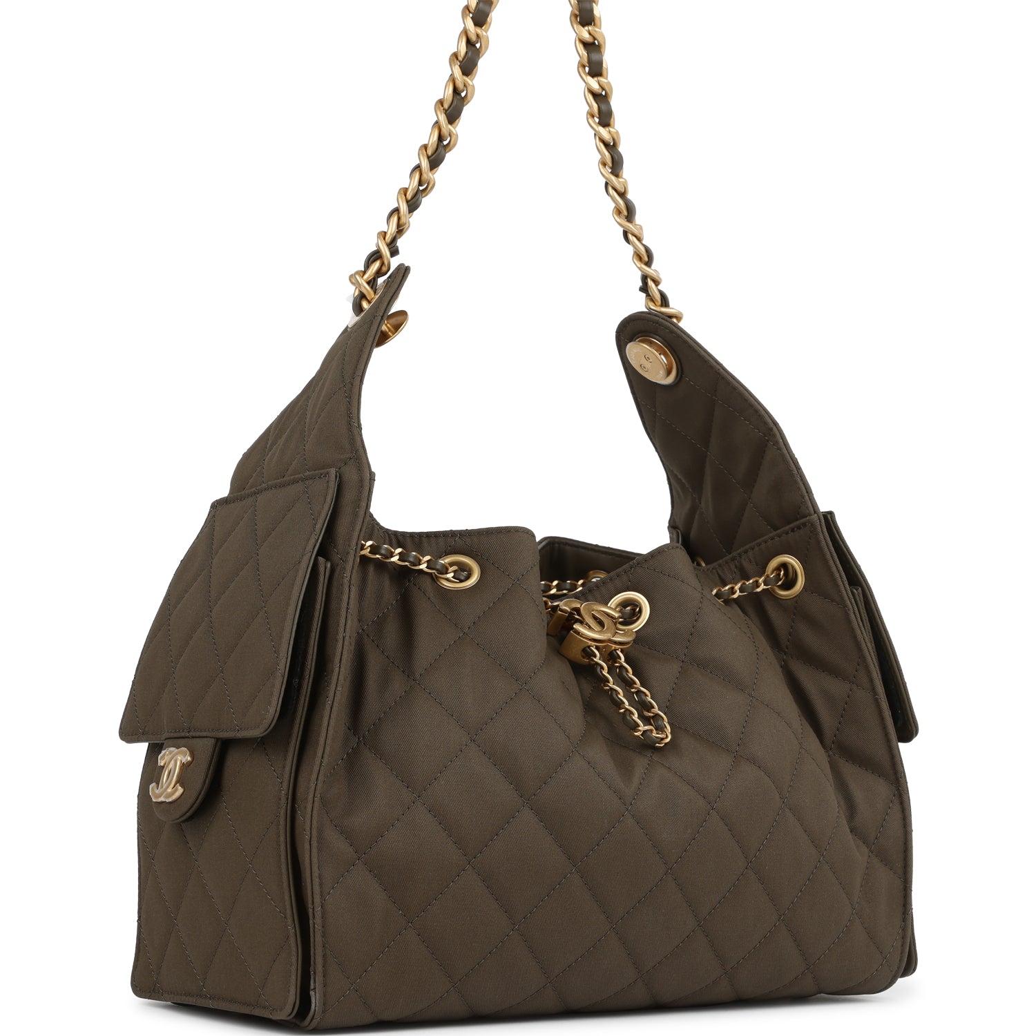 This Chanel Small 25 Hobo Bag is in khaki toile canvas with antique gold hardware. features signature diamond quilt. two exterior side pockets. drawstring closure. and a single interwoven antique gold and khaki leather shoulder strap.