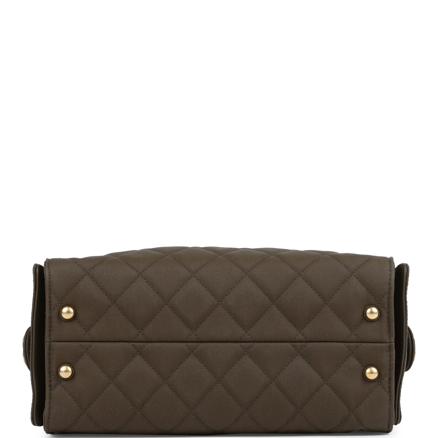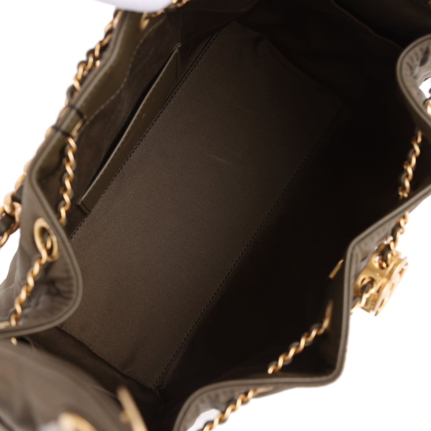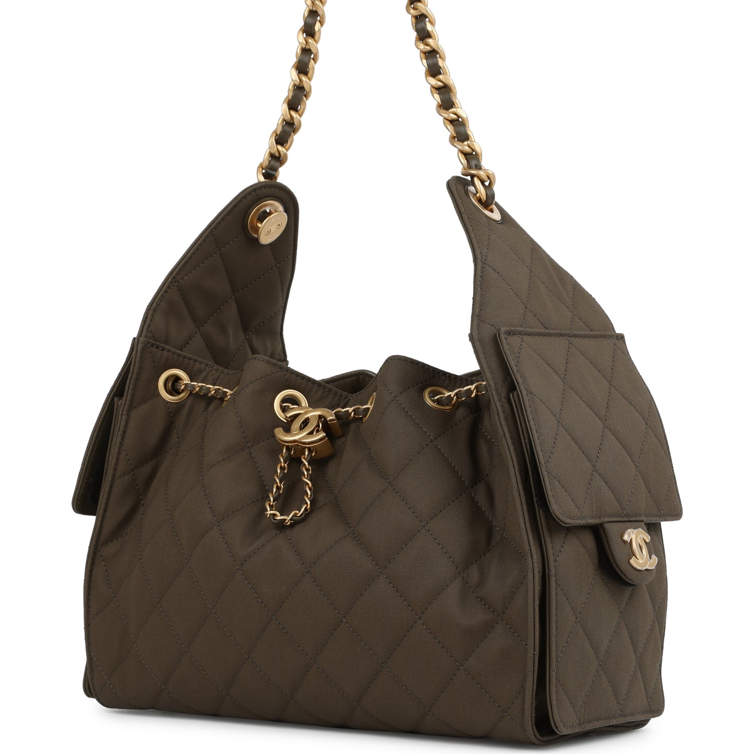 This Chanel Small 25 Hobo Bag is in khaki toile canvas with antique gold hardware. features signature diamond quilt. two exterior side pockets. drawstring closure. and a single interwoven antique gold and khaki leather shoulder strap.