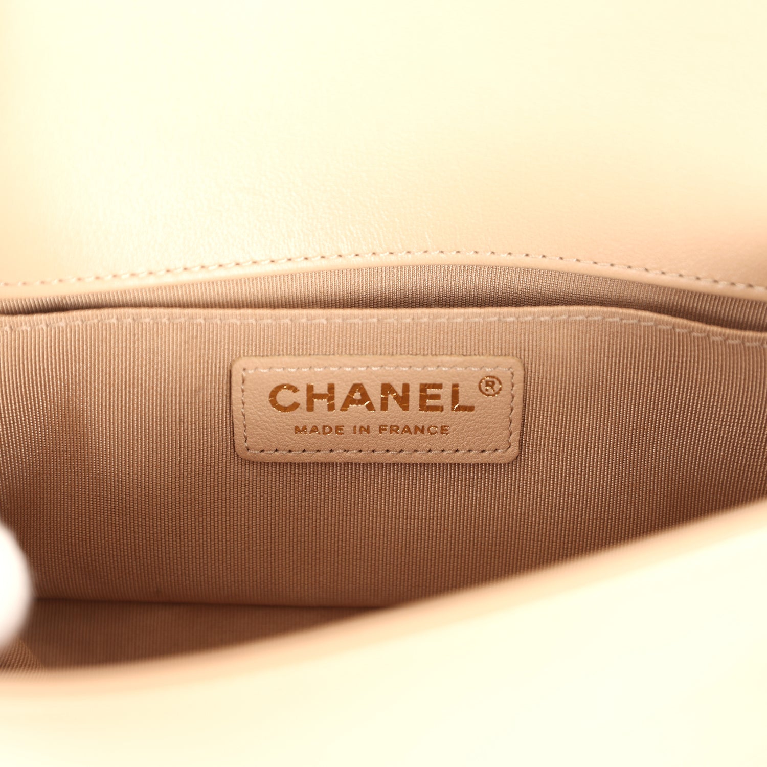 This Small Boy Bag is in beige lambskin leather with light gold tone hardware. and features tonal stitching. front flap with Le Boy CC push closure. smooth leather trim. and light gold tone chain link and beige leather shoulder strap.