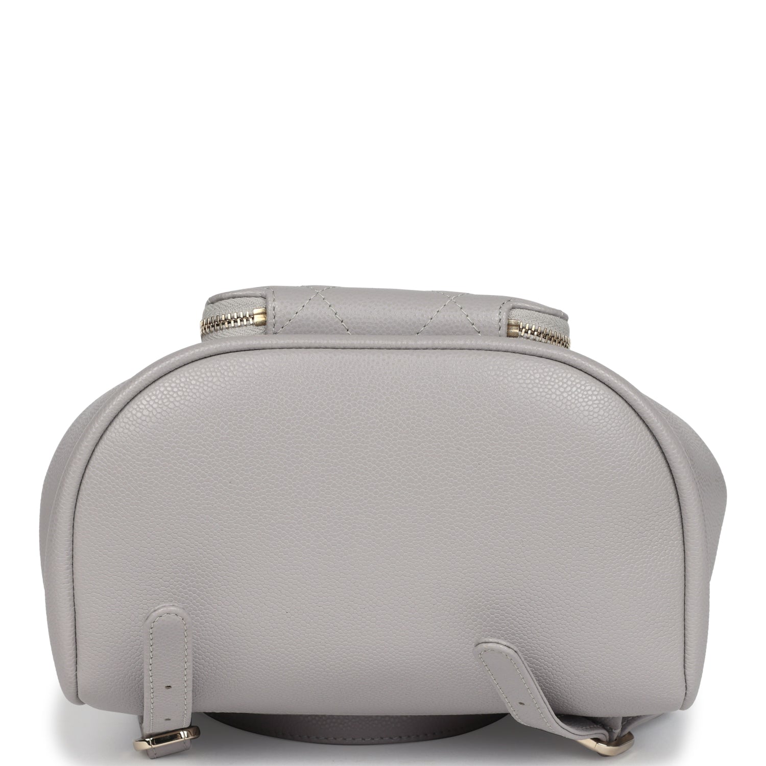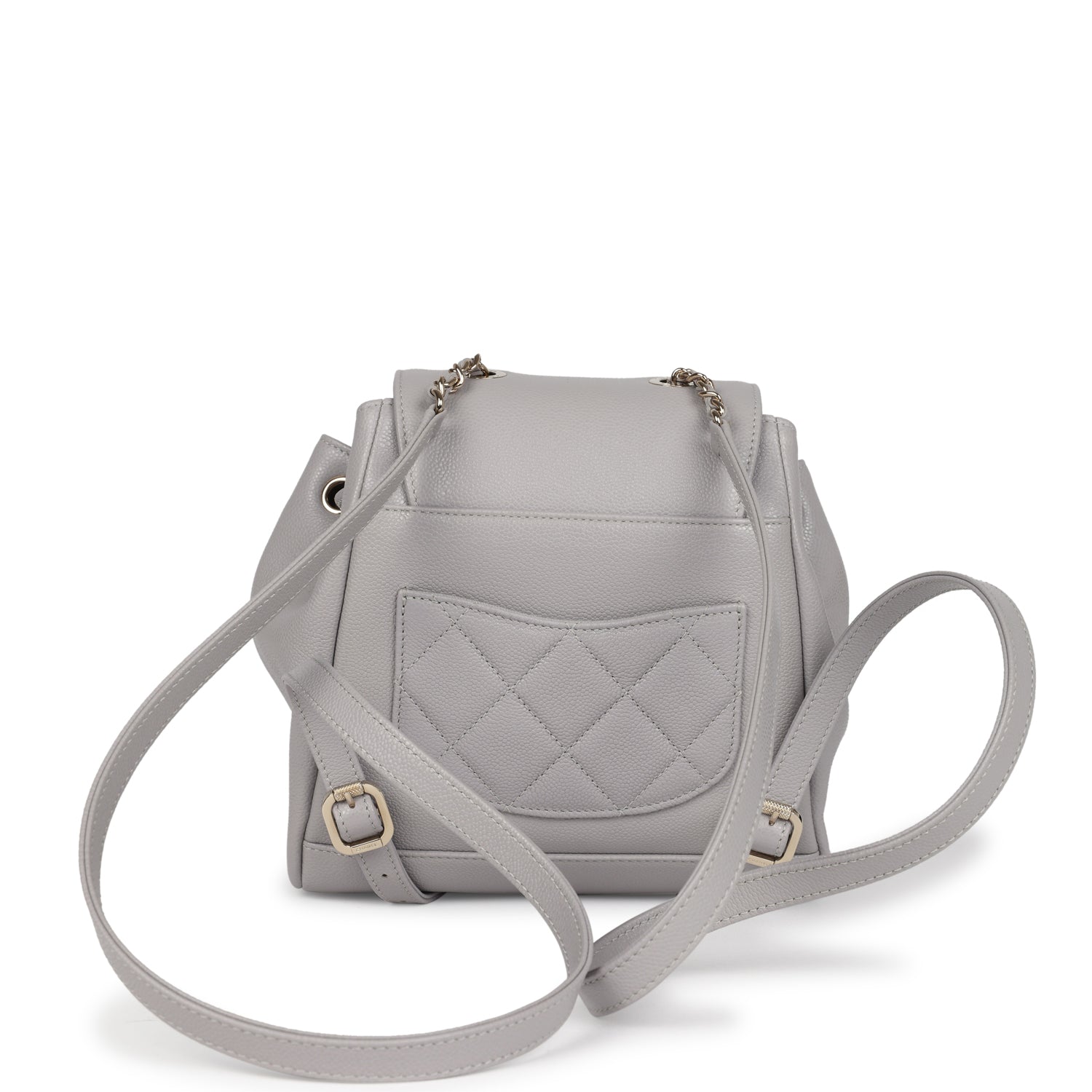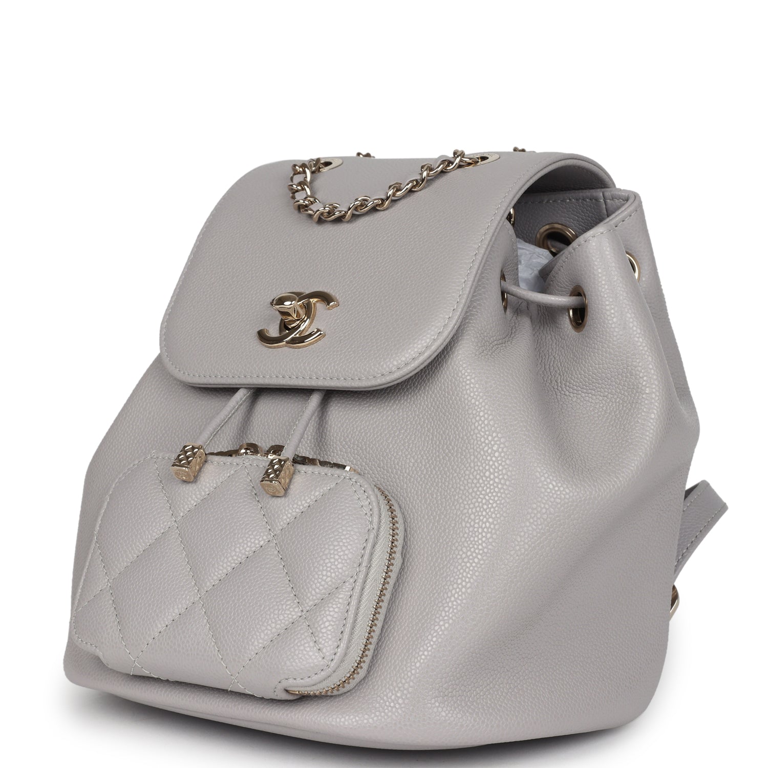This Chanel Small Business Affinity Backpack is in light grey shiny grained calfskin leather with light gold tone hardware. This backpack features a small quilted leather zippered coin pocket on the front of the bag. cc turnlock closure and drawstring pull. one slit pocket on rear wall. small halfmoon pocket on back of bag. two adjustable light grey leather backpack straps.
