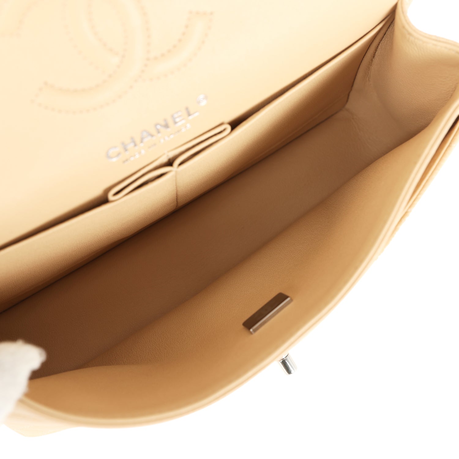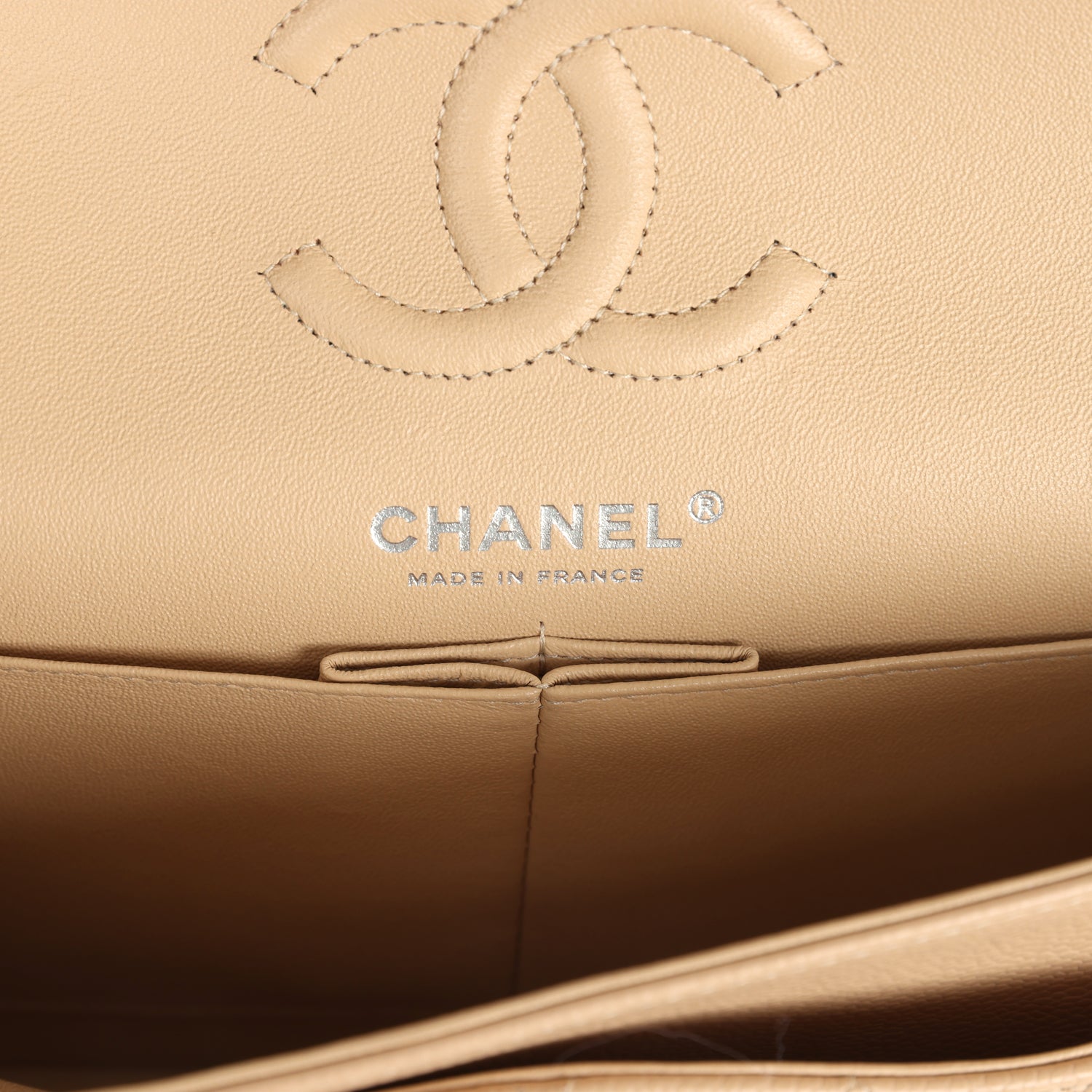 This Small Classic Double Flap Bag is in beige caviar leather with silver tone hardware. tonal stitching. front flap with CC turnlock closure. half moon back pocket and adjustable interwoven chain link silver tone and beige leather shoulder/crossbody strap.