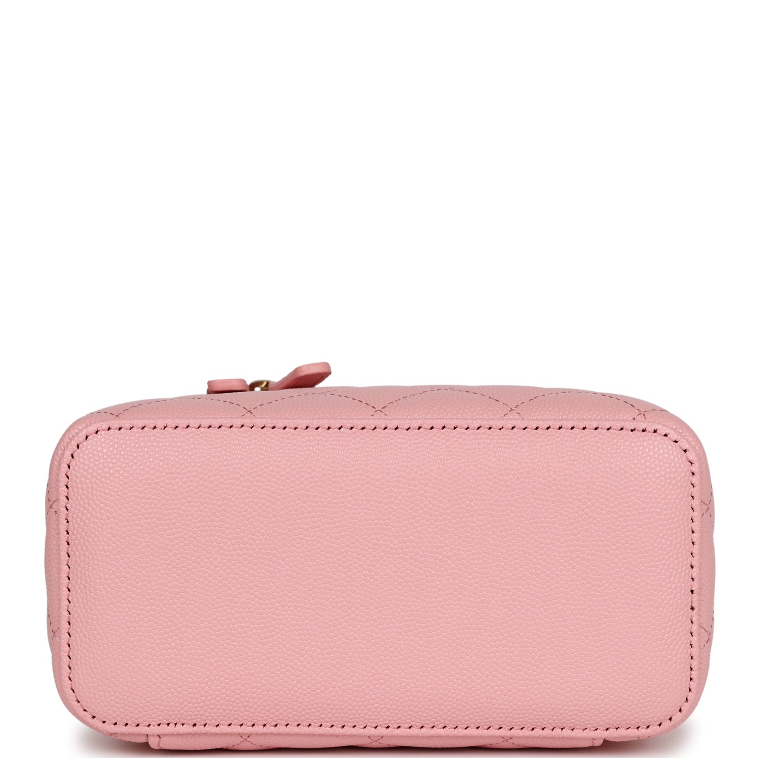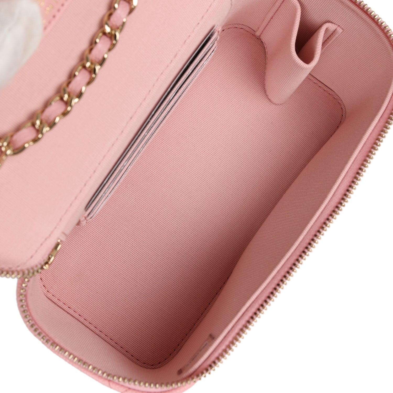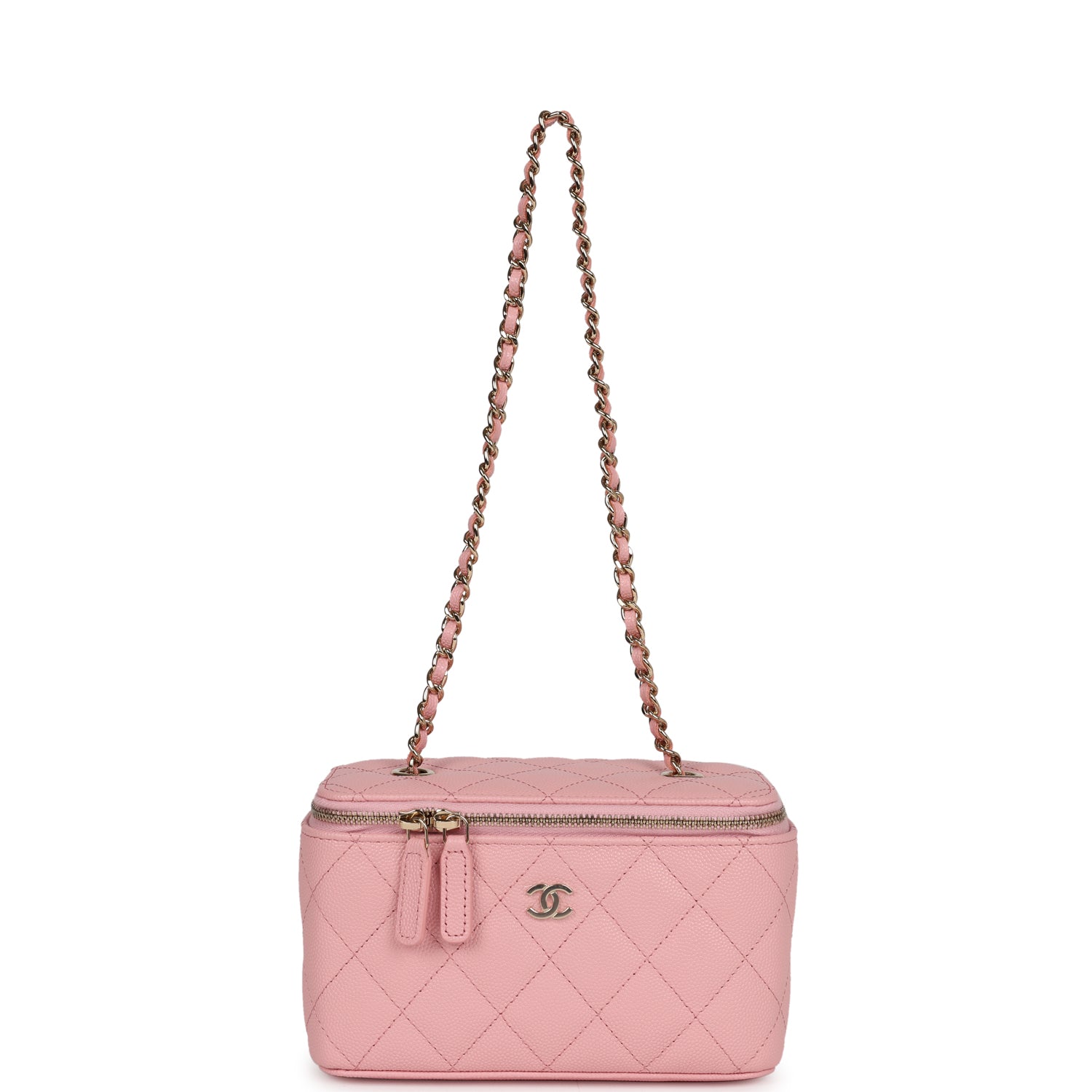This Small Rectangular Vanity Case is in pink caviar leather with light gold hardware. tonal stitching. CC logo on front of vanity case. top zip around closure with leather pull. three interior card slots and a long crossbody/shoulder light gold interwoven with pink leather chain strap.