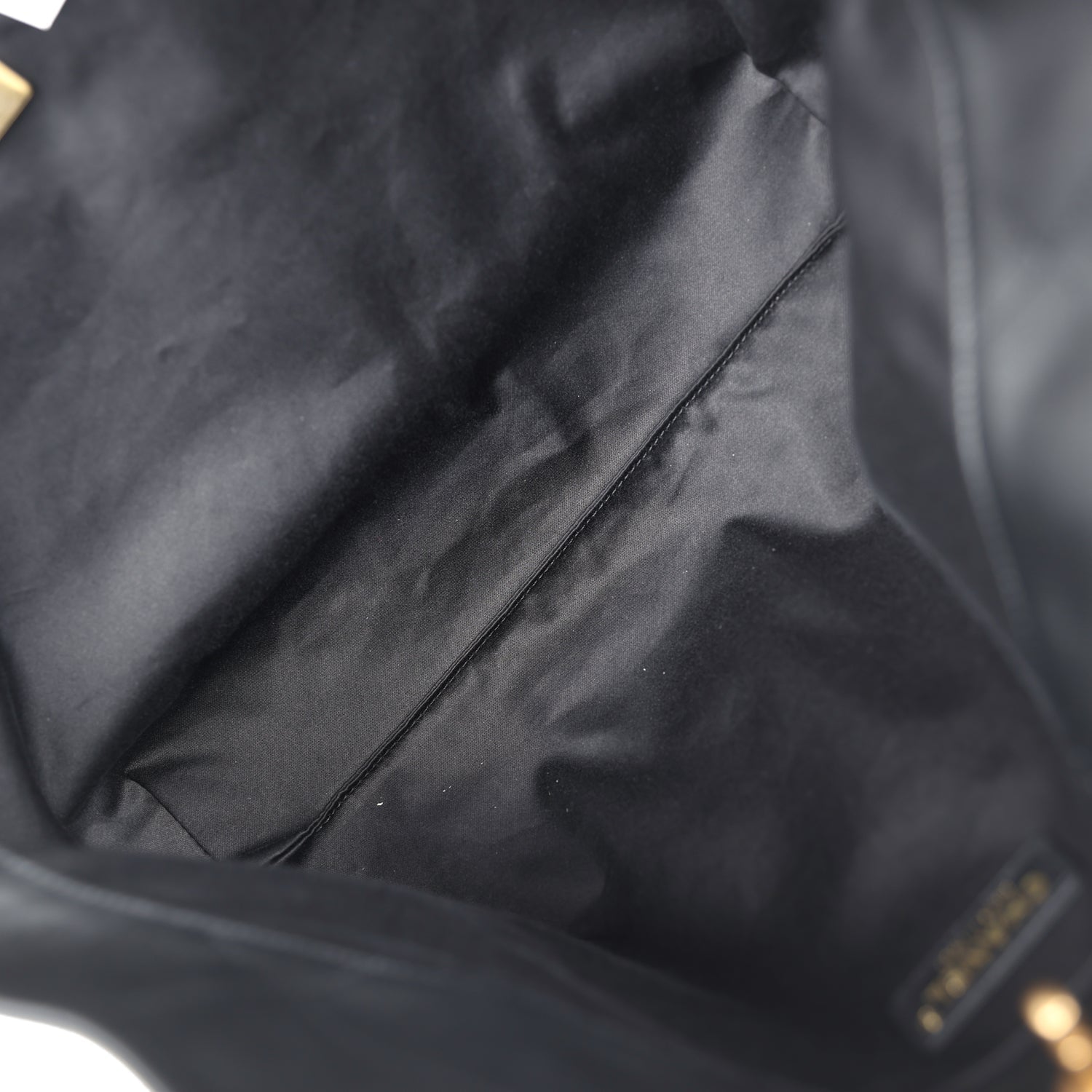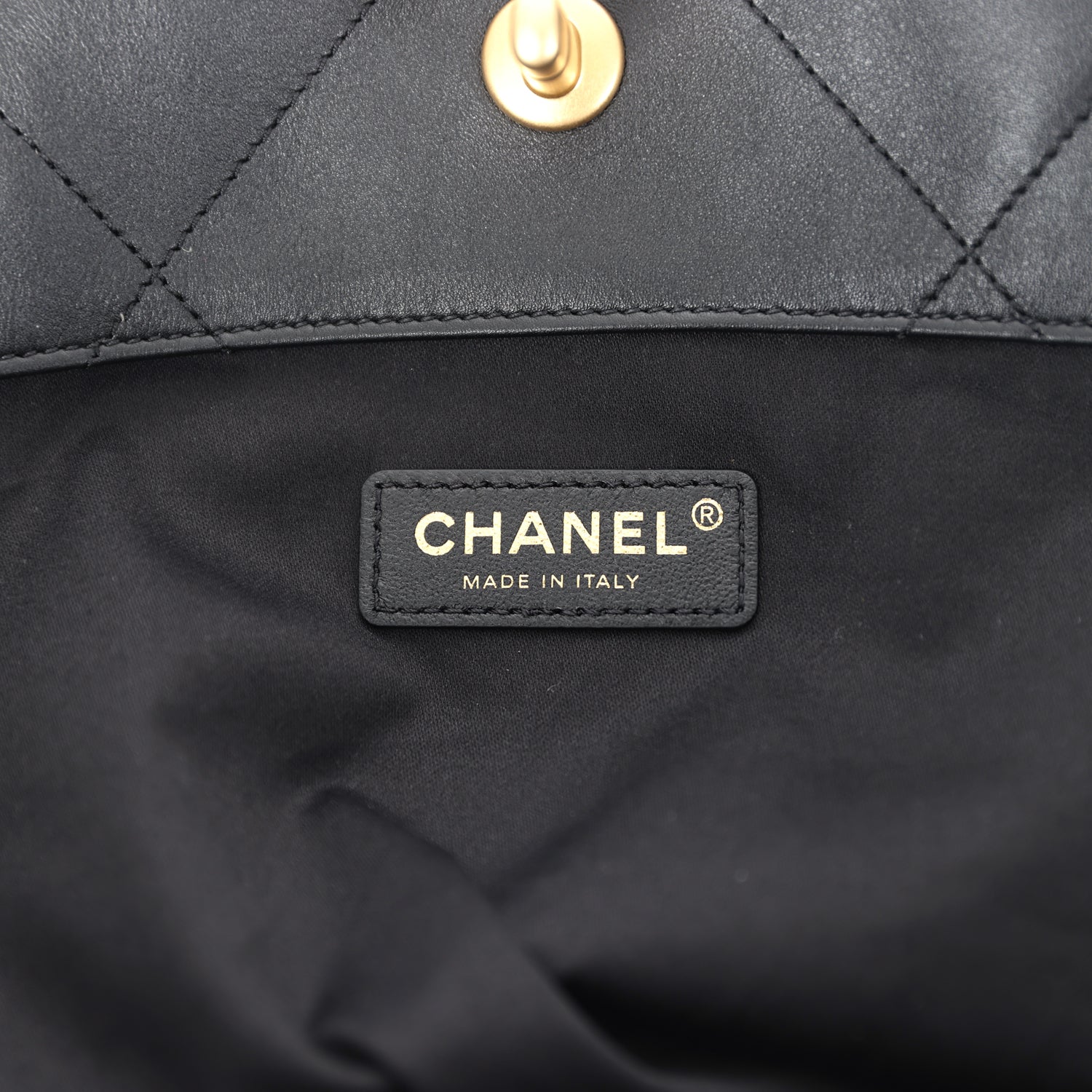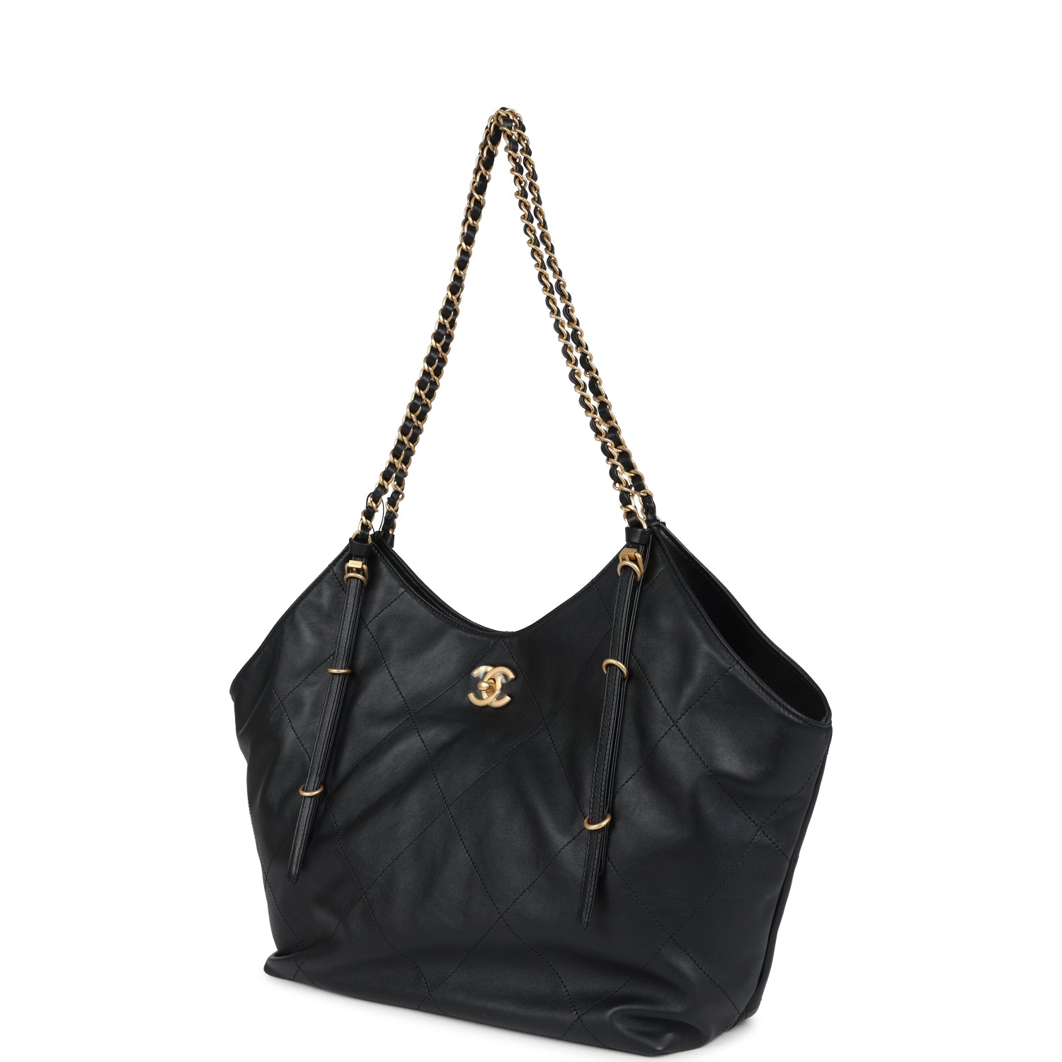 This Chanel Small Coco Shopping Tote bag is in black calfskin leather with antique gold hardware featuring large flat diamond quilt leather. a front cc turnlock closure. a removable pouch. and interwoven antique gold tone chain link and black leather shoulder straps.