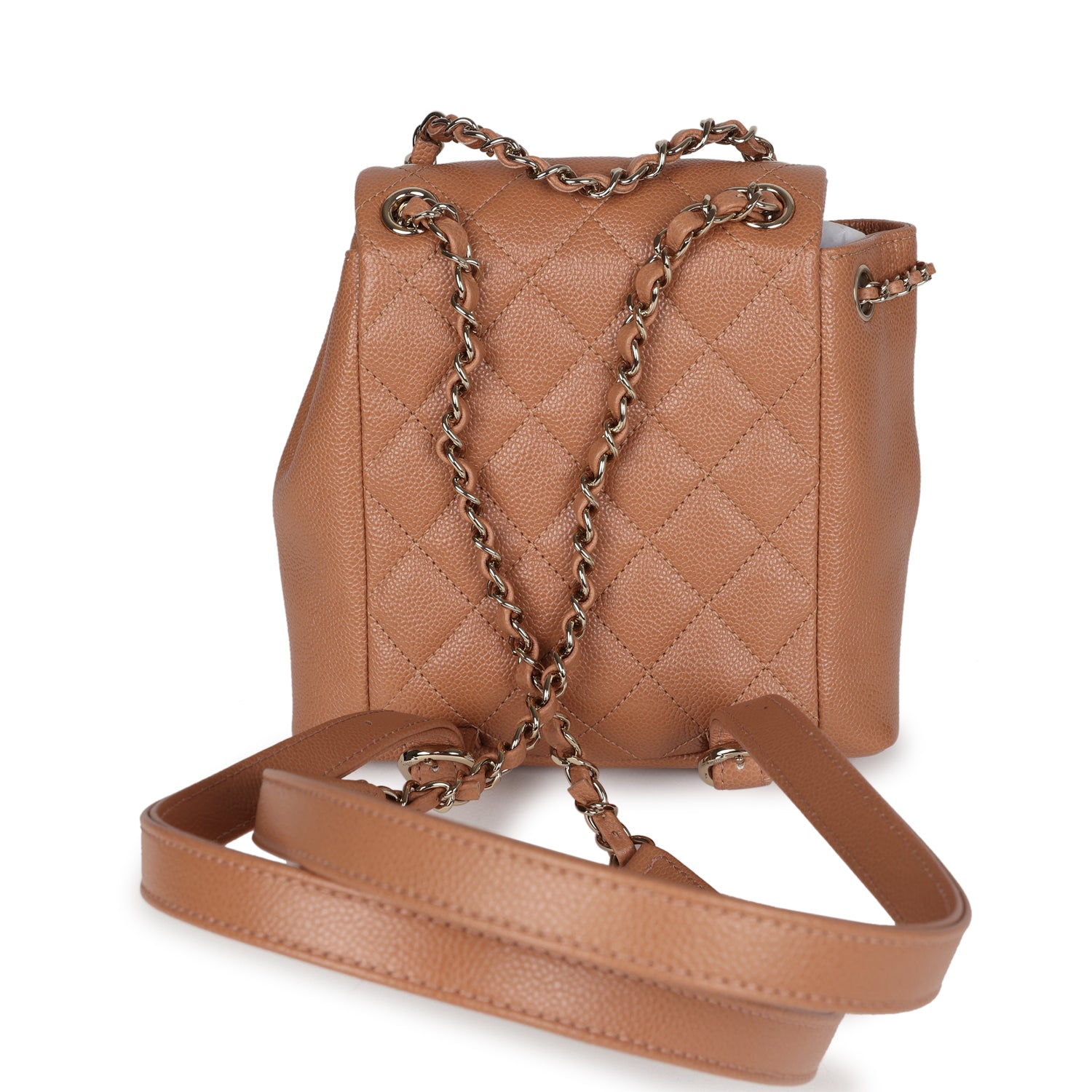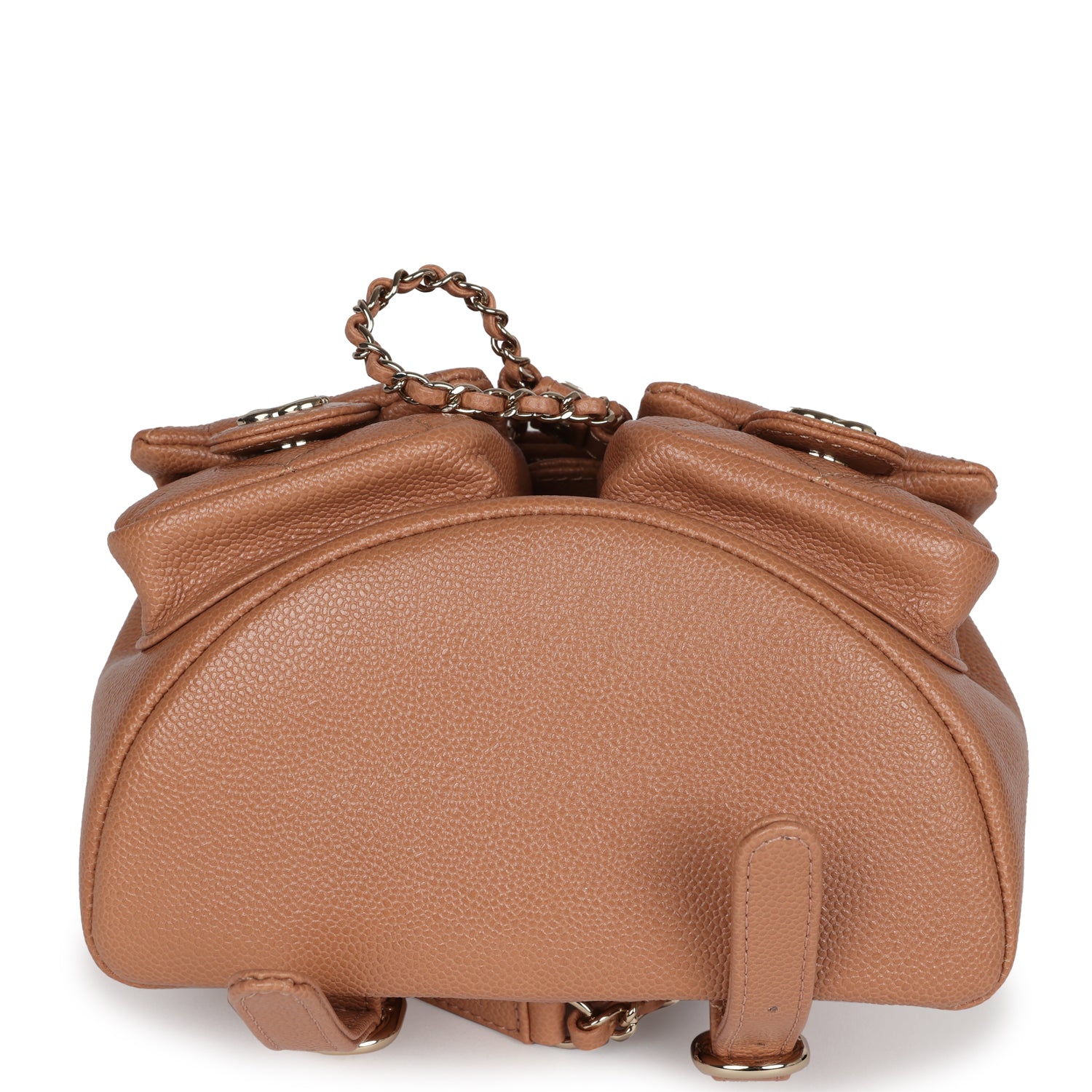 This Chanel Small Cargo Backpack is of dark beige grained calfskin leather with light gold tone hardware and has a front flap with signature CC logo. drawstring pull. two front pockets. a interwoven leather and light gold chainlink top handle. and adjustable interwoven leather and light gold tone backpack shoulder straps.
