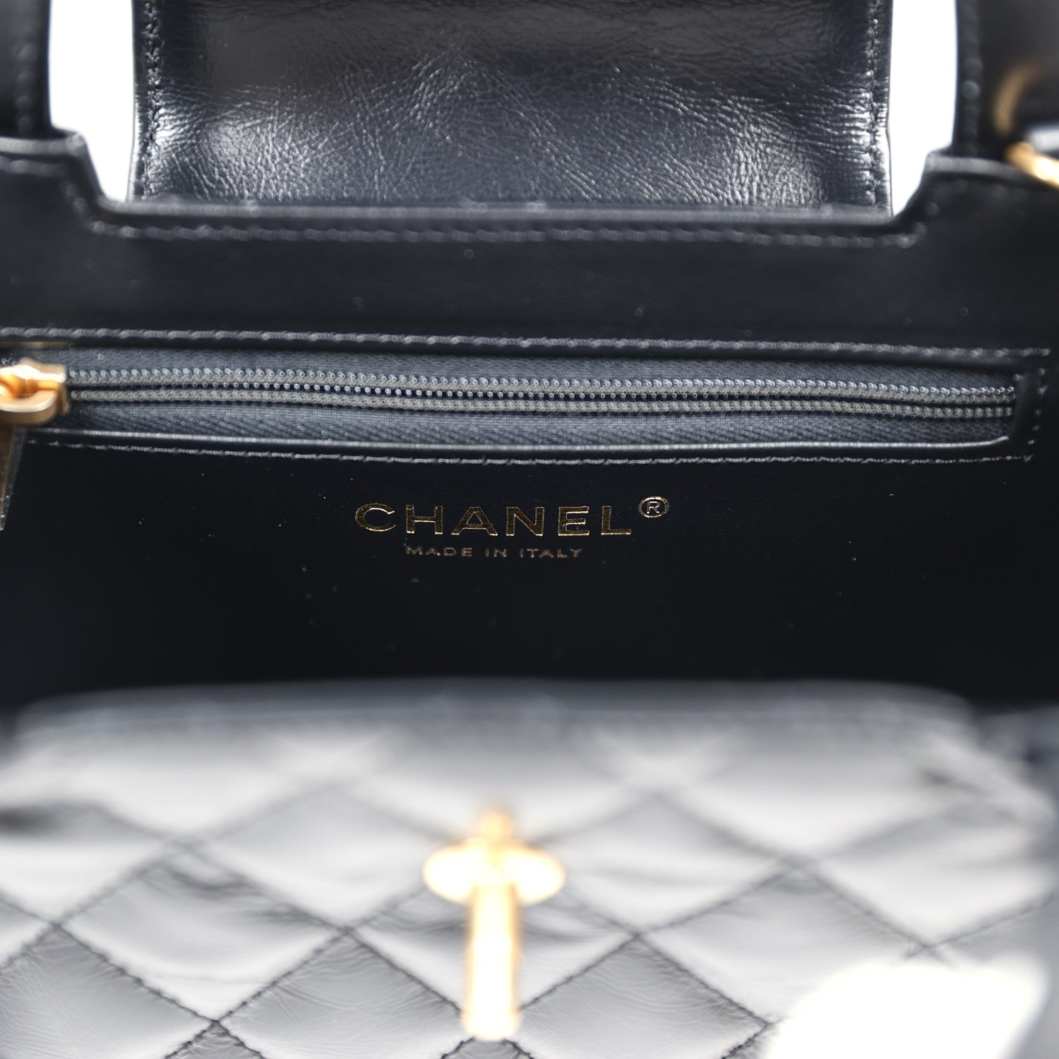 The interior is lined with black leather and has one zipper and one slip pocket.