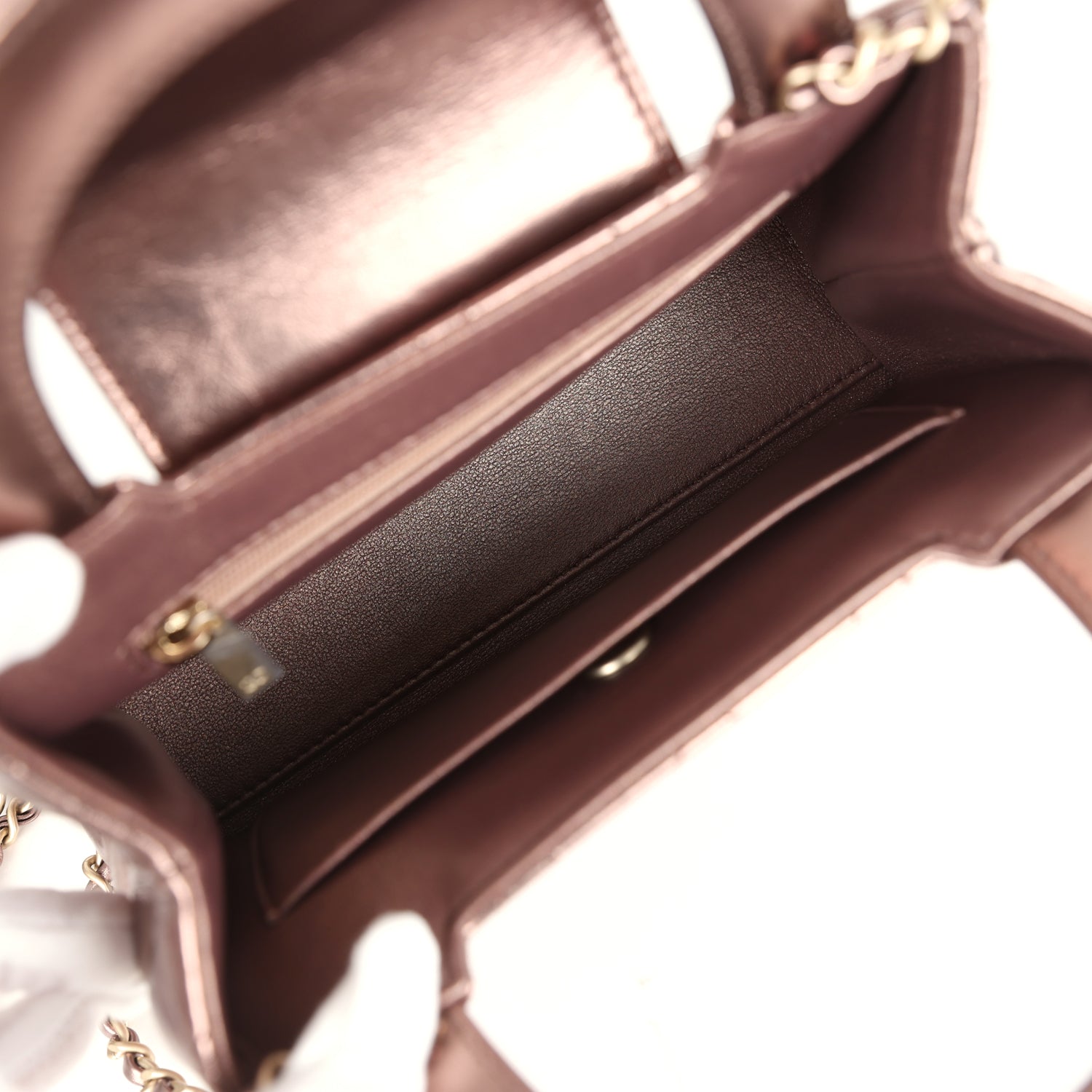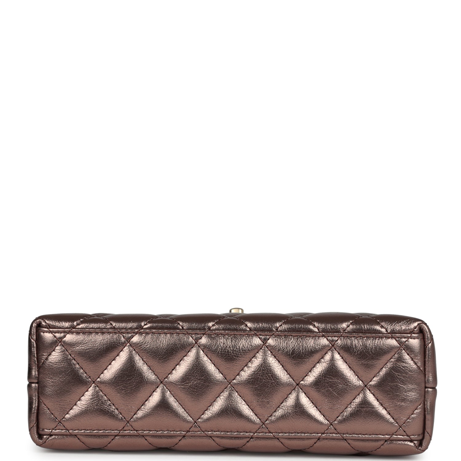 This small Kelly Shopper is in metallic bronze calfskin leather with brushed gold hardware. tonal stitching. two flat back top handles and a chain strap interwoven with leather. tab flap with CC turn-lock acts as a closure.