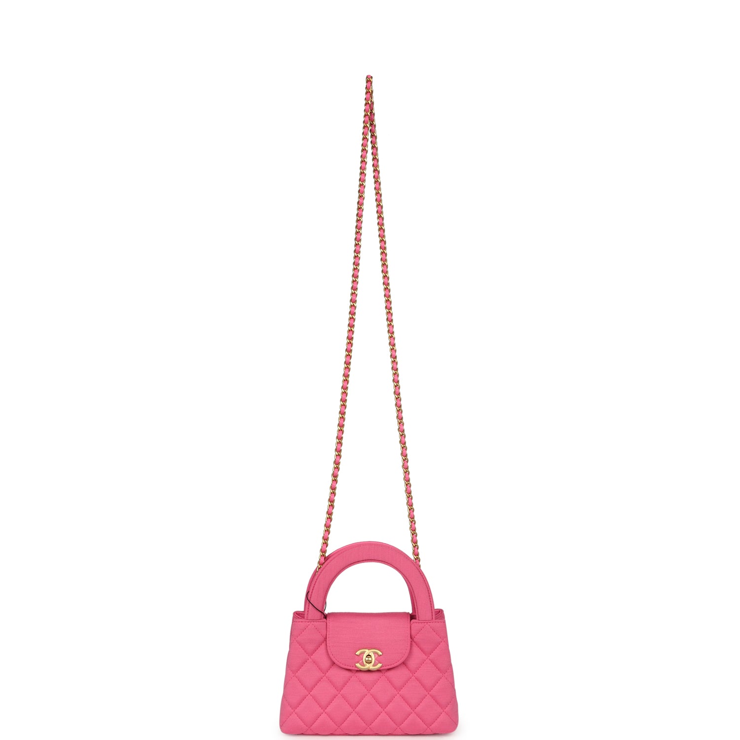 This Small Kelly is in dark pink jersey with brushed gold hardware. tonal stitching. two flat back top handles. interwoven brushed gold and pink leather shoulder strap. and the signature CC turnlock closure.