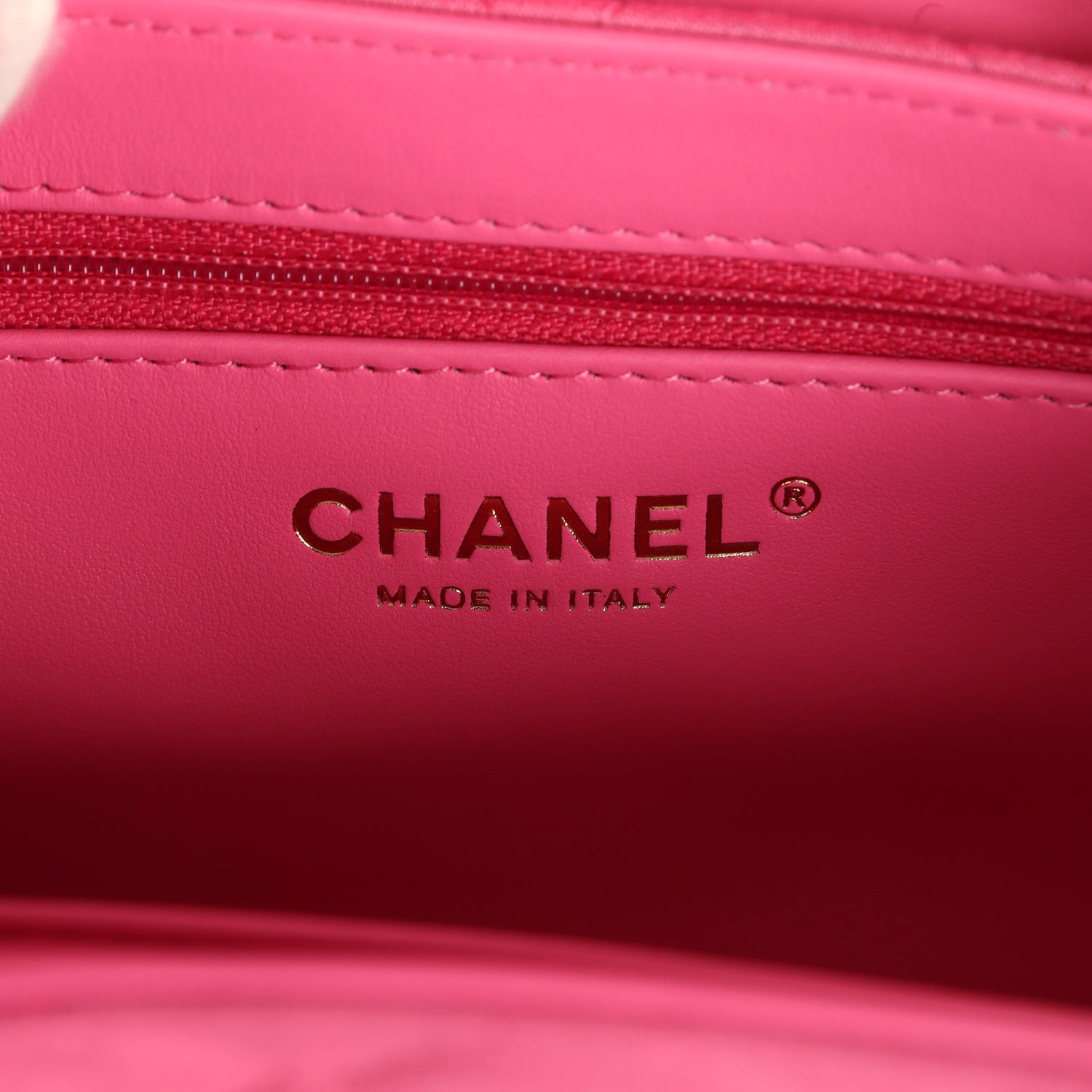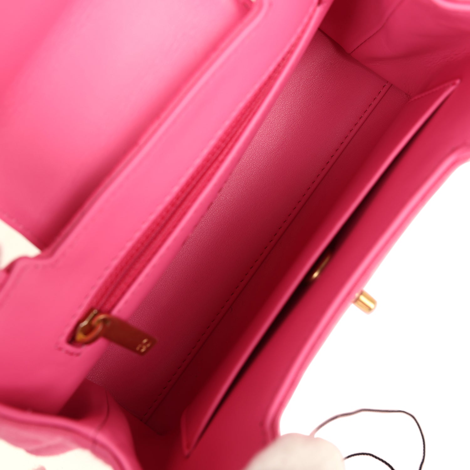 The interior is lined with dark pink leather and has one zipper and one slip pocket.