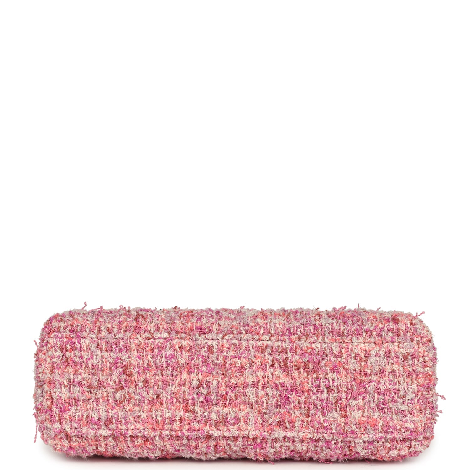 This Small Chanel Kelly is of pink. white and purple tweed with brushed gold hardware. tonal stitching. two flat back top handles and a chain strap interwoven with leather. tab flap with CC turnlock acts as a closure. zip pocket against back wall. slit pocket against front wall.