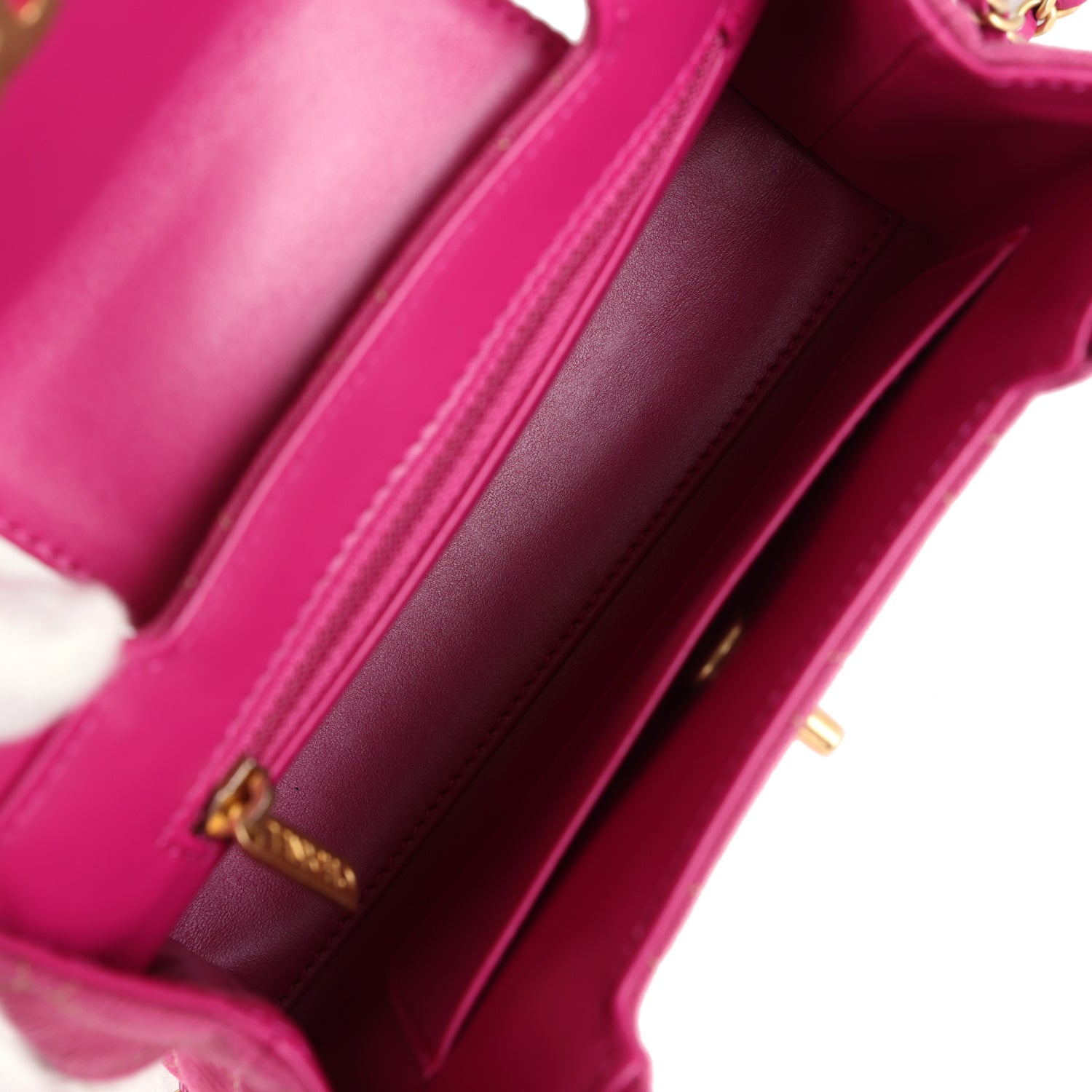 The interior is lined with fuchsia pink leather and has one zipper and one slip pocket.