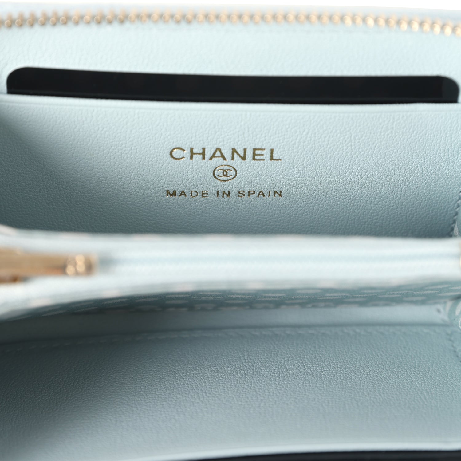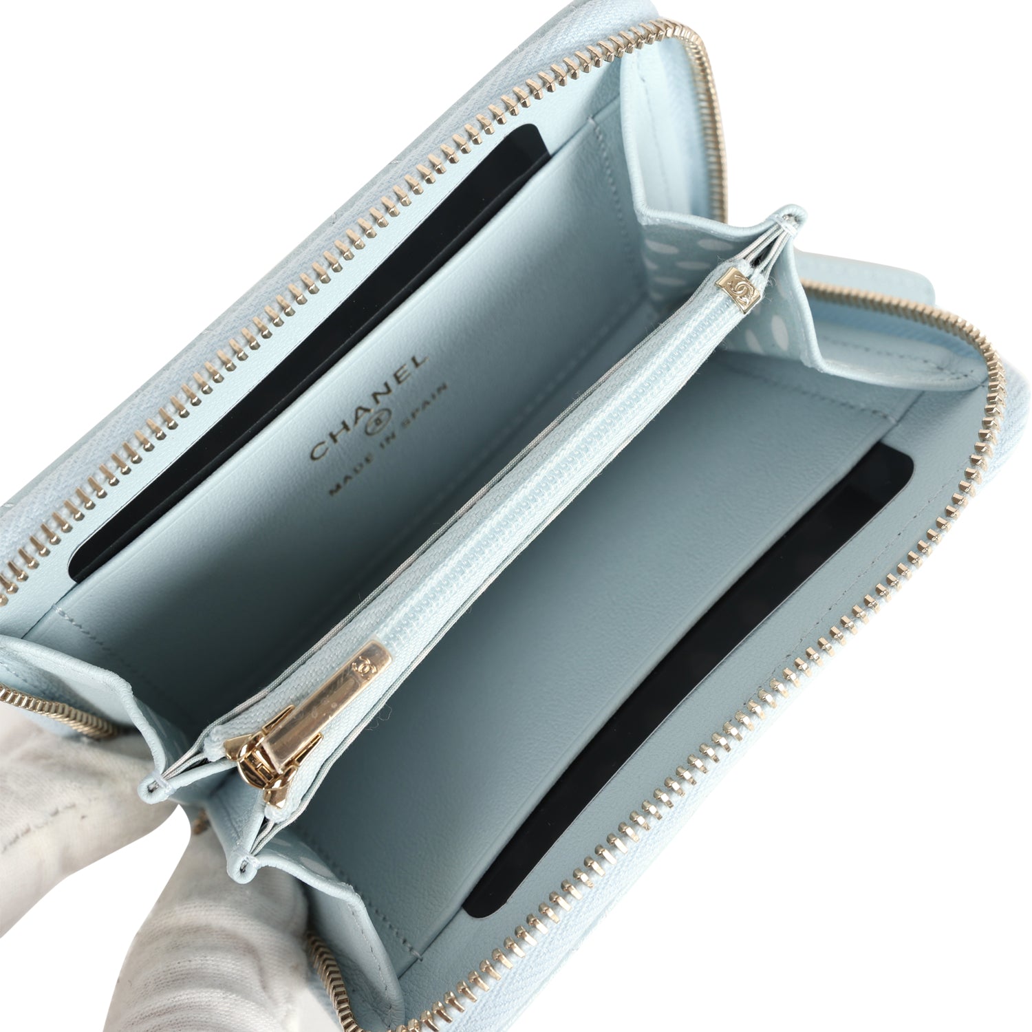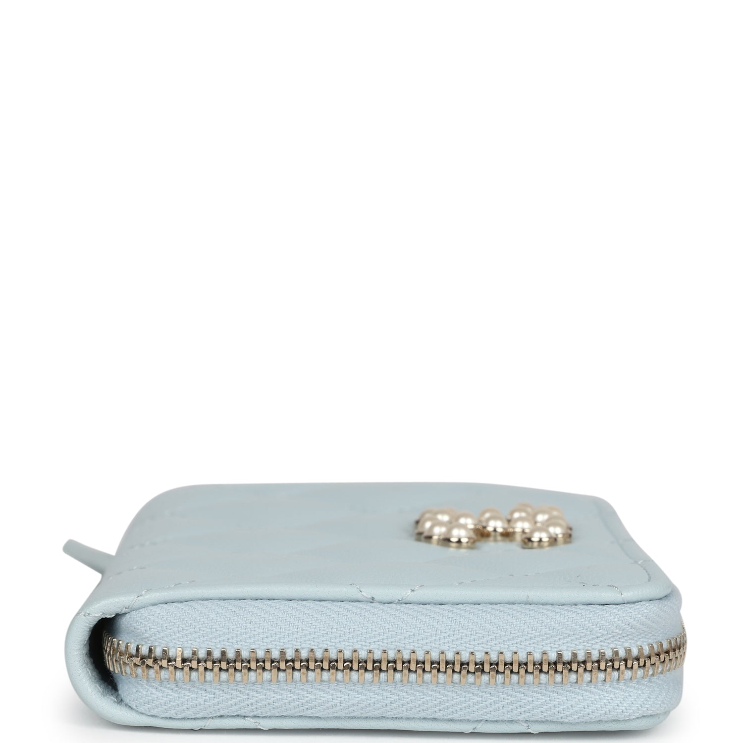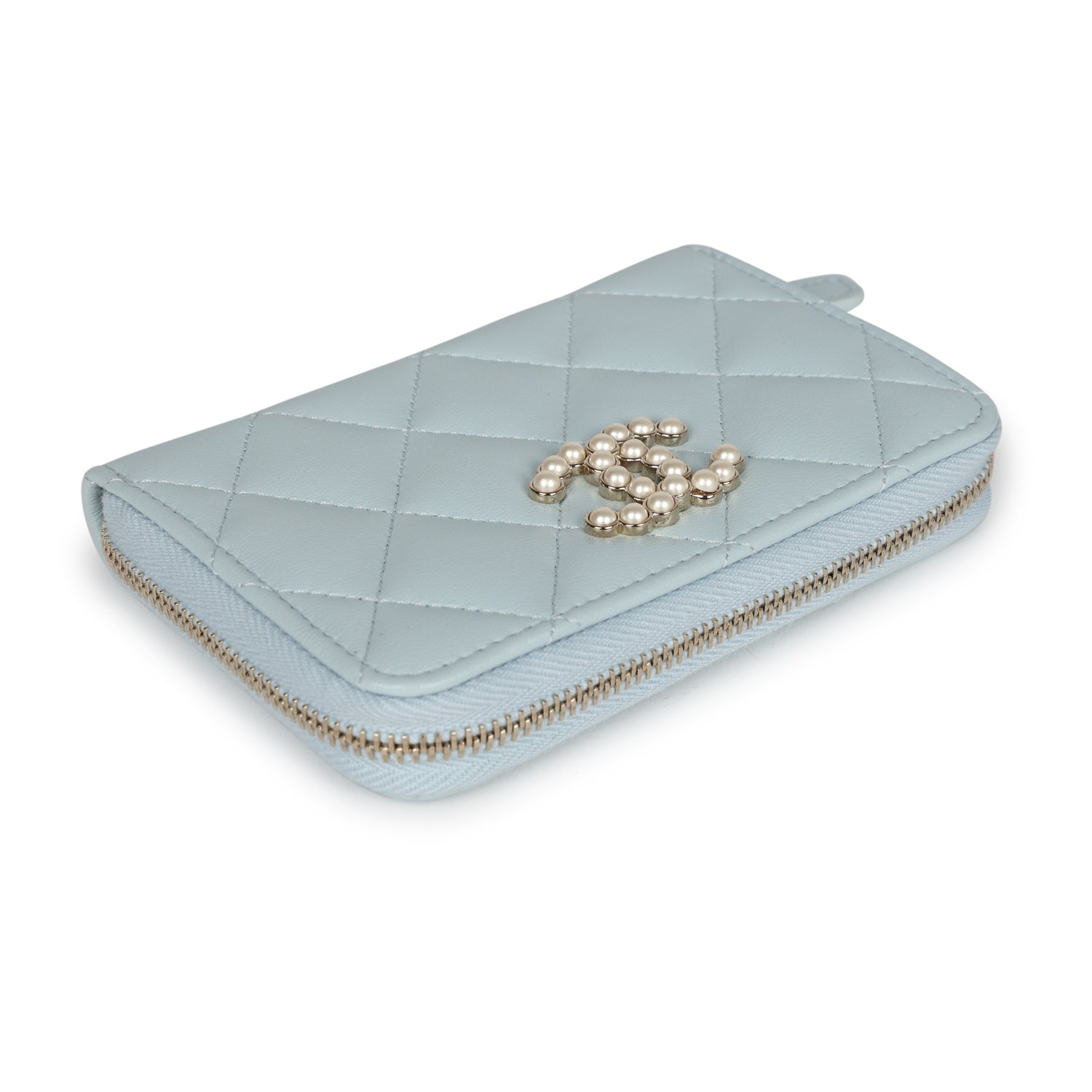 This Chanel Small Pearl Classic Zipped Coin Purse is in light blue lambskin leather with light gold tone hardware. featuring tonal stitching. signature diamond quilt. pearl beaded CC logo. and a zip around closure.