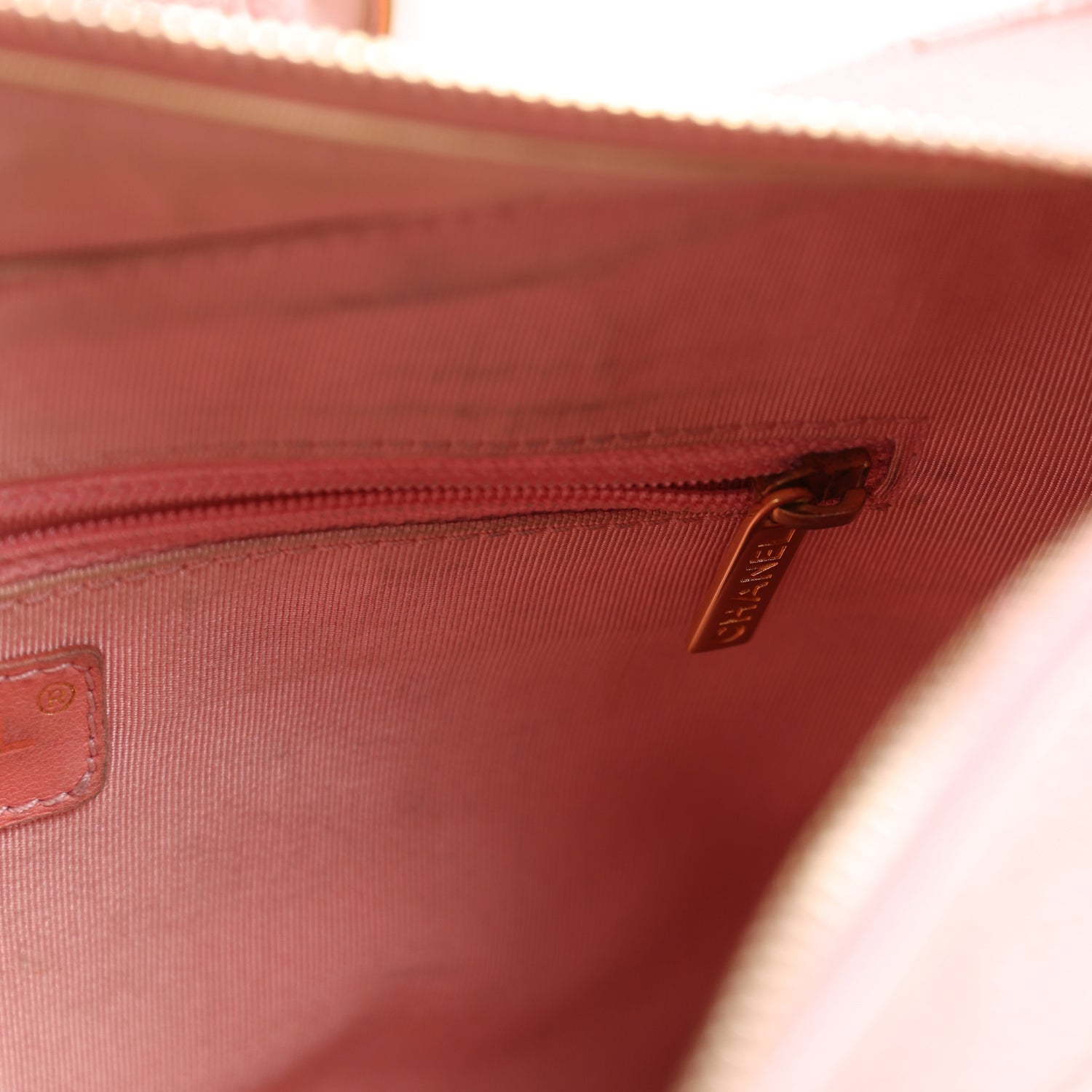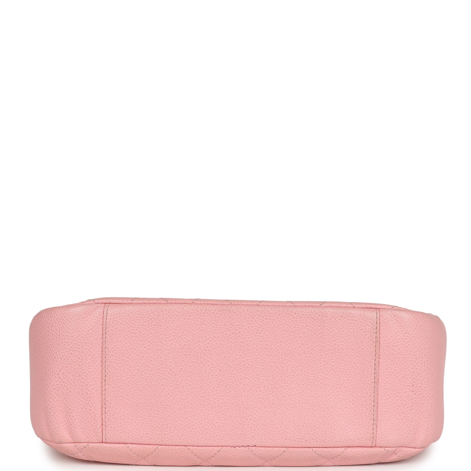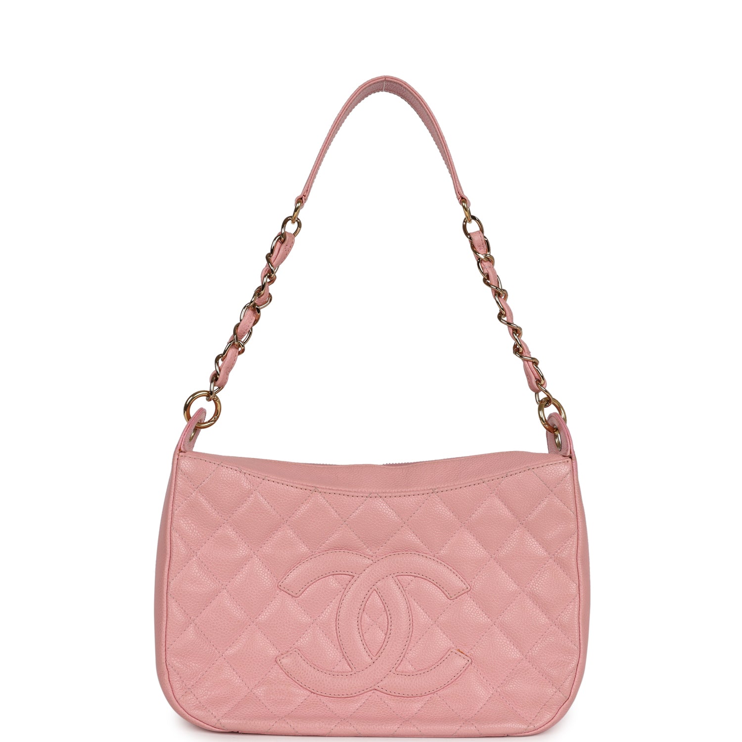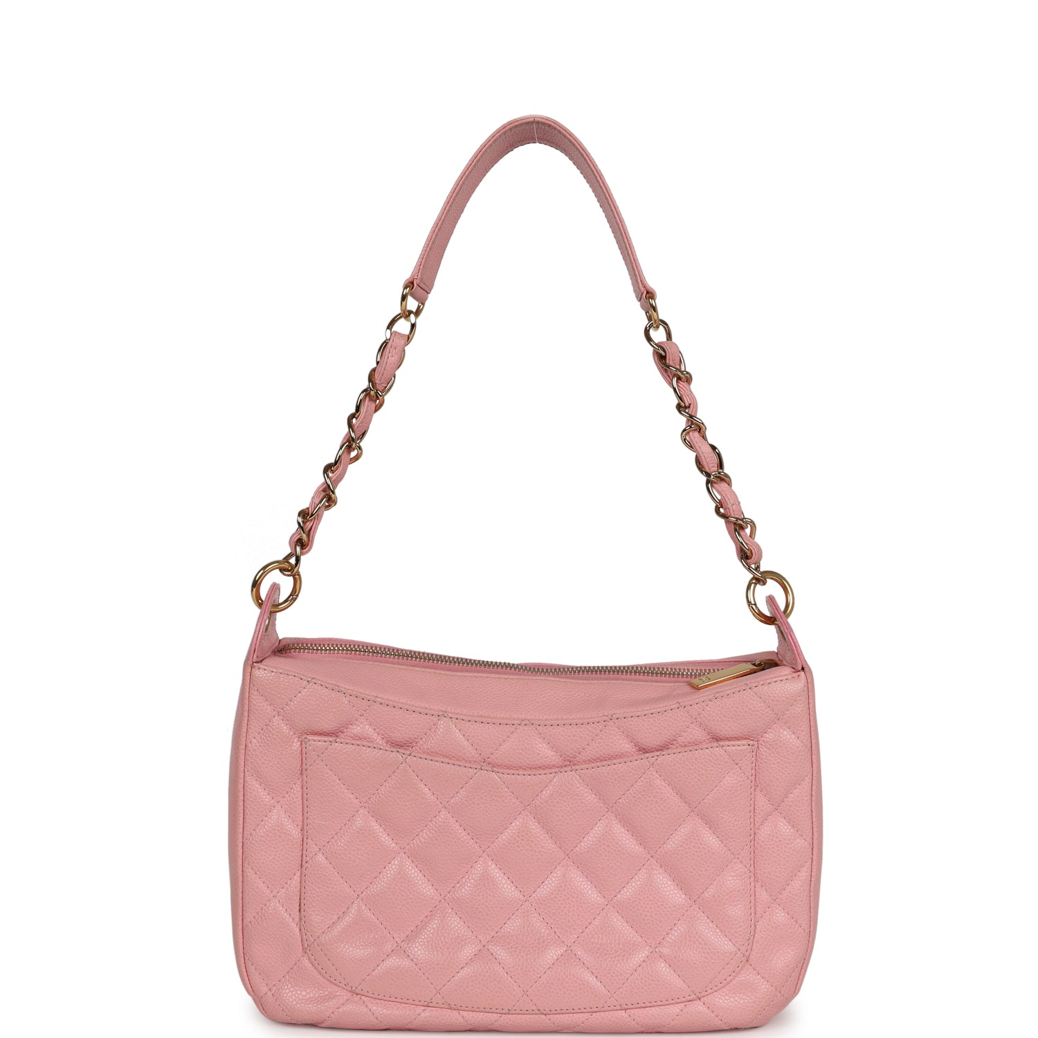 This Timeless Shoulder Bag is in pink caviar with gold hardware. tonal stitching. classic CC logo on front of bag. half moon back pocket on back of bag. strap is comprised of chainlink interwoven with leather and a leather shoulder pad.