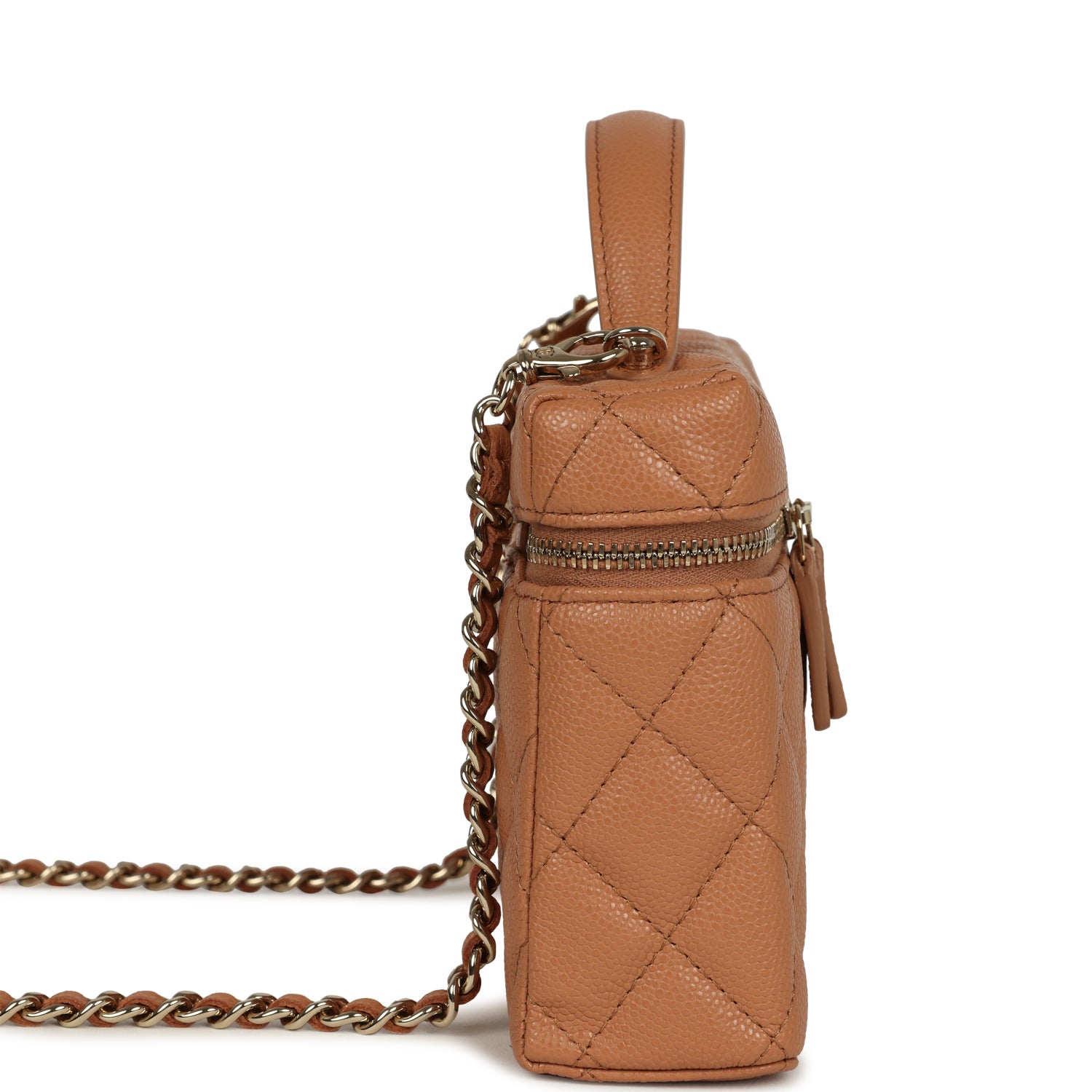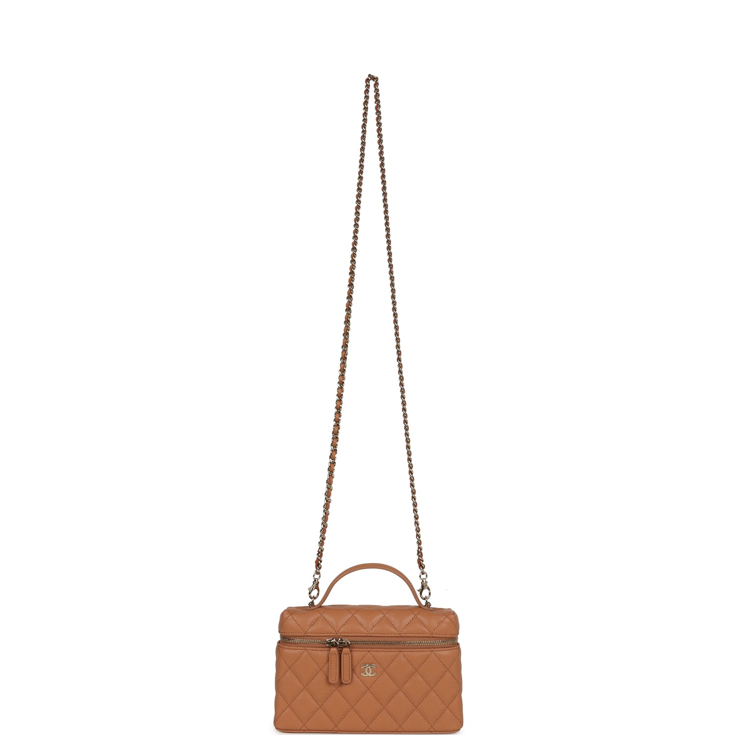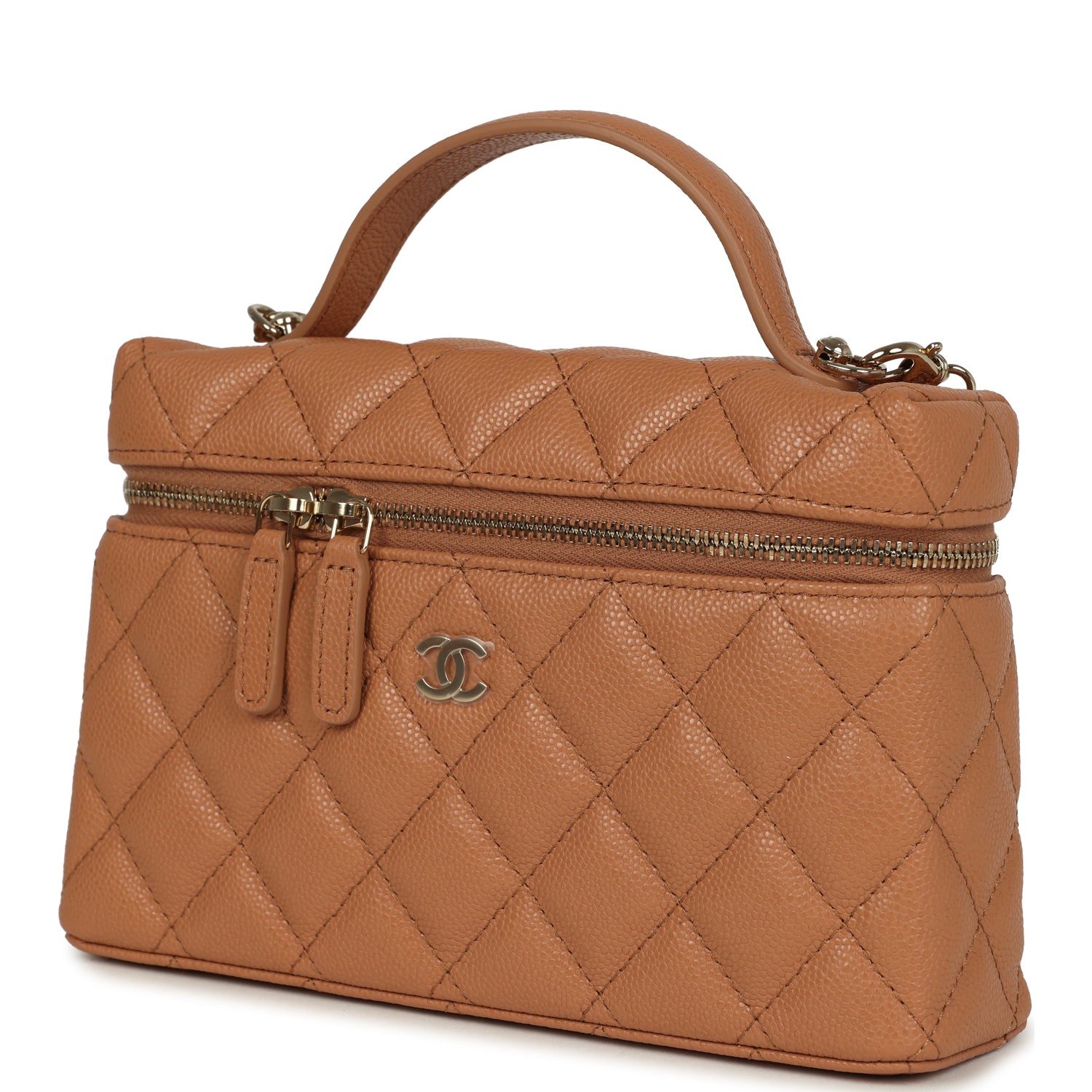 This Chanel Top Handle Long Vanity Case with Chain is in brown Quilted Shiny Caviar leather with light gold tone hardware. tonal stitching. CC logo on front. a top zip around closure with leather pulls. a single rolled top handle and a detachable interwoven light gold tone and brown leather crossbody/shoulder chain strap.