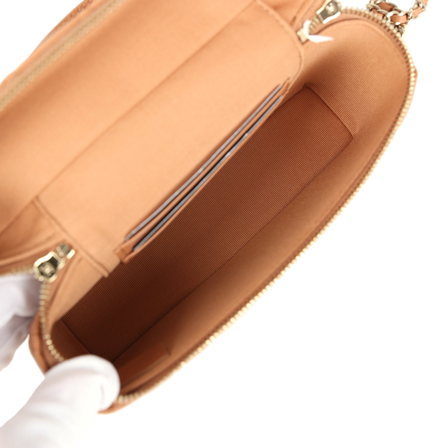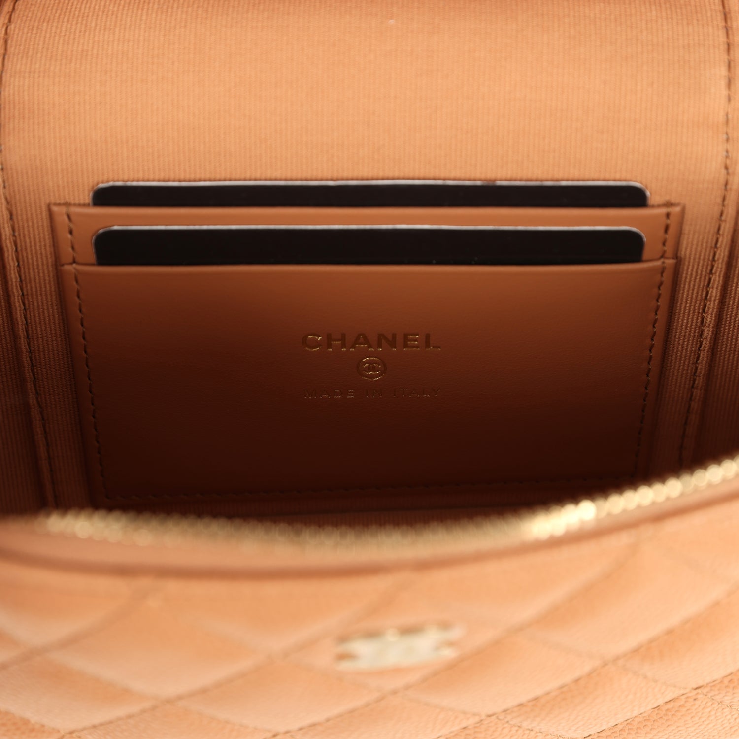 The interior is lined in brown grossgrain fabric and has two card slots on the rear wall.