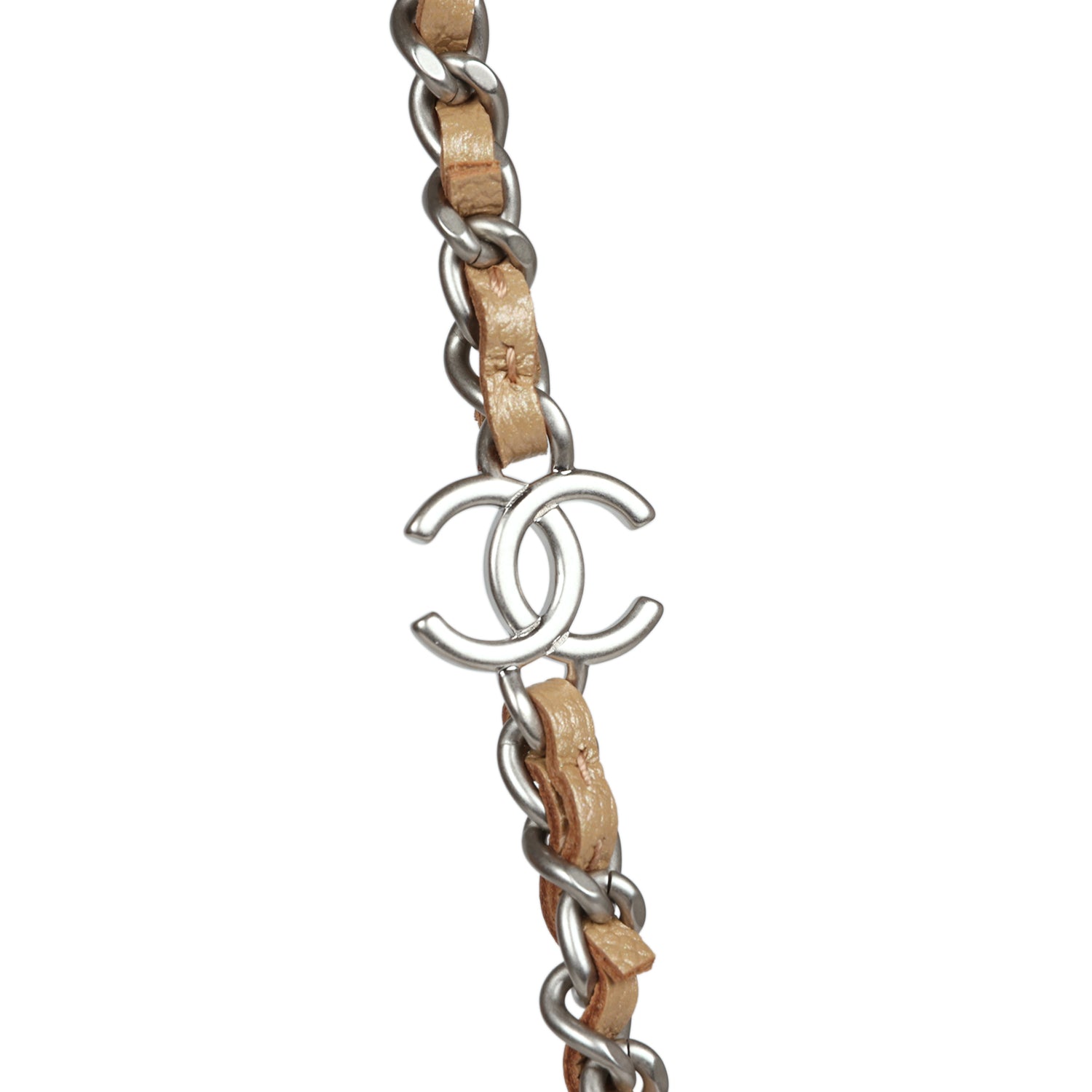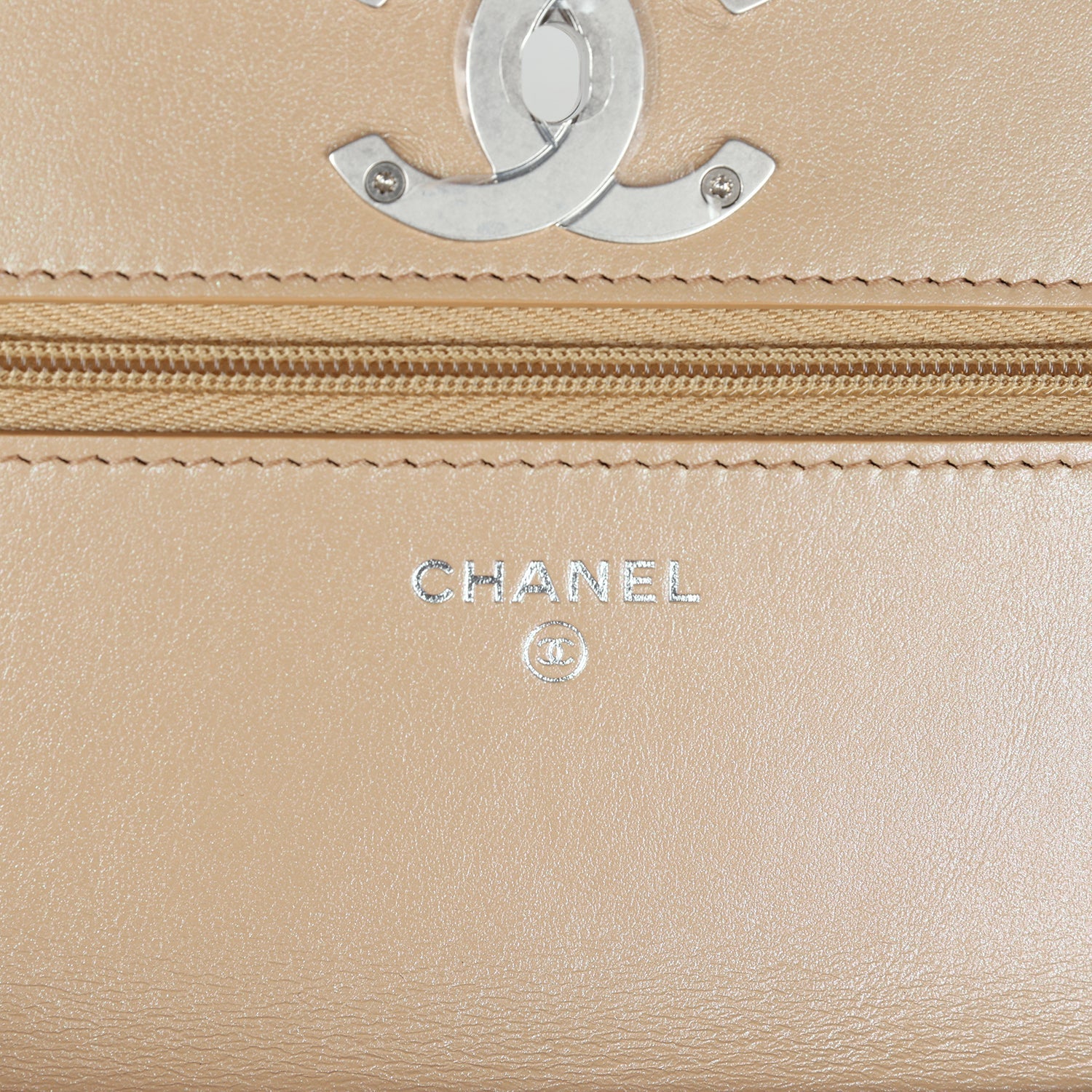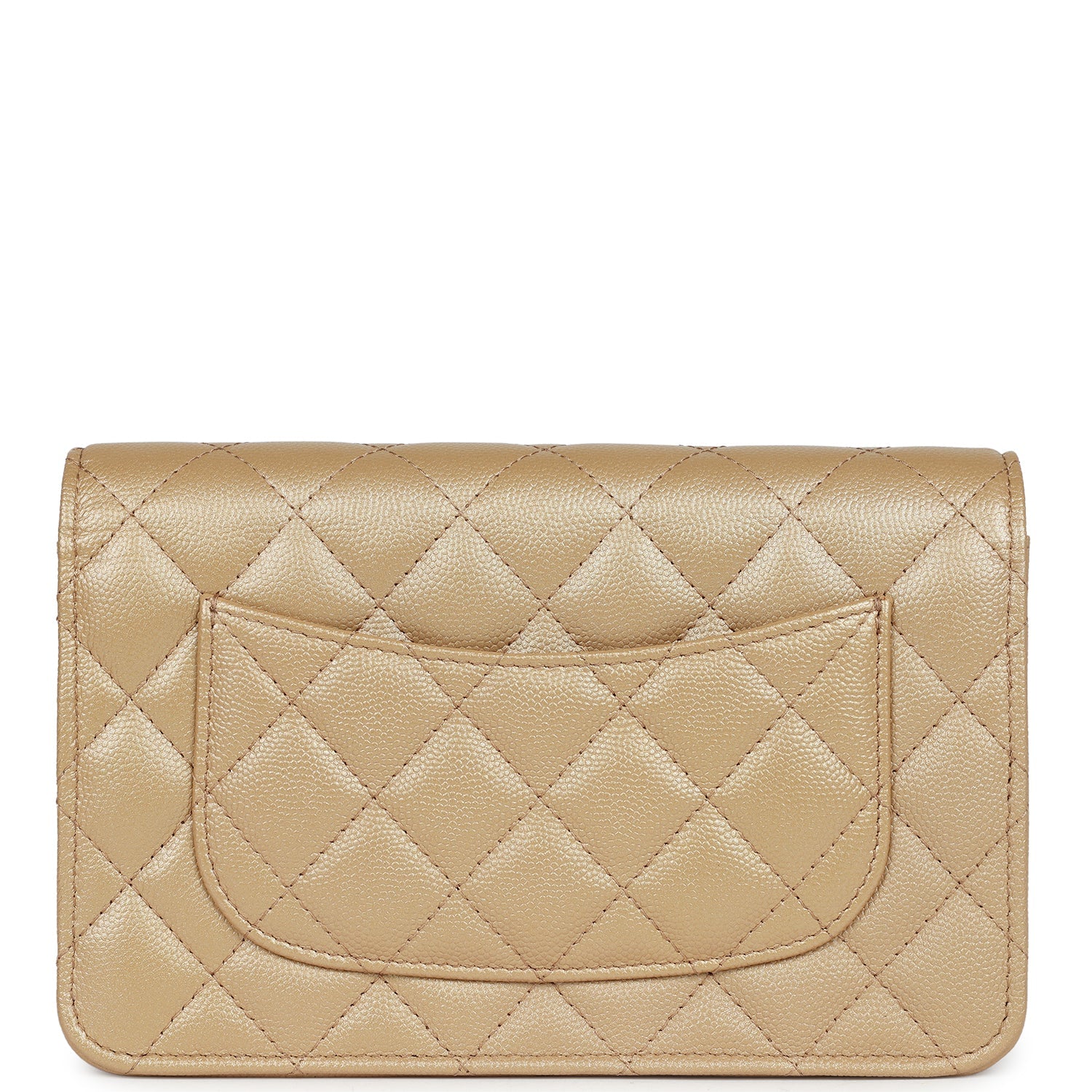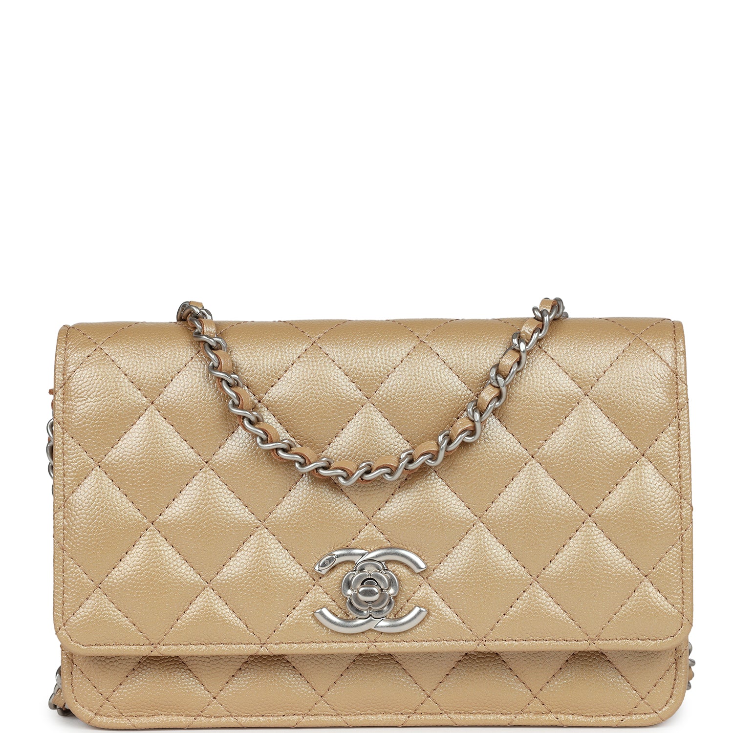 This Wallet on Chain is in Beige Iridescent Caviar with silver hardware. signature half moon exterior back pocket. back pocket as well as a tonal chain-link crossbody strap/shoulder strap with a matte silver CC and a camellia flower charm. and front CC gold tone button closure.