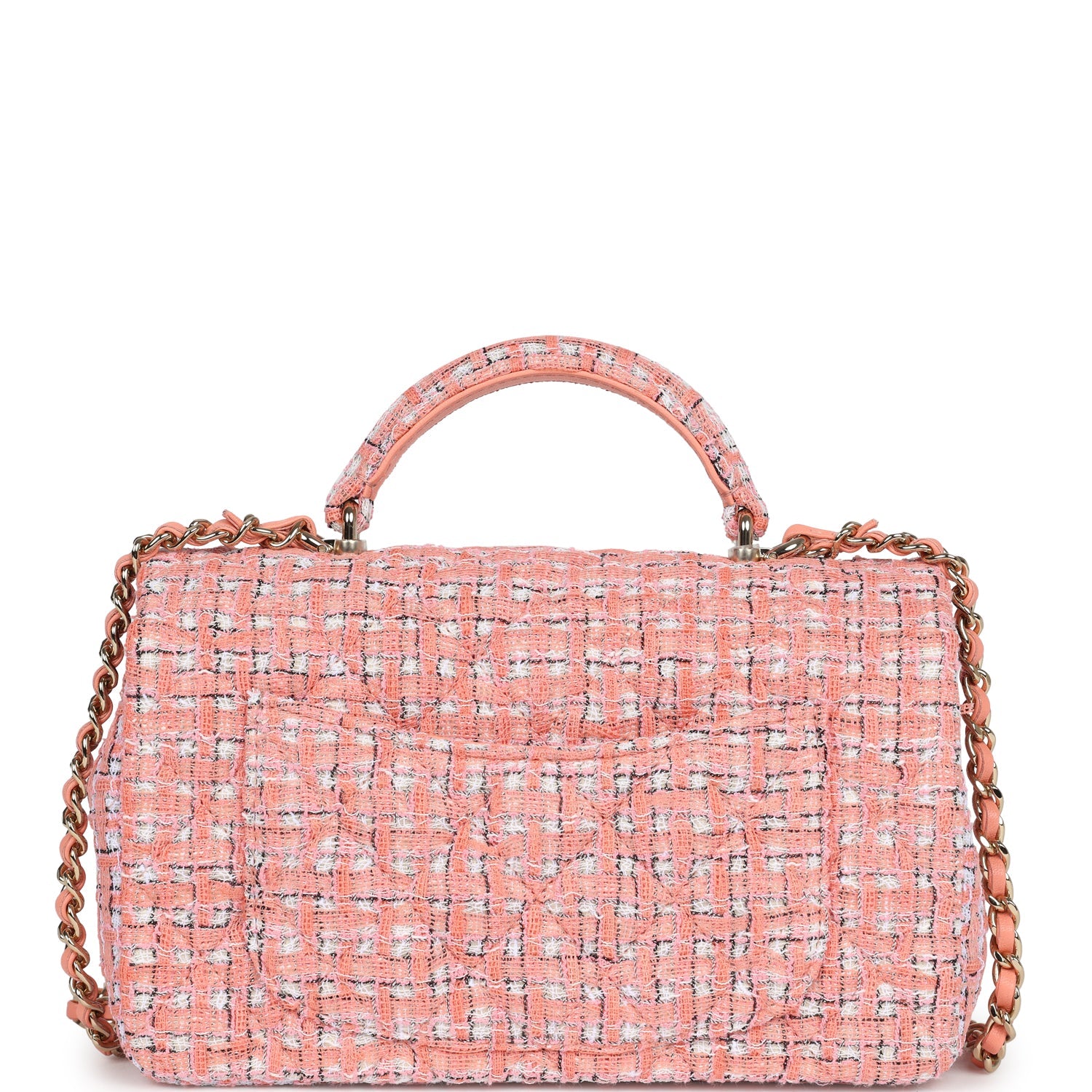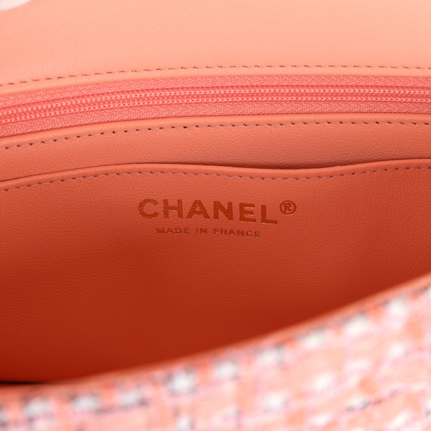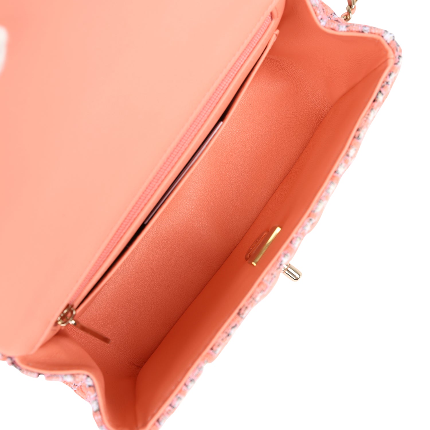 This Chanel mini rectangular top handle flap bag is in coral. white and black tweed with light gold hardware and has a front flap with signature CC turnlock closure. rear half moon pocket. a tweed top handle and single interwoven coral leather and light gold tone chain link shoulder strap.