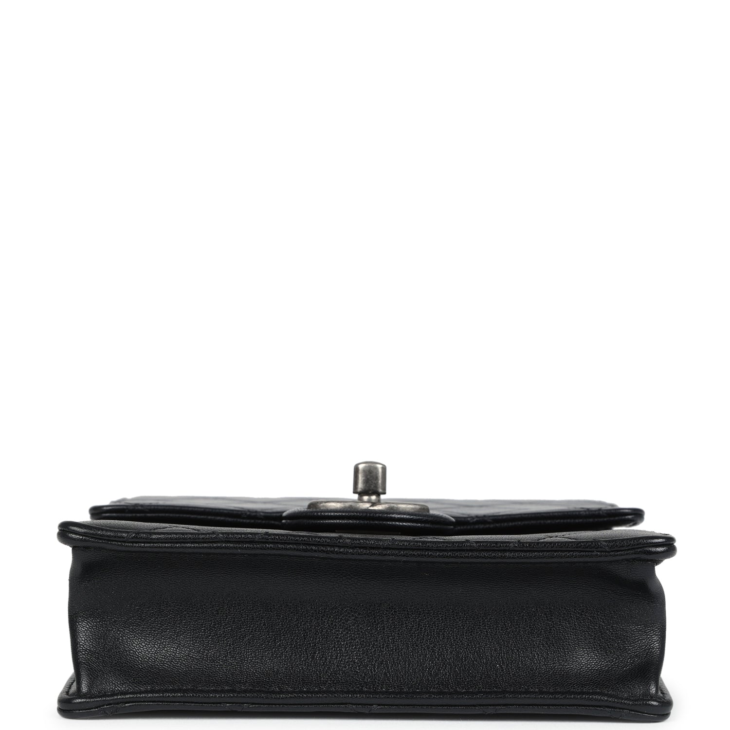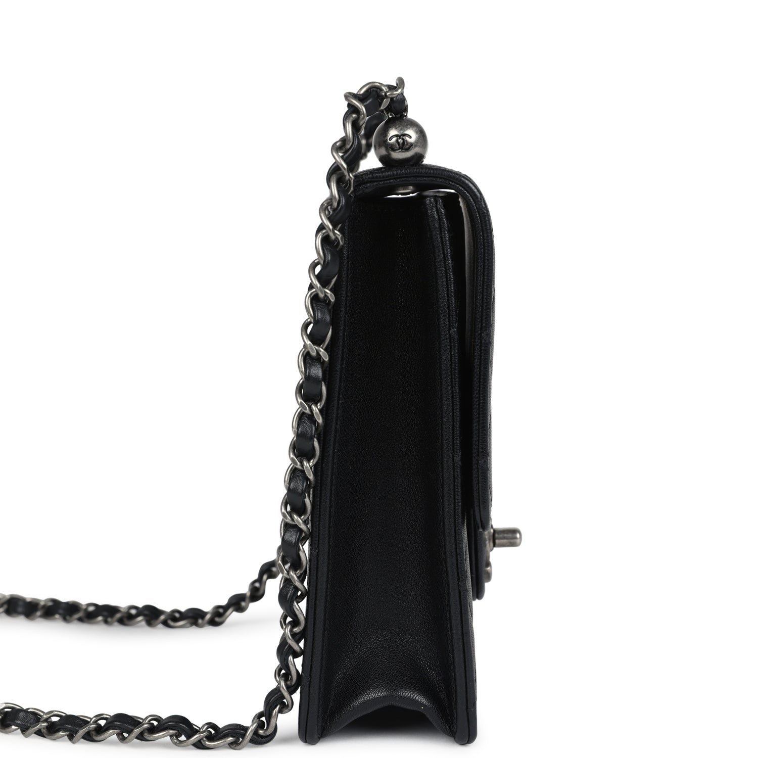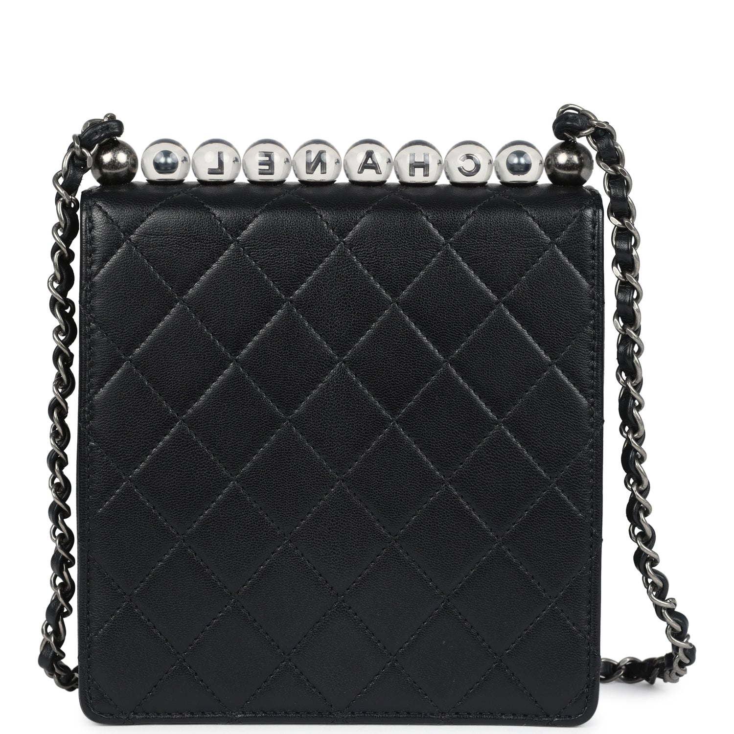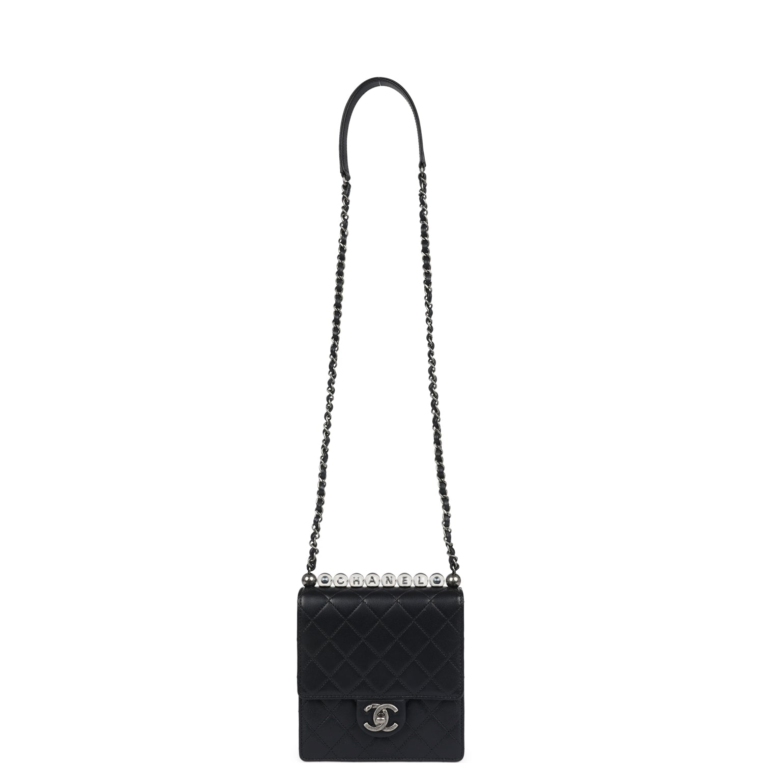 This Chanel Chic Pearls Flap Bag is of black calfskin leather with aged ruthenium hardware and features Chanel's signature CC turnlock closure. clear acrylic imitation pearls across the top. and an interwoven aged ruthenium chain link with black leather shoulder strap.
