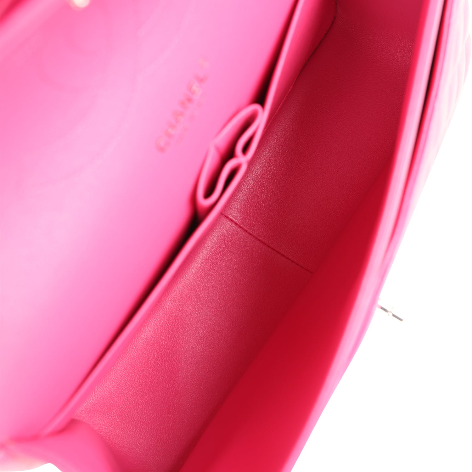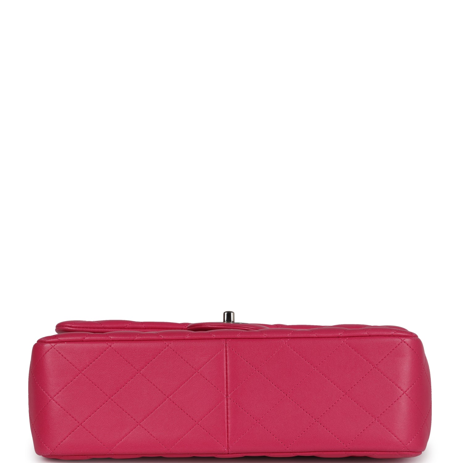 This Chanel Jumbo Classic Double Flap bag is in pink lambskin leather with silver tone hardware and features a front flap with signature CC turnlock closure. half moon back pocket. and adjustable interwoven silver tone chainlink and pink leather shoulder strap.