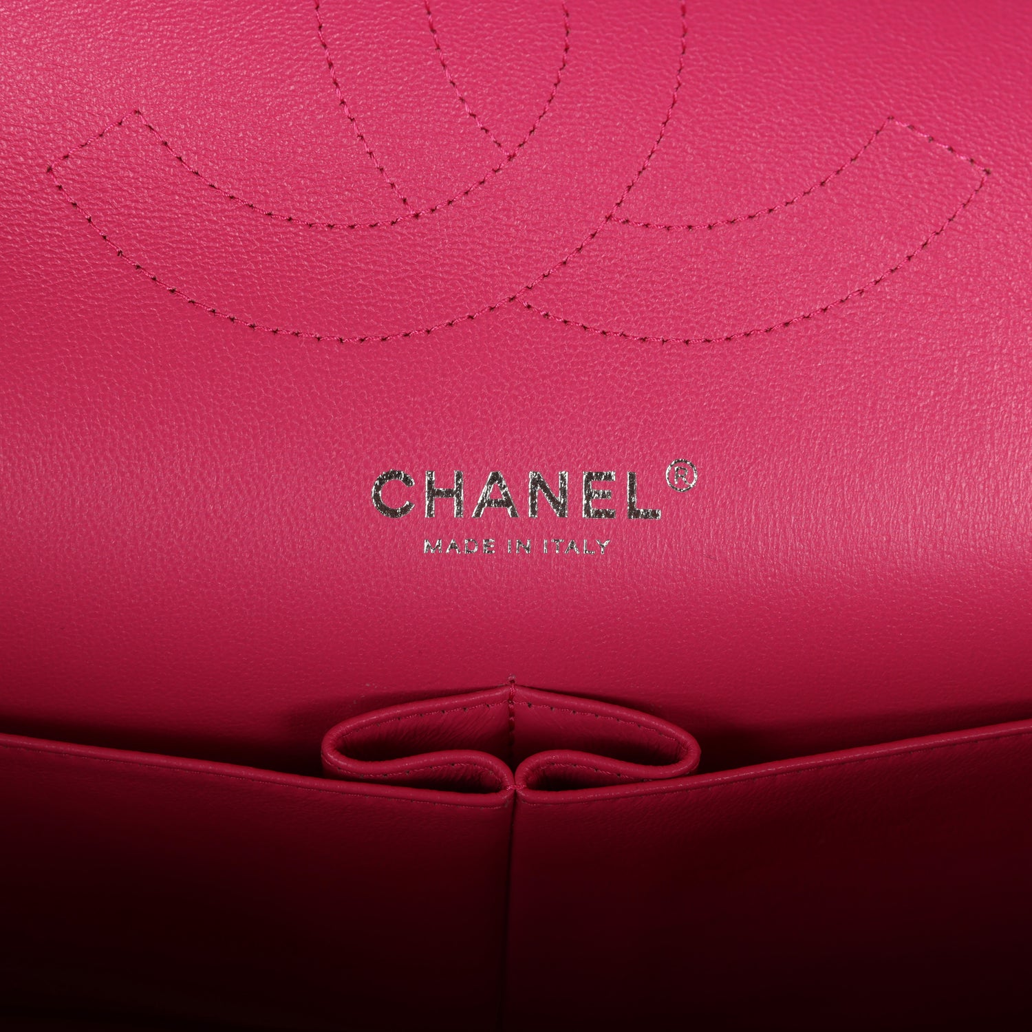 The interior is lined in pink leather with a "love letter" zipper compartment under the first flap. an "outer" slit pocket under the second flap. and an interior compartment with two open pockets separated by a "lipstick" compartment.