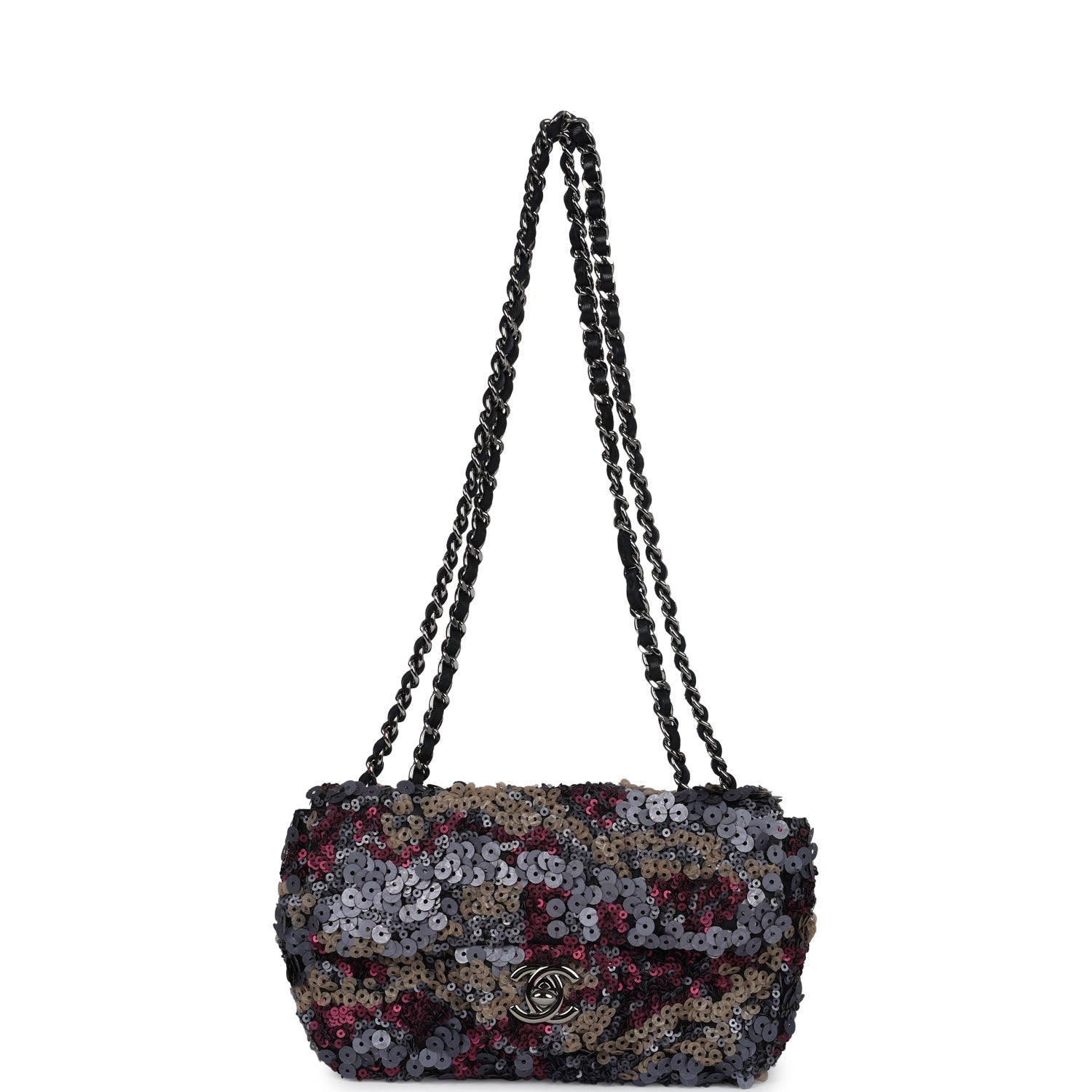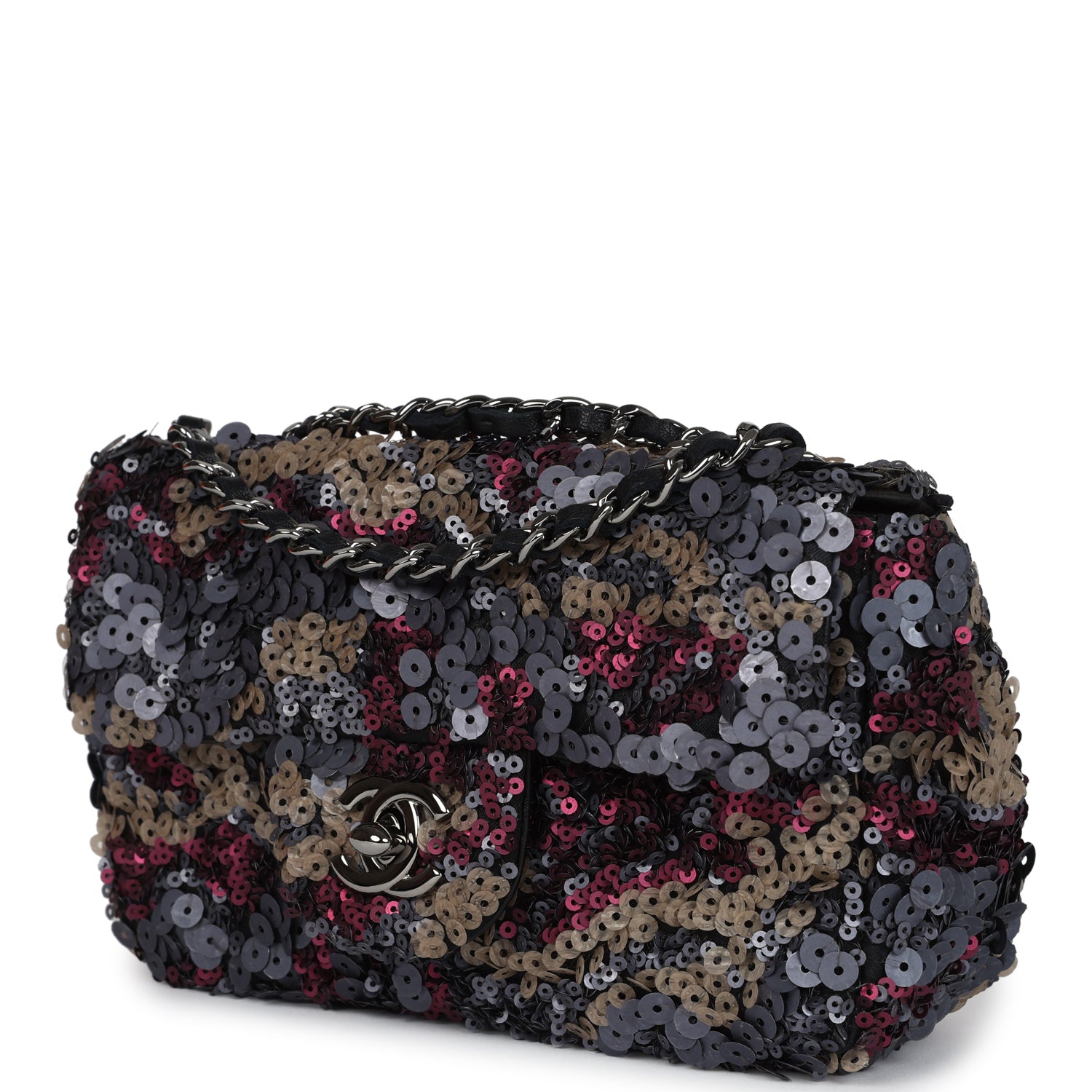 This limited edition Chanel Extra Mini Single Flap bag is of dark grey. gold. and burgundy sequin material with ruthenium hardware. a front flap with CC turnlock closure. and an interwoven ruthenium chain link and black leather crossbody/shoulder strap.