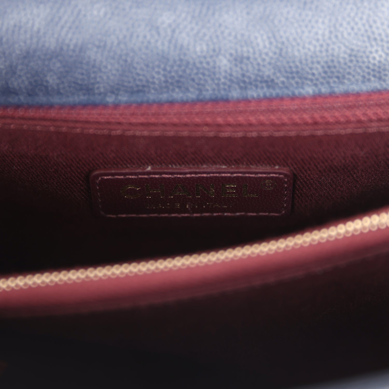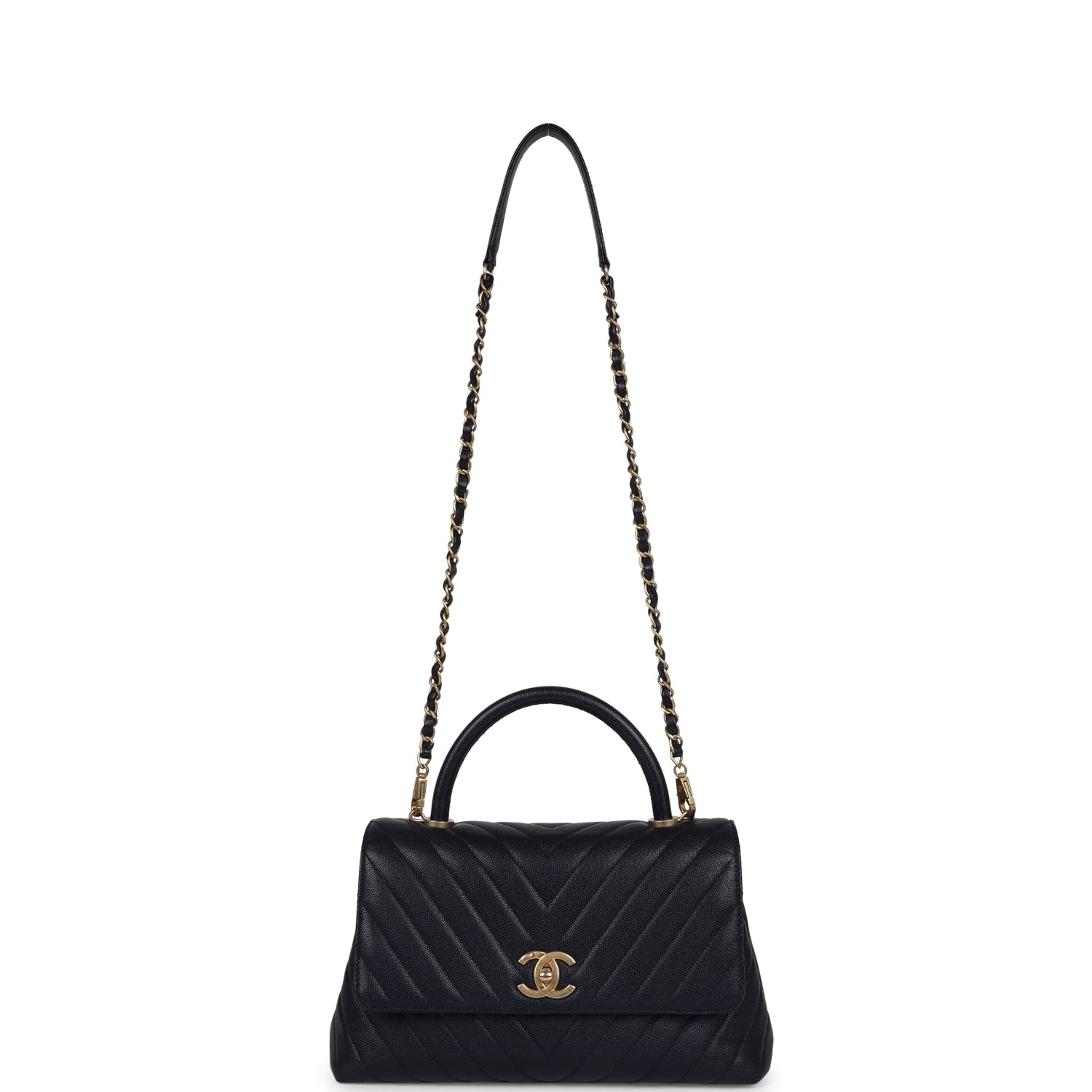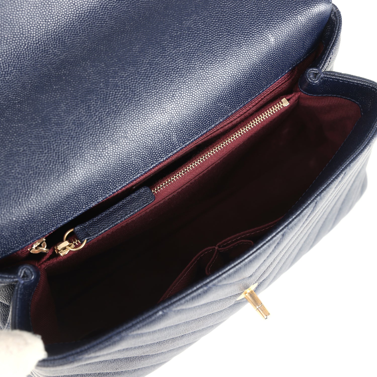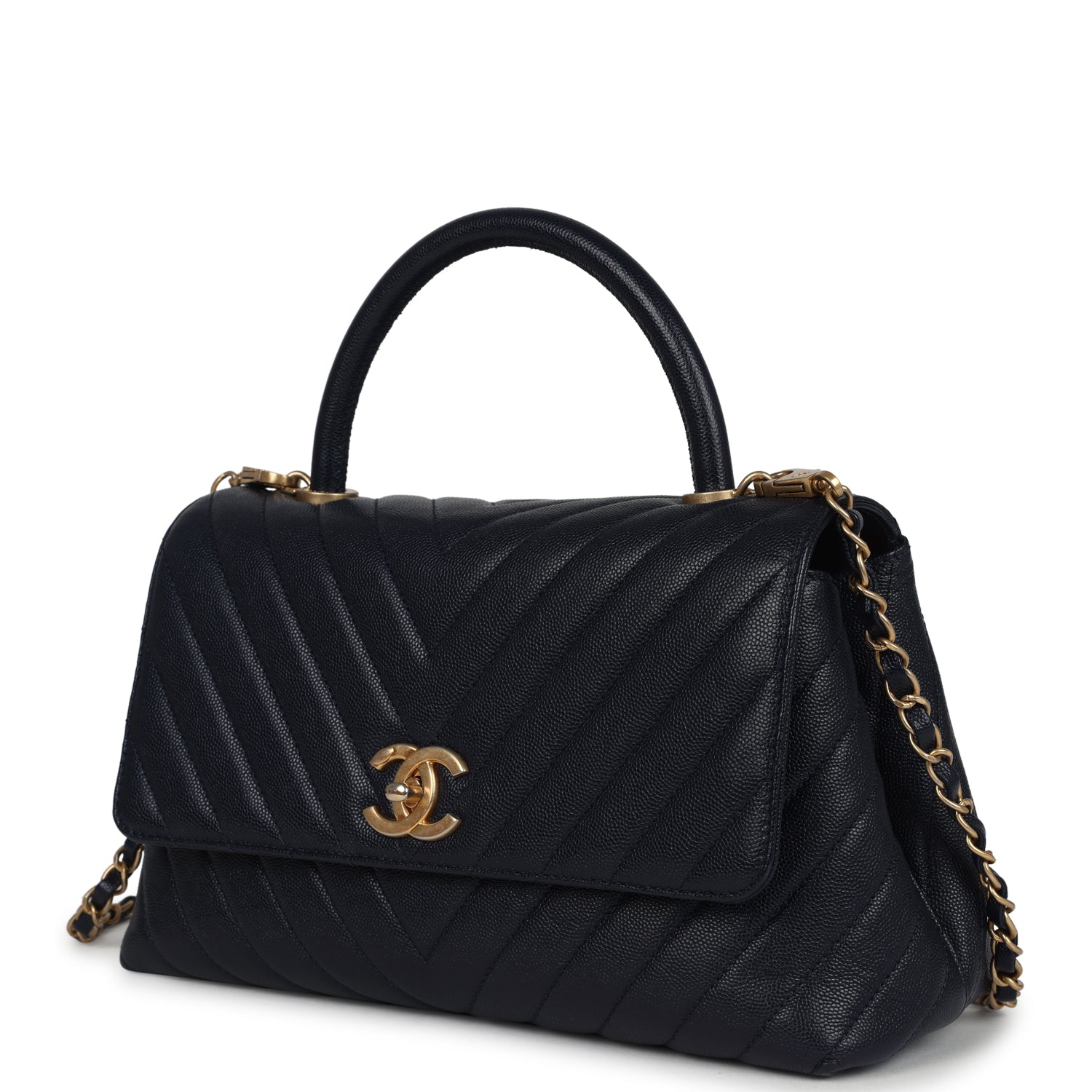 This Medium Chevron Coco Top Handle Flap bag is of navy blue caviar leather with antique gold hardware and has the signature chevron quilting in a trapezoidal shape with signature CC interlocking closure. half moon exterior pocket. a leather top handle with antique gold chainlink. and a single removable interwoven antique gold and navy leather chainlink shoulder strap.