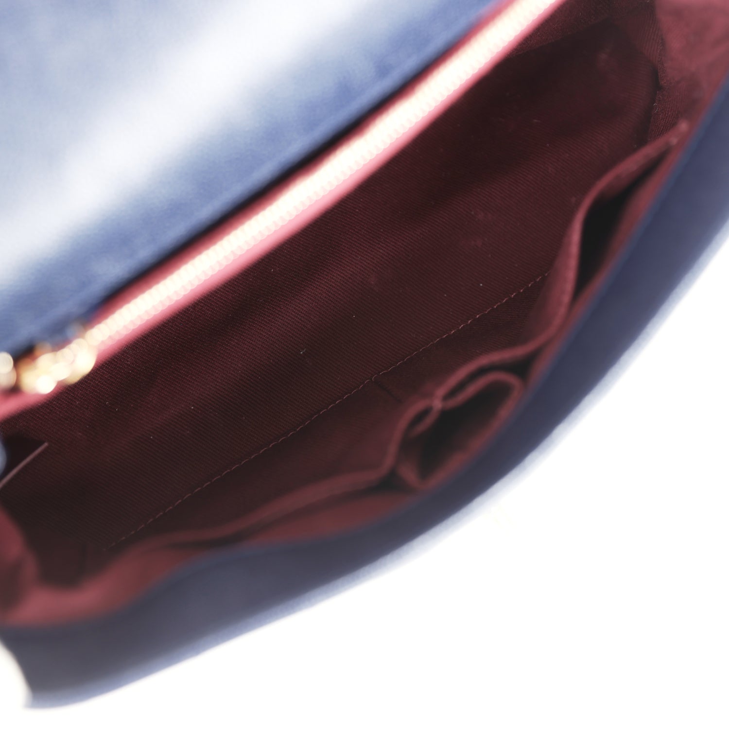 The interior is lined in burgundy grossgrain fabric and has two main open compartments. one zip pocket on the rear wall. two small slip pockets on the front wall. and one center divide zip pocket.