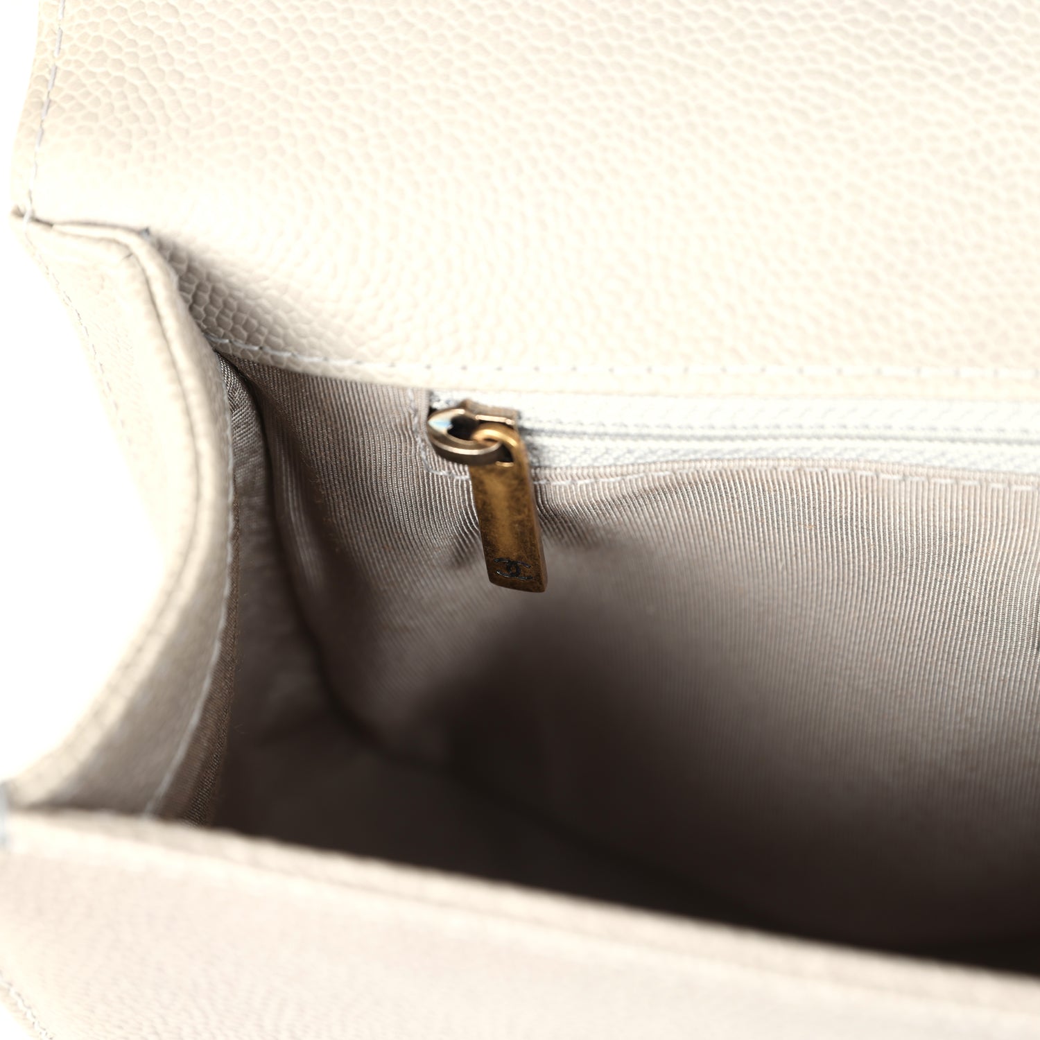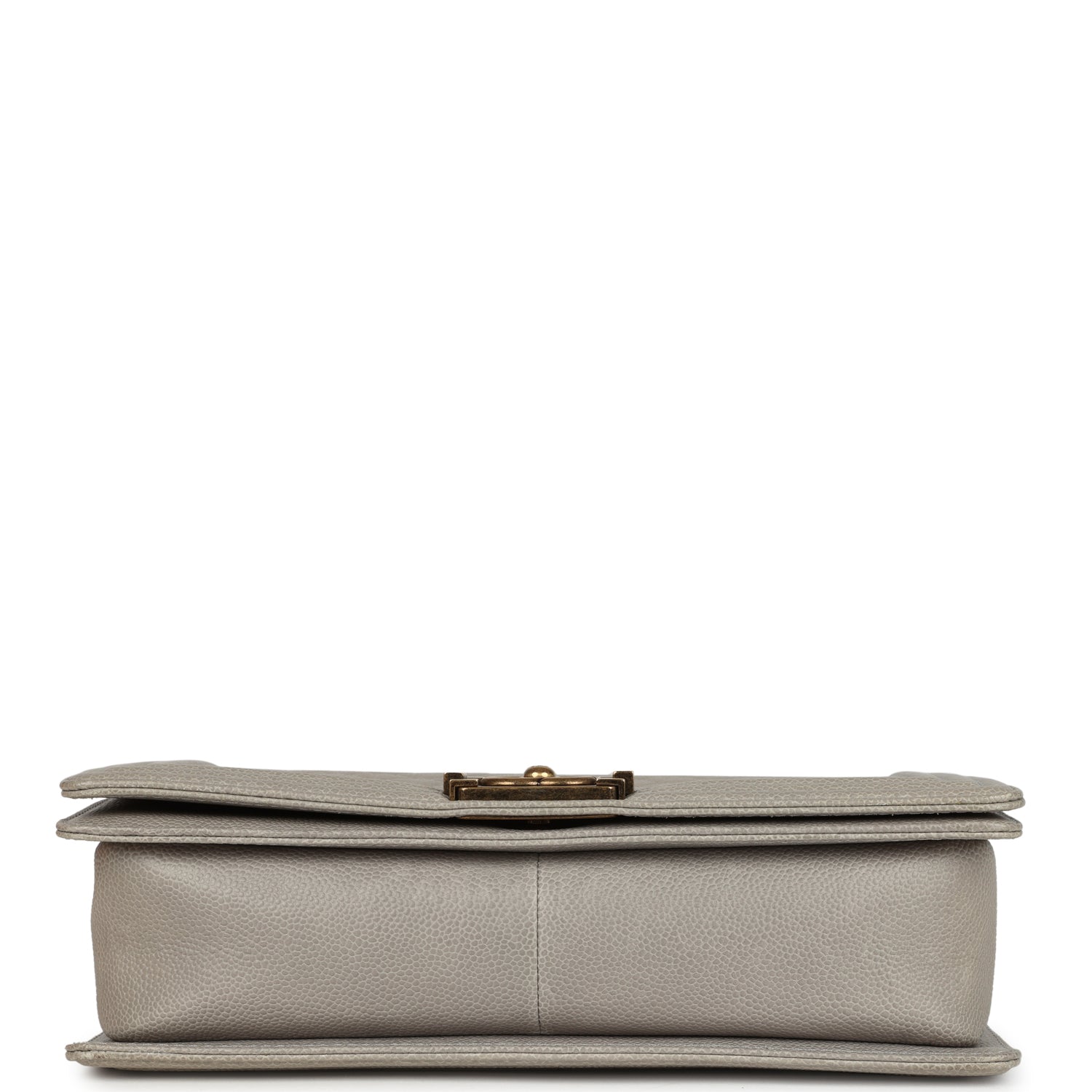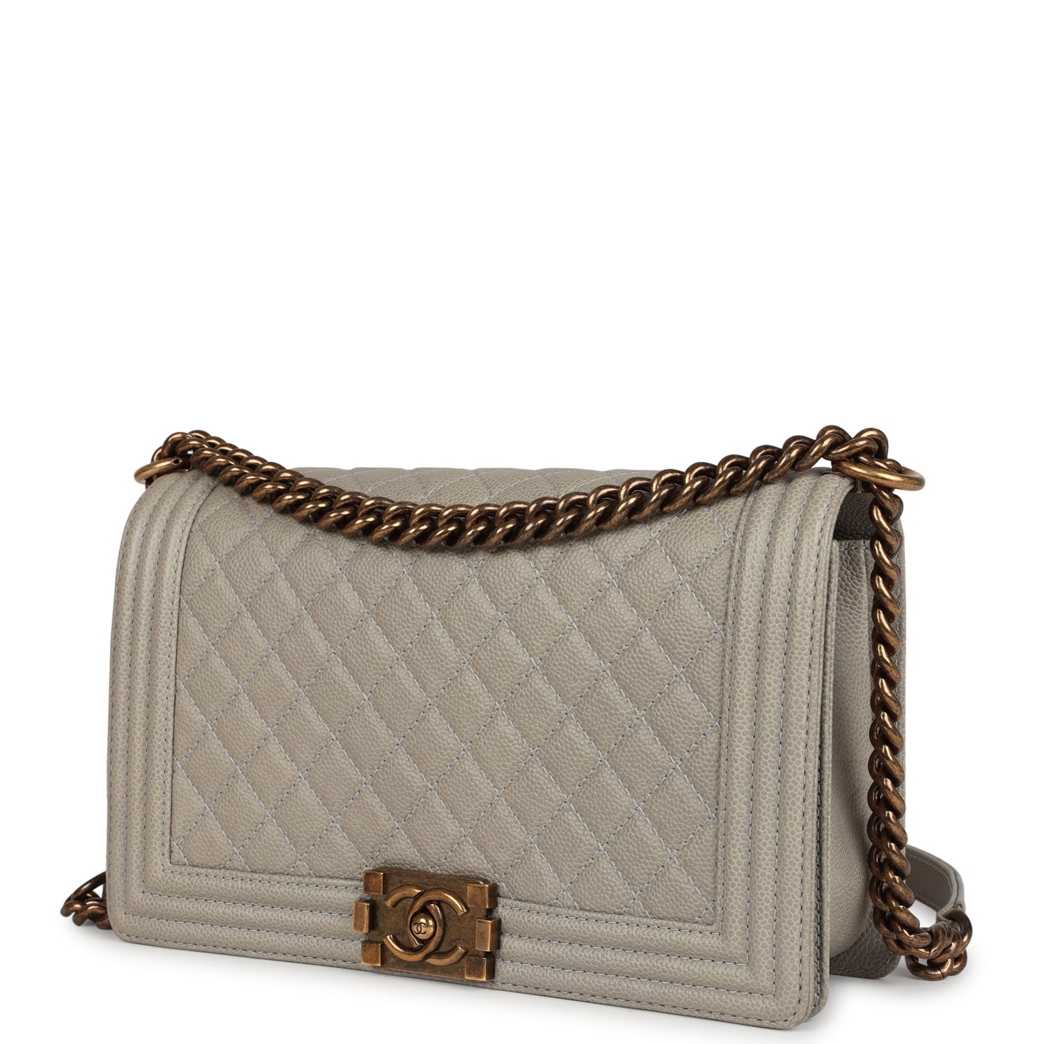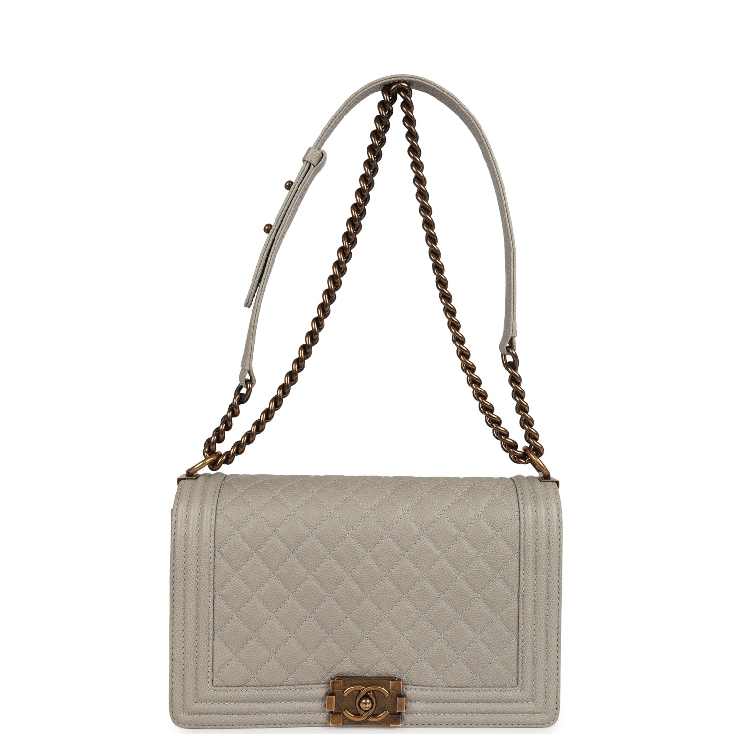 This Chanel New Medium Boy Bag is in grey caviar leather with antique gold hardware. featuring signature diamond quilt leather. front flap with Le Boy CC push closure. caviar leather trim. and Antique gold chainlink and leather shoulder strap.