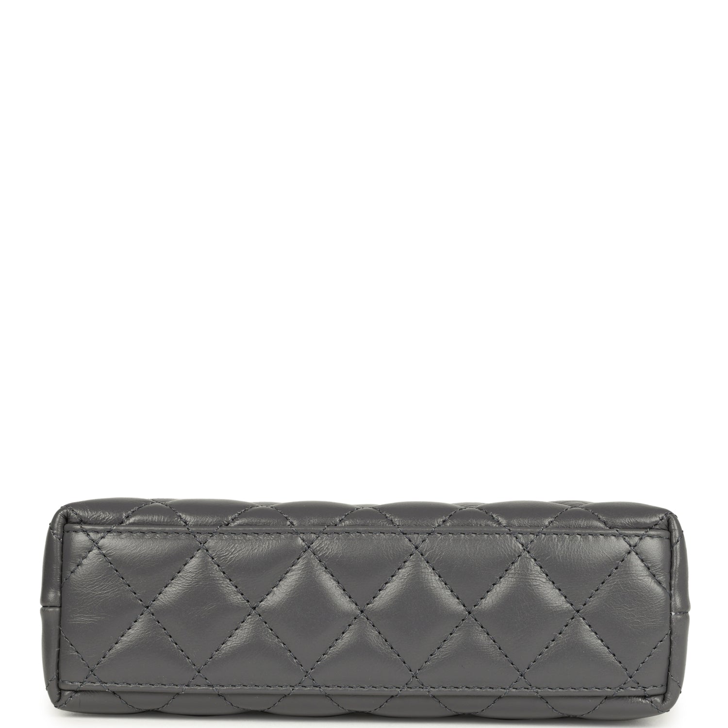This small Kelly is in dark grey shiny aged calfskin with brushed gold hardware. tonal stitching. two flat back top handles and an interwoven brushed gold with dark grey leather shoulder strap. and CC turnlock closure.