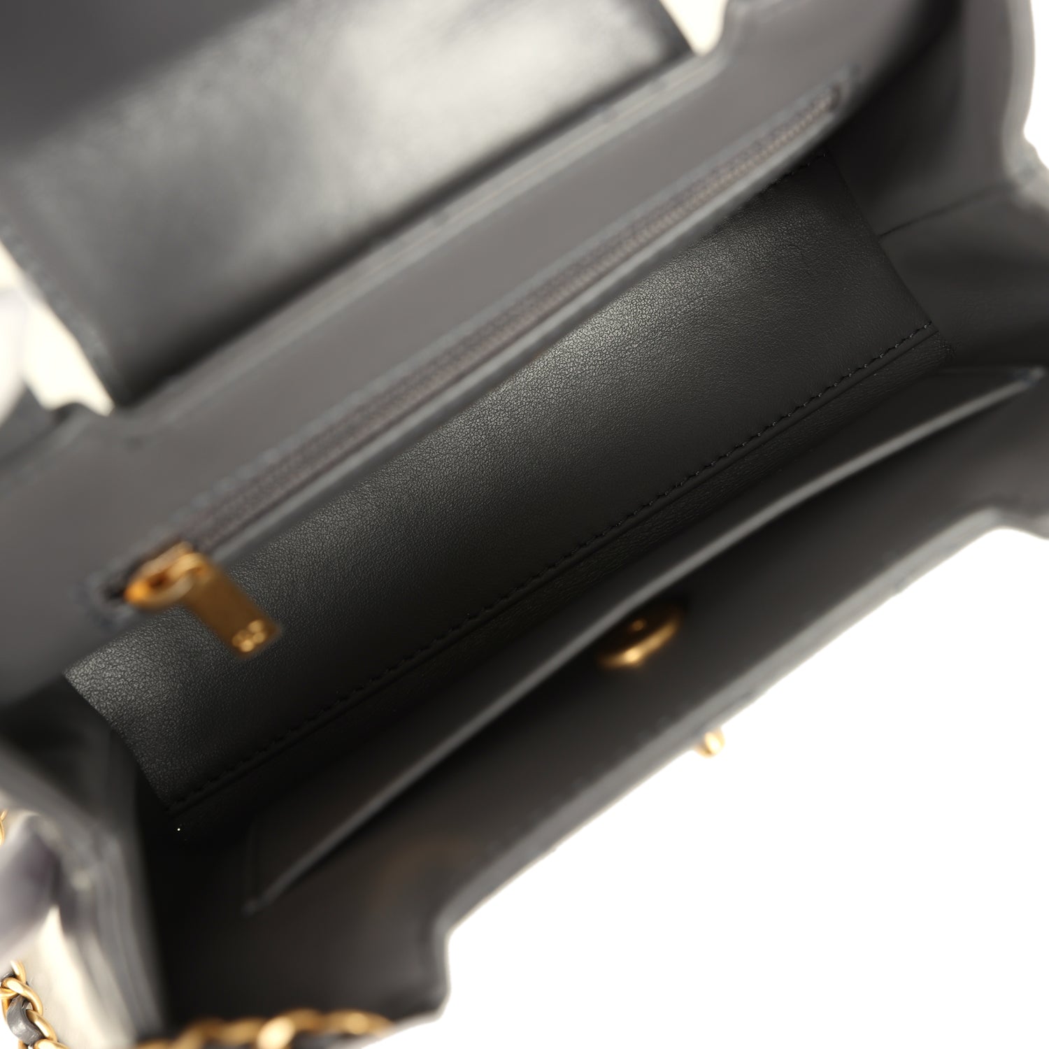The interior is lined in dark grey leather with one zip pocket on the rear wall and one center divide slip pocket.