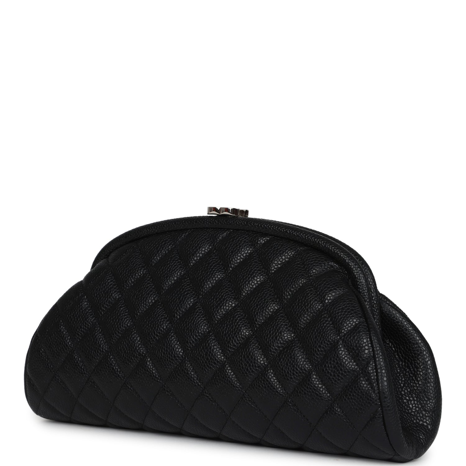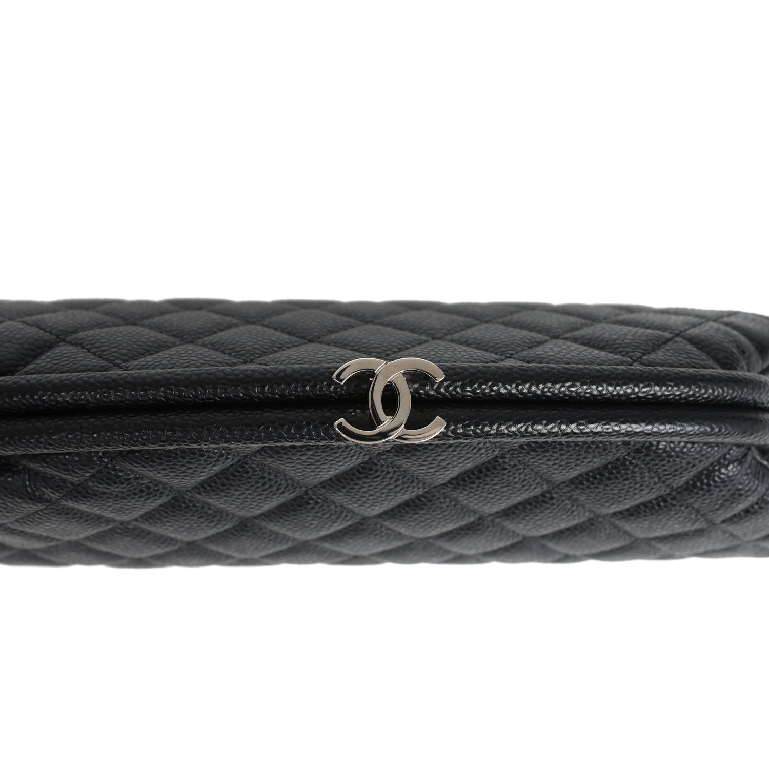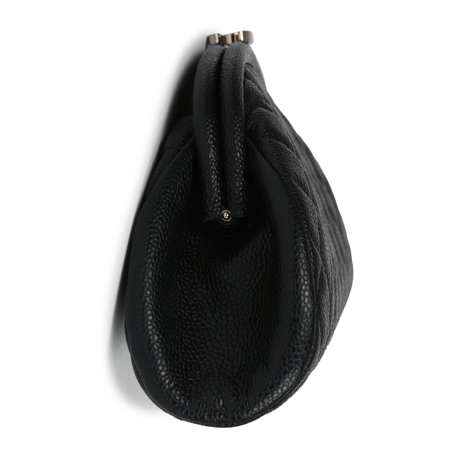 This Chanel Timeless CC Kisslock Clutch is in black caviar leather with silver-tone hardware. featuring signature diamond quilt leather and a CC logo kisslock closure.