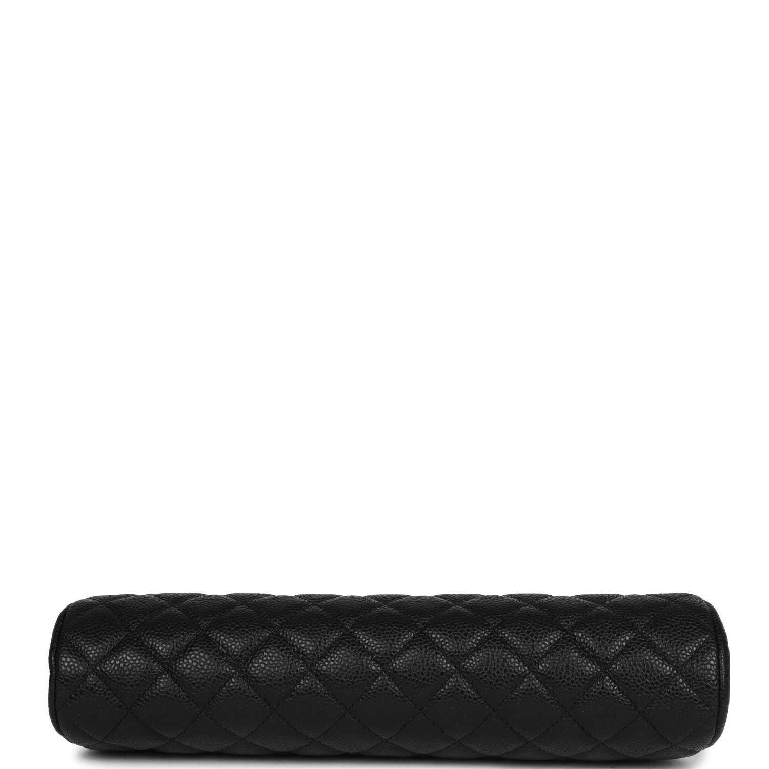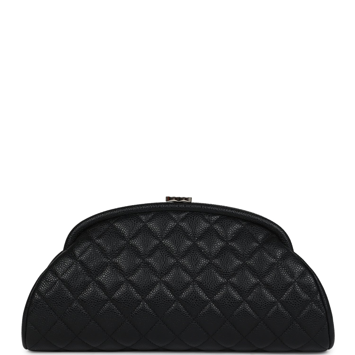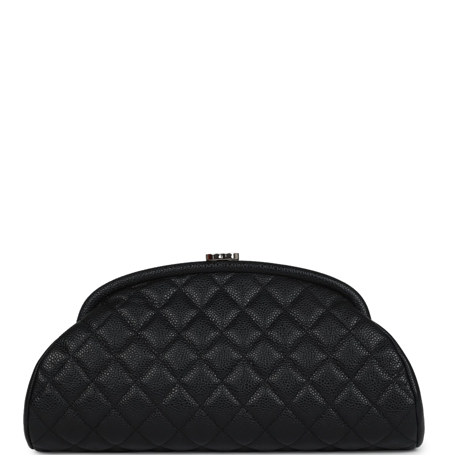 This Chanel Timeless CC Kisslock Clutch is in black caviar leather with silver-tone hardware. featuring signature diamond quilt leather and a CC logo kisslock closure.