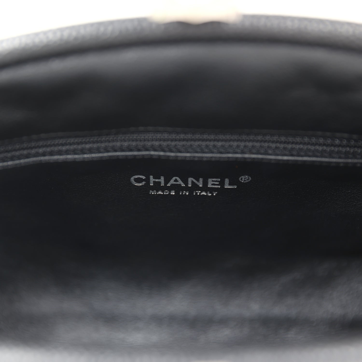 The interior is lined with black leather. featuring a zip pocket on the back wall with a Chanel logo zipper pull. lined with black grossgrain fabric.