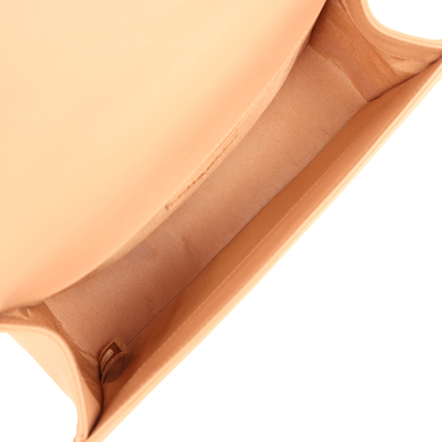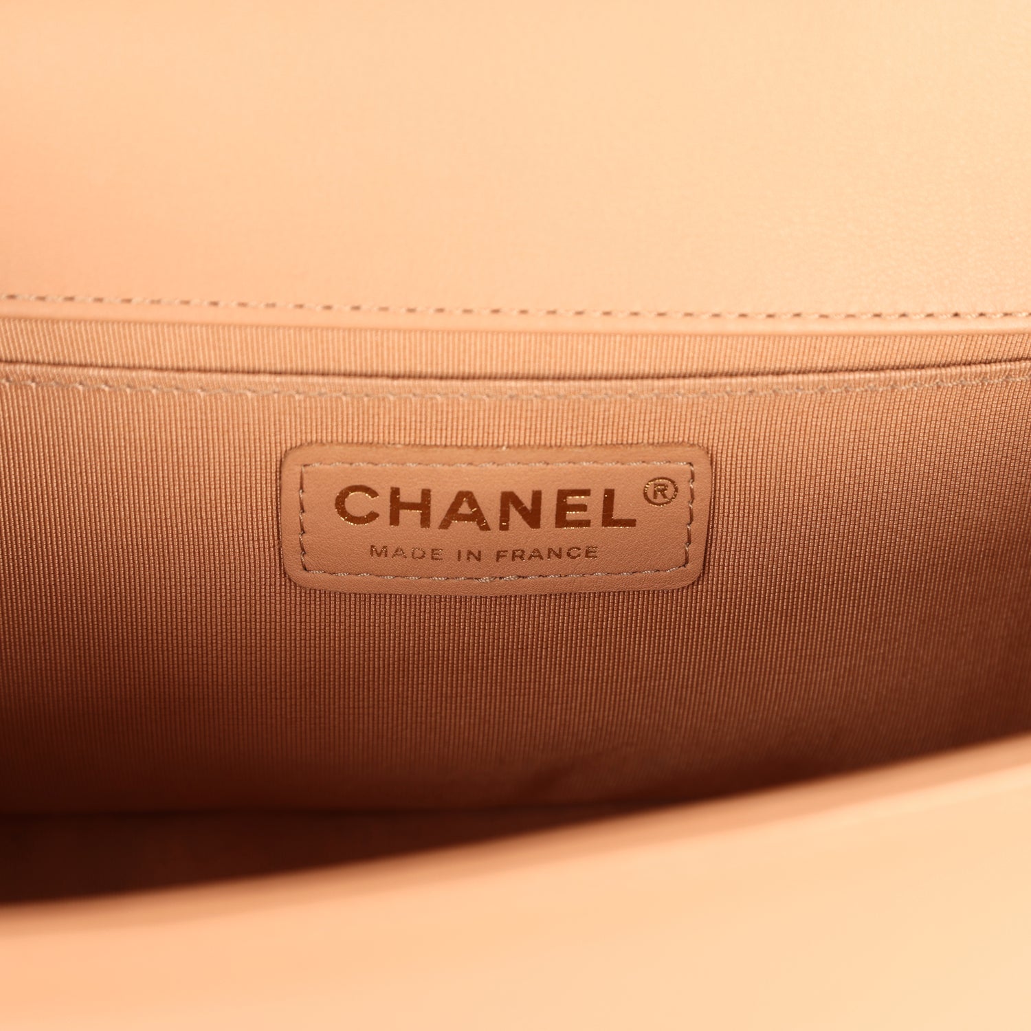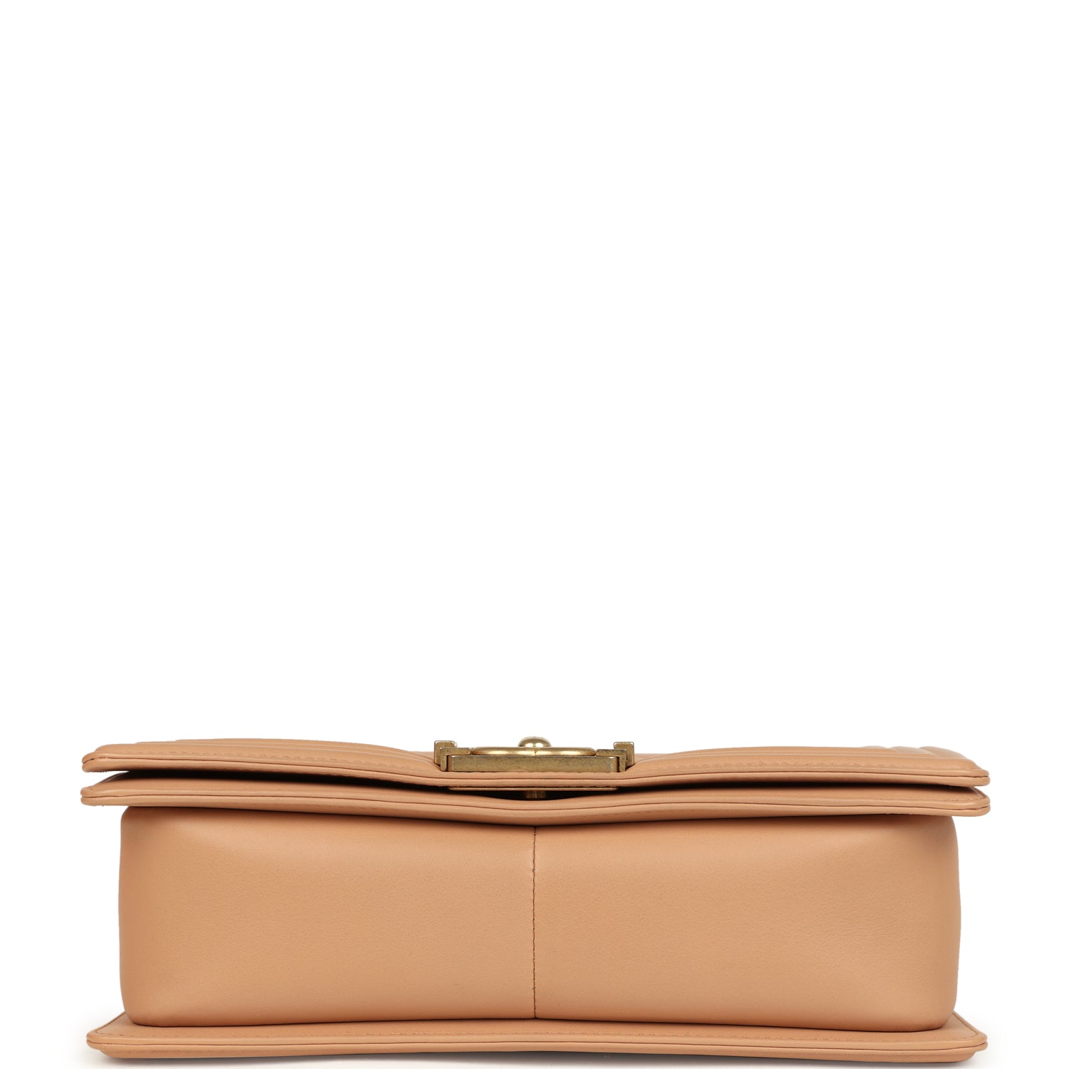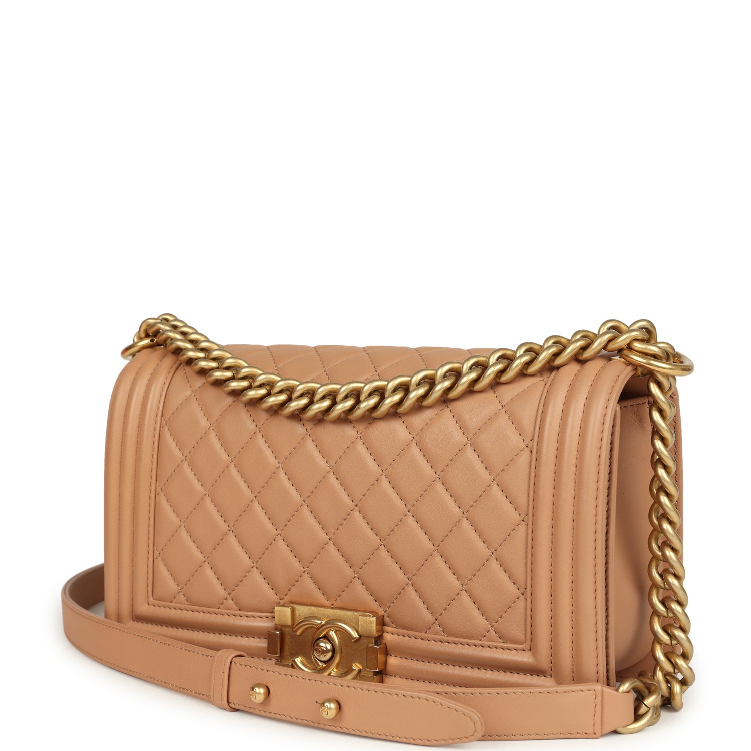 This Chanel Old Medium Boy Bag is in dark beige lambskin leather with antique gold hardware. featuring tonal stitching. front flap with Le Boy CC push closure. smooth leather trim. and antique gold chainlink and dark beige leather shoulder strap.