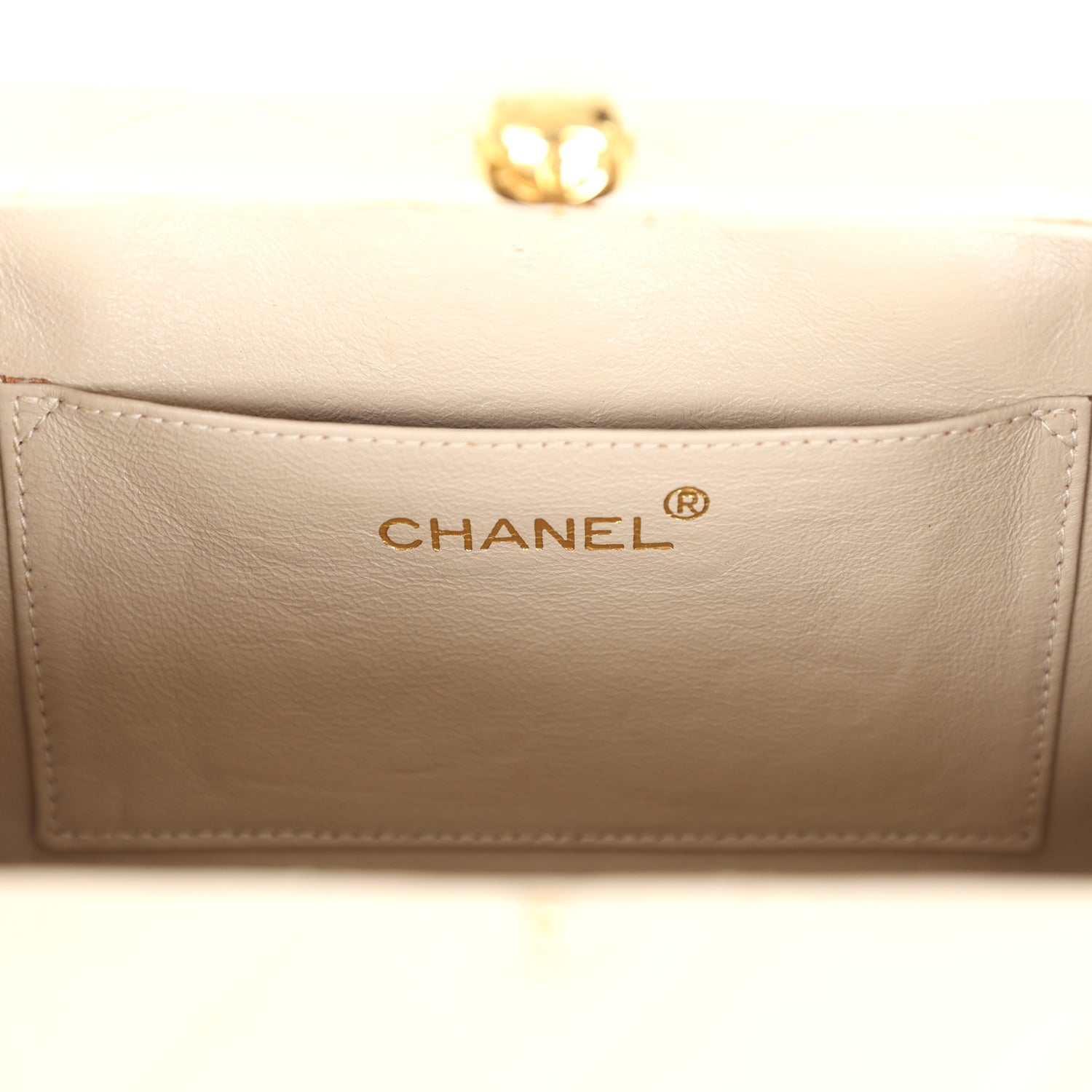 This vintage Chanel Box Clutch Bag is in beige Lambskin leather with gold hardware. featuring signature diamond quilt leather. push lock closure. and a single interwoven Beige leather and gold tone chain link strap.