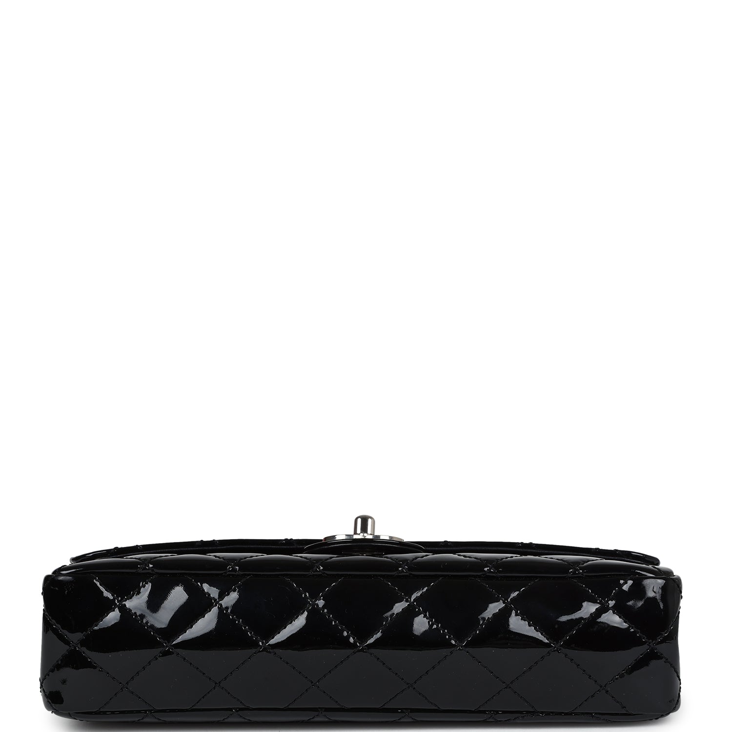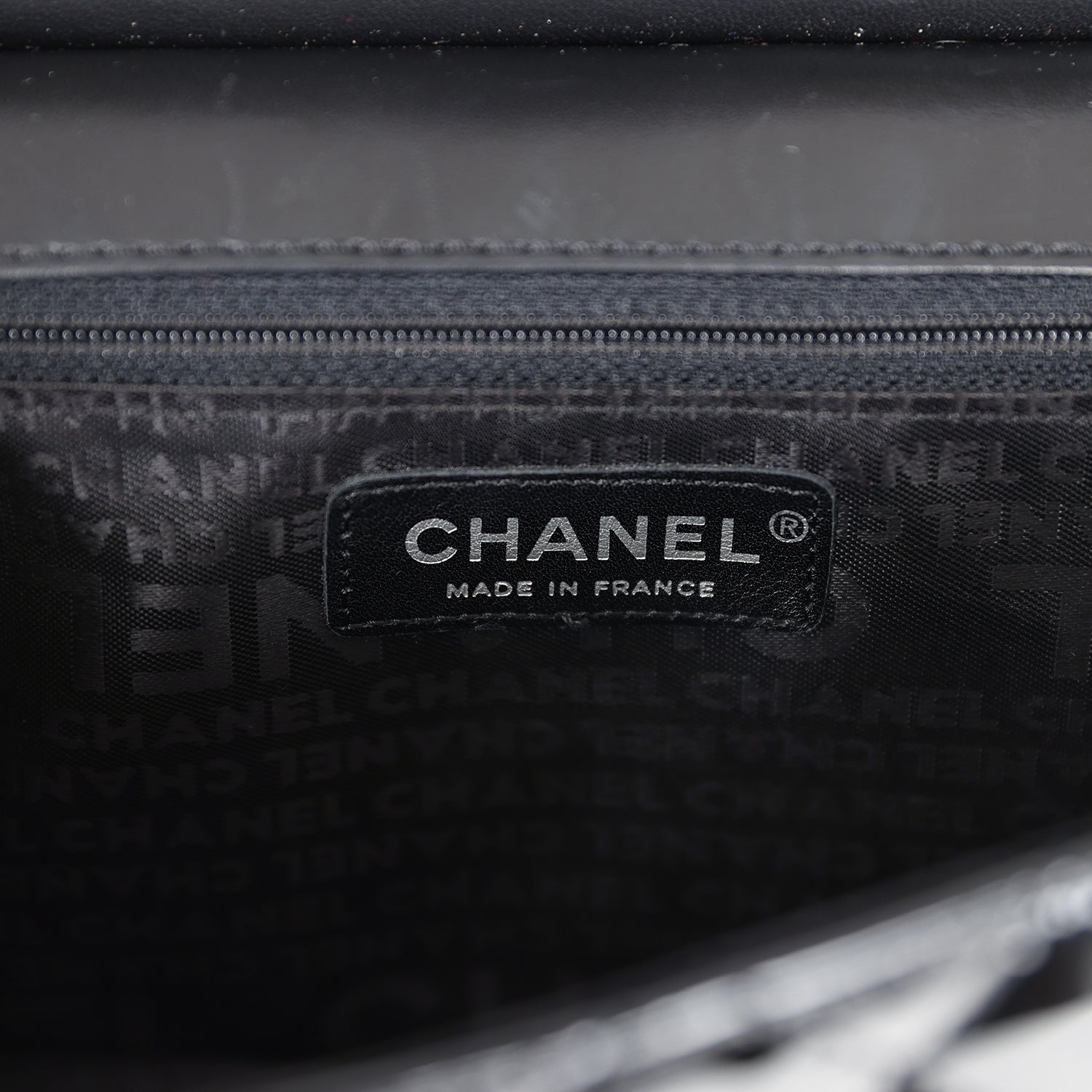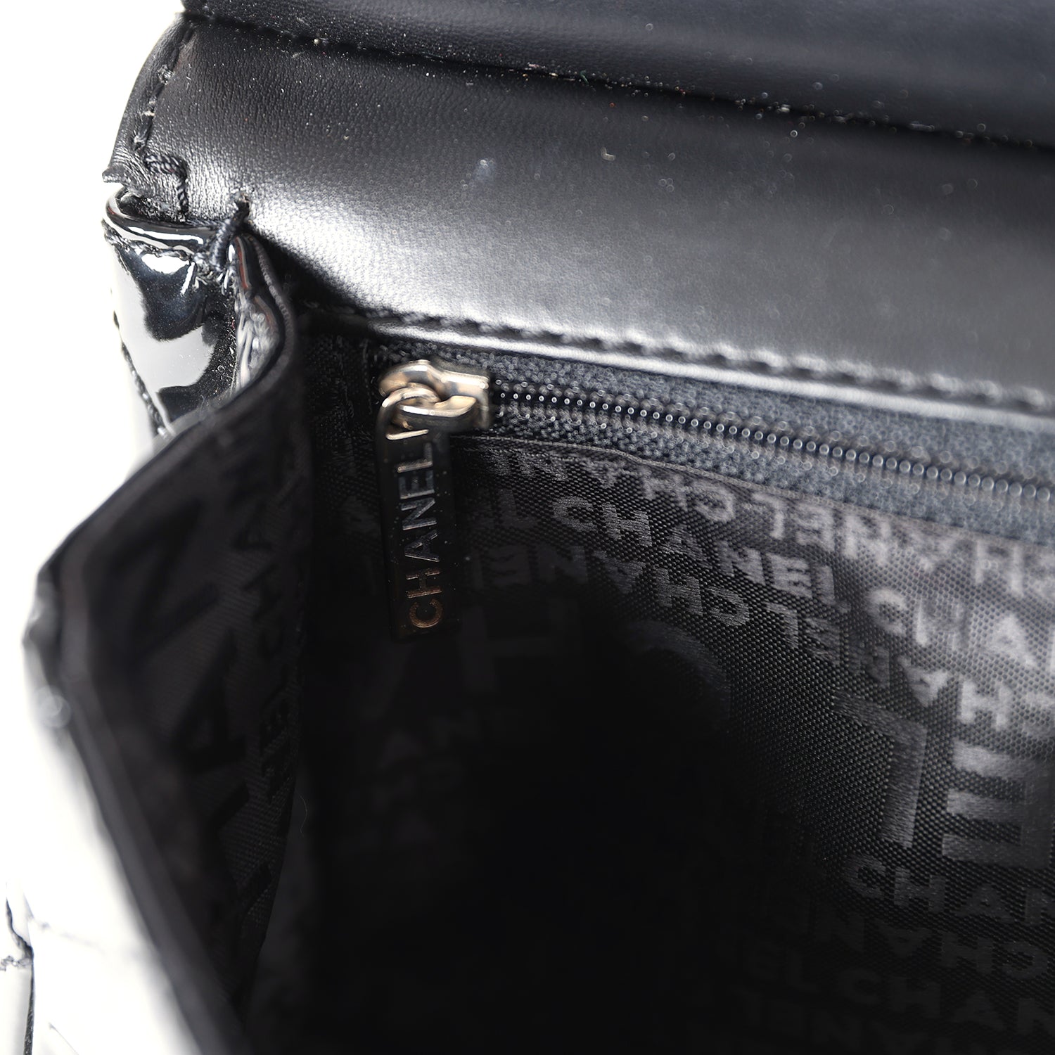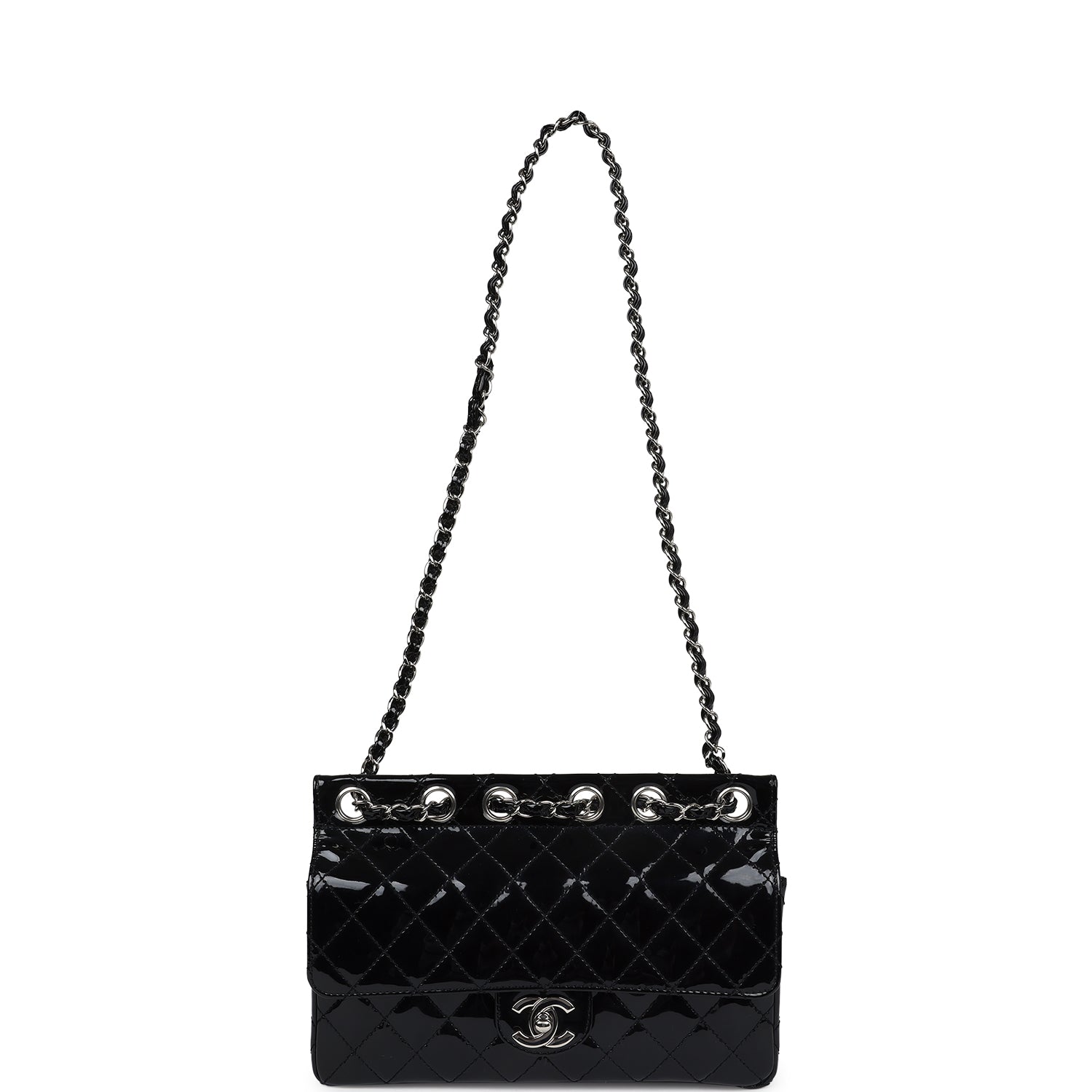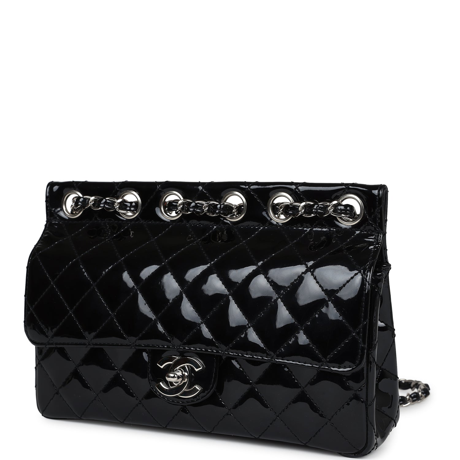 • Vintage Chanel Chain Through Flap Bag Black Patent Silver Hardware