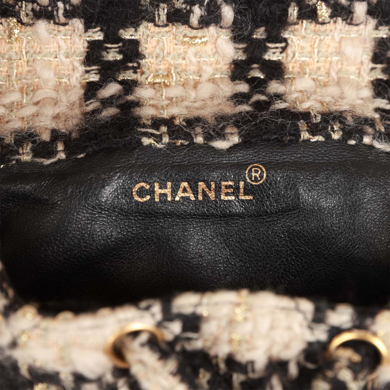 The interior is lined in black leather and features a zipper pocket with Chanel pull.
