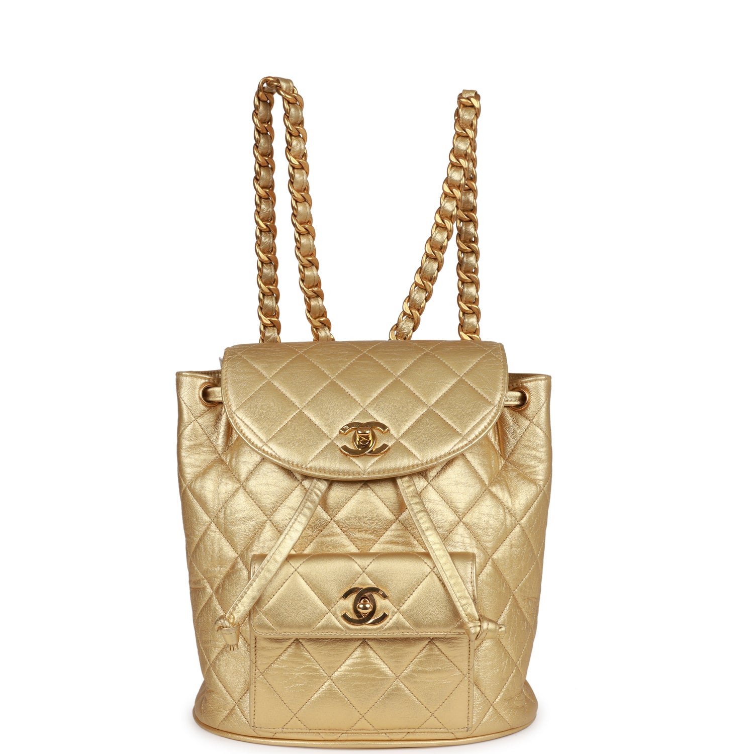 This vintage Duma backpack is in gold metallic lambskin with gold hardware. signature CC interlocking closure with front flap. an additional drawstring closure. exterior front pocket. two shoulder straps for backpack use. and gold metal and gold leather chain.