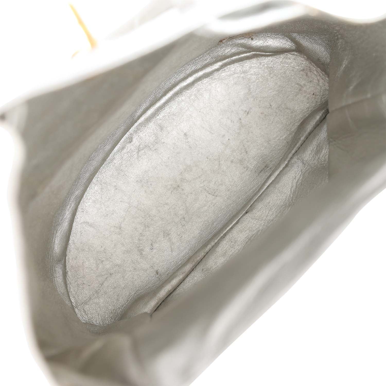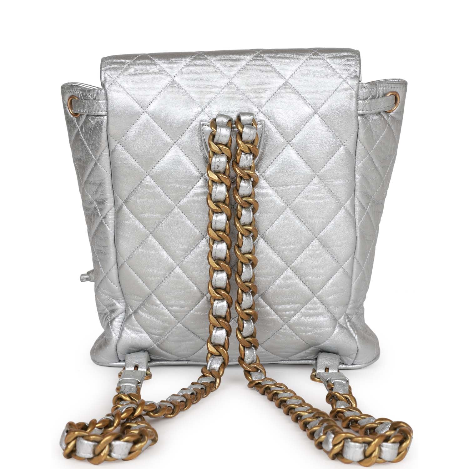 This vintage Duma backpack is in silver metallic lambskin with gold hardware. signature CC interlocking closure with front flap. an additional drawstring closure. exterior front pocket. two shoulder straps for backpack use. and gold metal and silver leather chain.