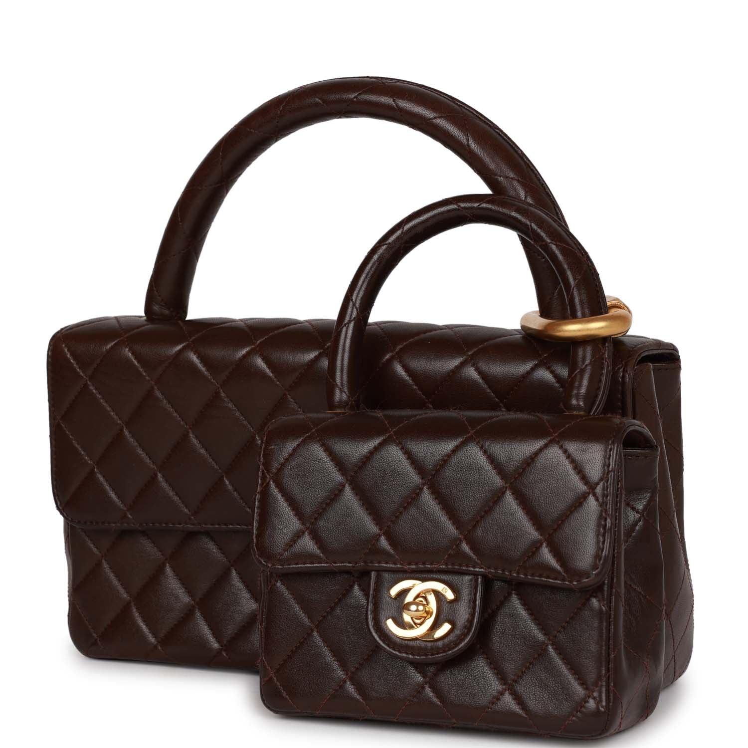 This Vintage Kelly Flap Bag set is in brown lambskin leather with gold hardware. both featuring signature CC turnlock closures with front flaps. rear half moon pockets. a gold carabiner attachment. and top handles on each bag.