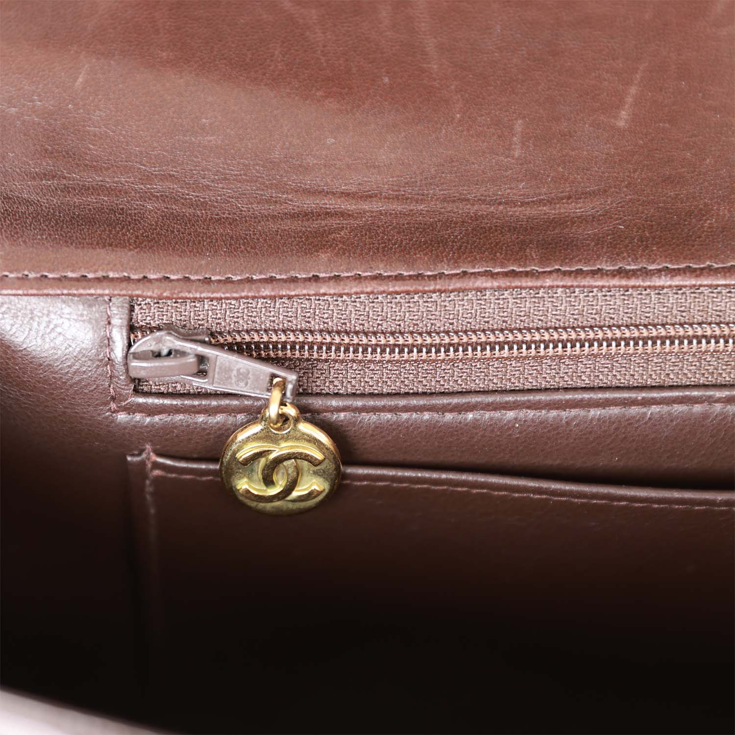 The larger parent bag is lined in brown leather featuring a zip pocket with CC logo pull and slip pocket underneath on the rear wall. The smaller child bag is lined in brown leather featuring a slip pocket on the rear wall.