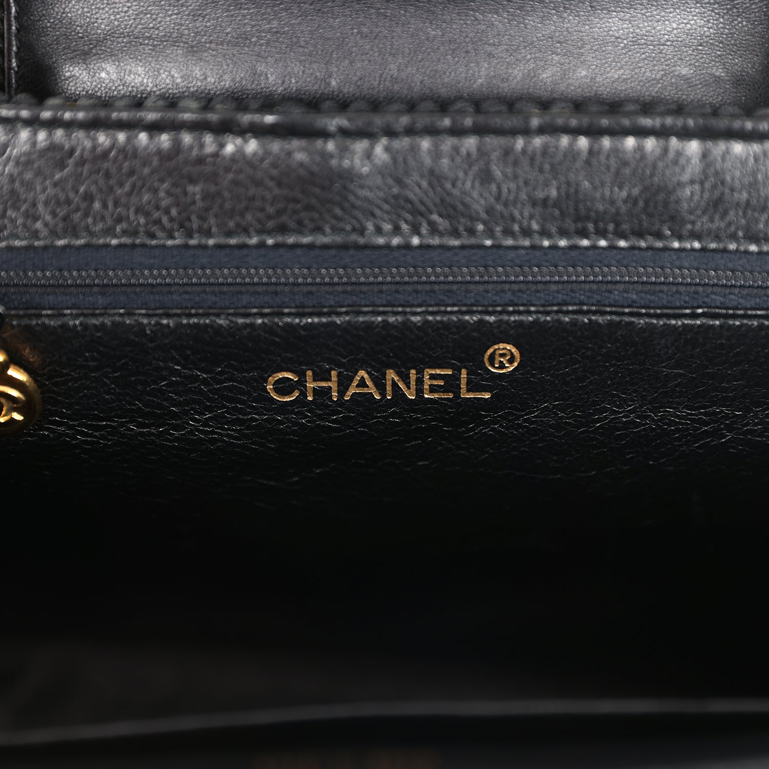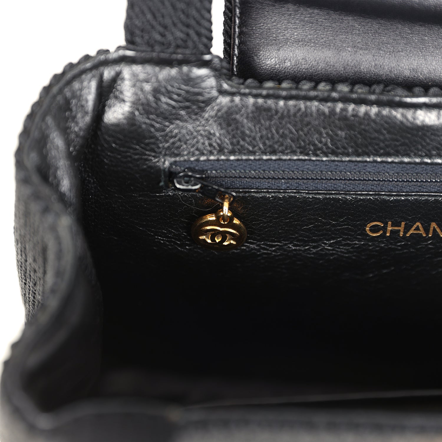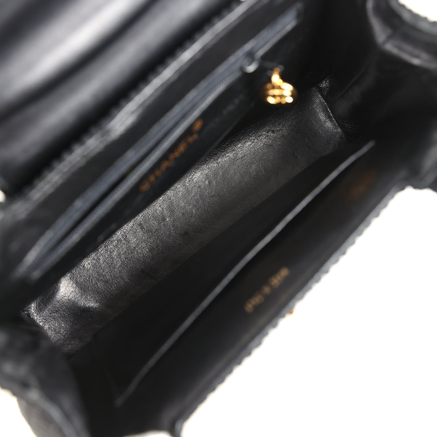 The interior is lined in black lambskin leather and has one zip pocket on the rear wall with logo pull. and one slit pocket on the front wall.