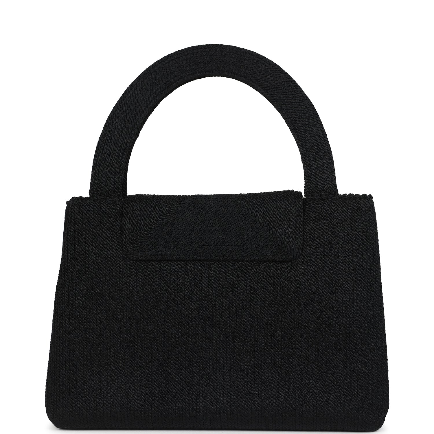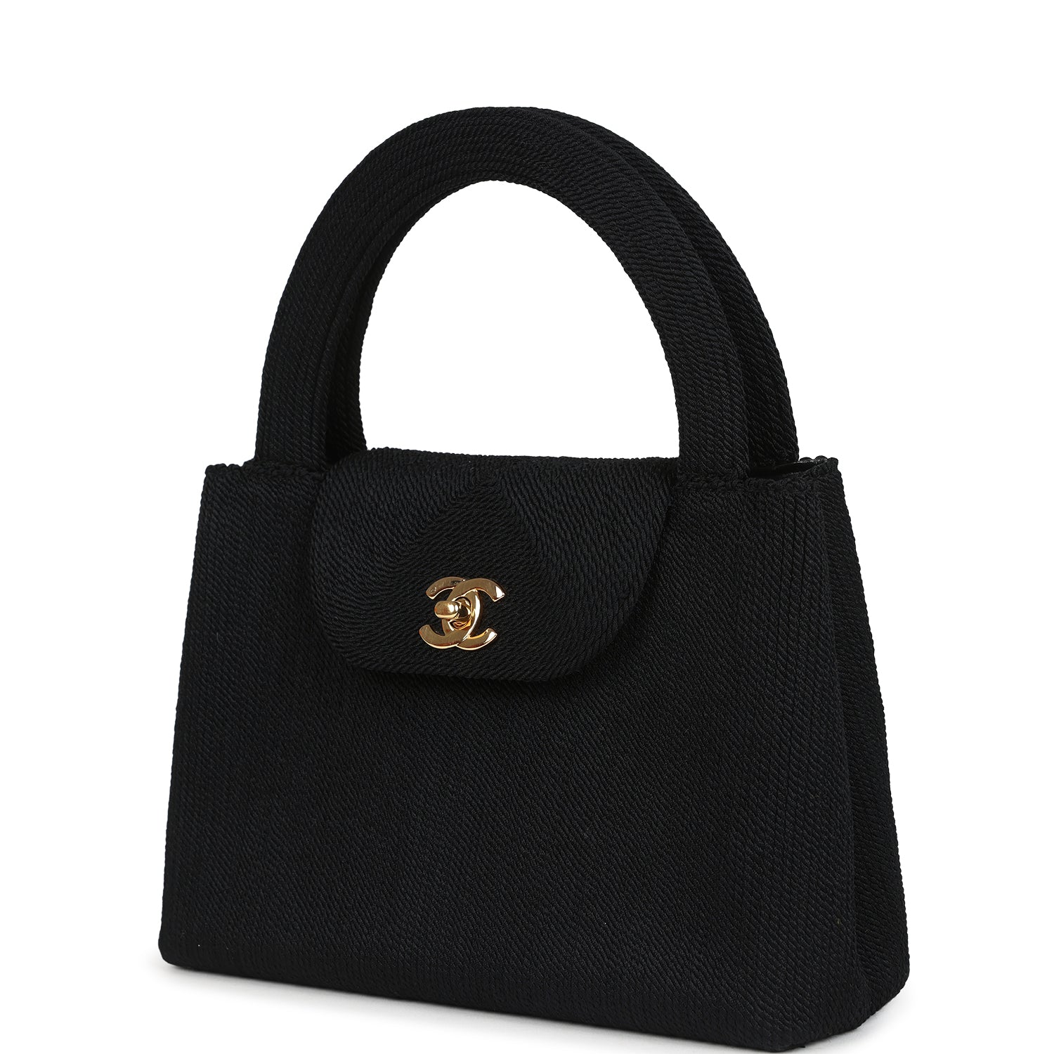 This vintage Chanel Large Top Handle rope Kelly is in black woven with gold hardware. featuring tonal stitching. has a front tab with CC turnlock closure. and two flat top handles.