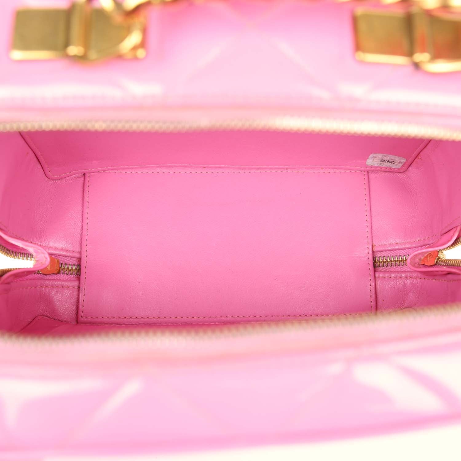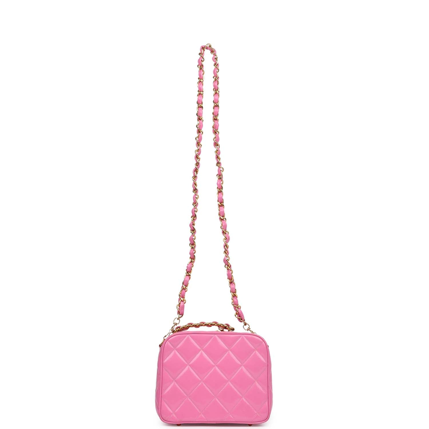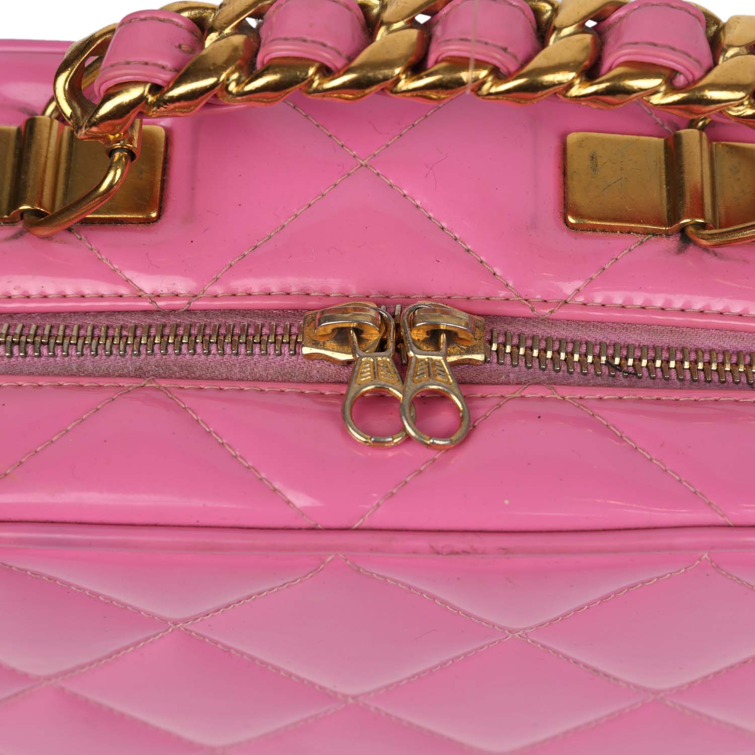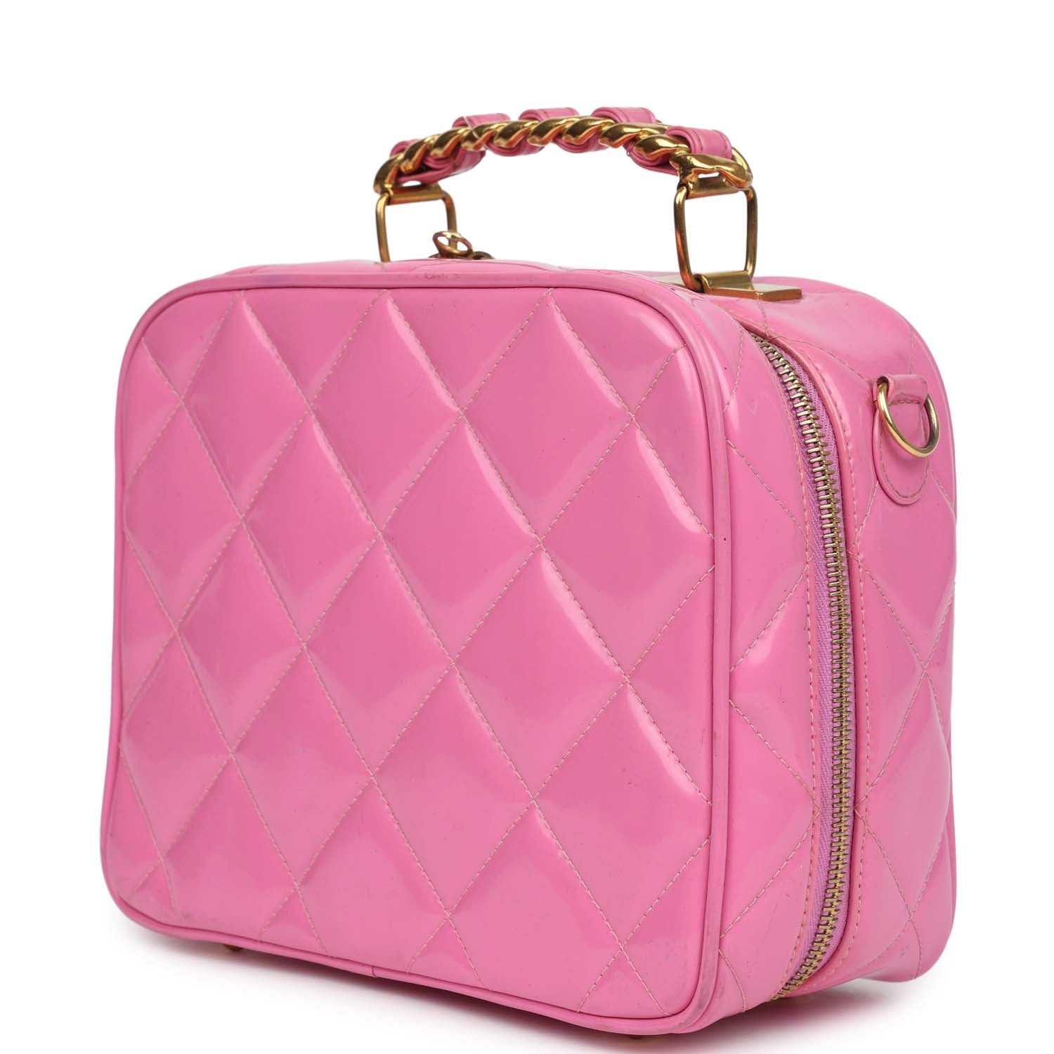 This vintage Vanity Case Bag is in pink quilted patent leather with gold hardware. a zip around closure. an interwoven leather and gold plated chain link top handle. and a detachable interwoven leather and gold plated chain link shoulder strap.