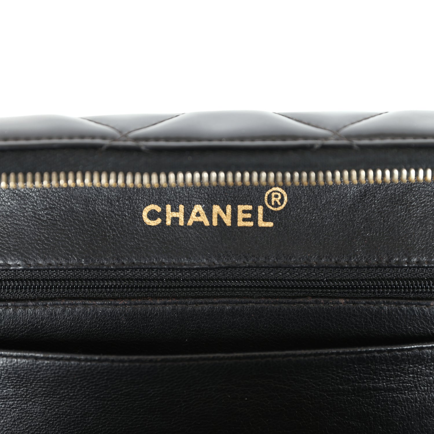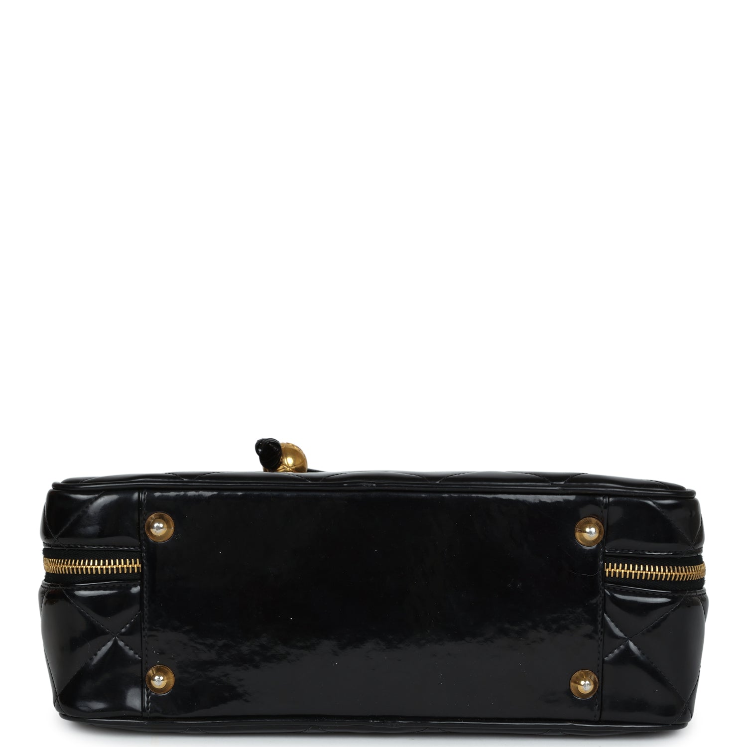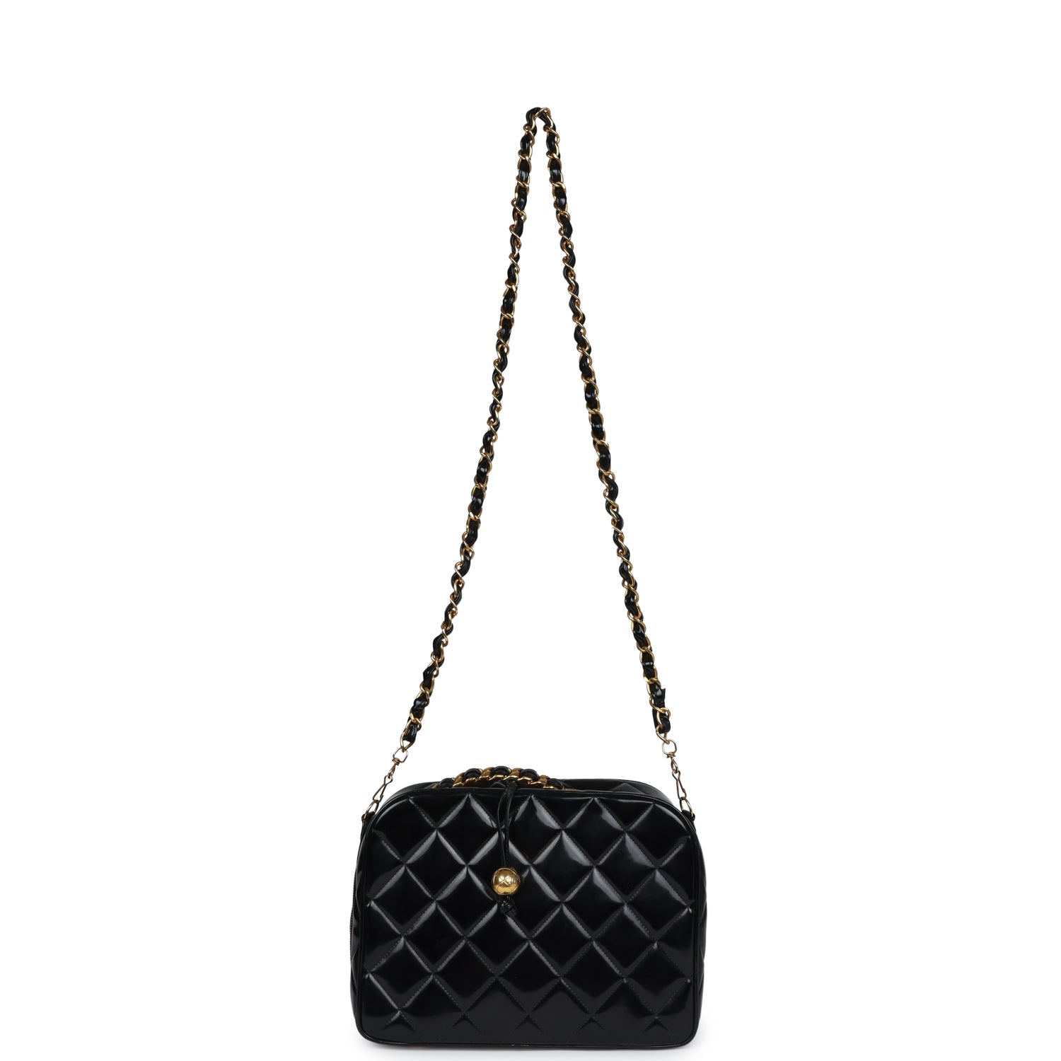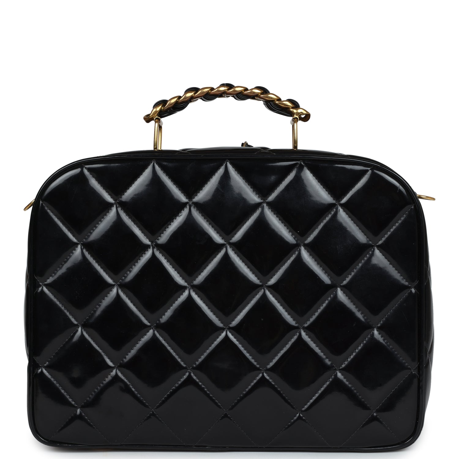 This Vintage Vanity Case Bag is in Black quilted patent leather with gold hardware. a zip around closure. an interwoven leather and gold plated chain link top handle. and a detachable interwoven Black leather and gold plated chain link shoulder strap.