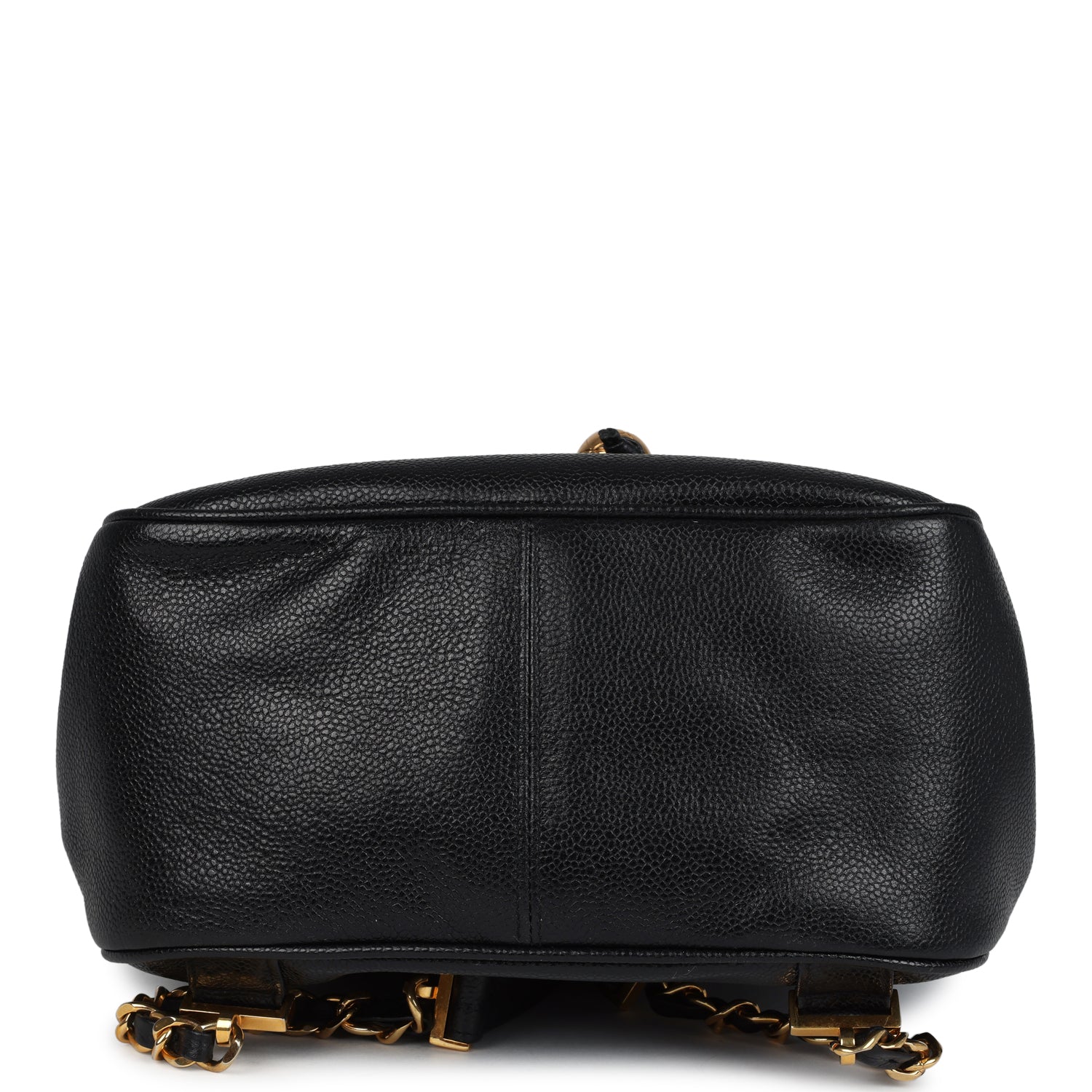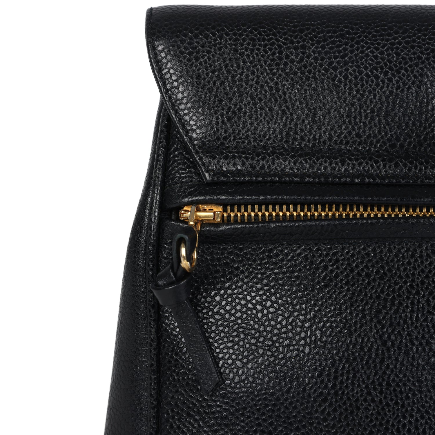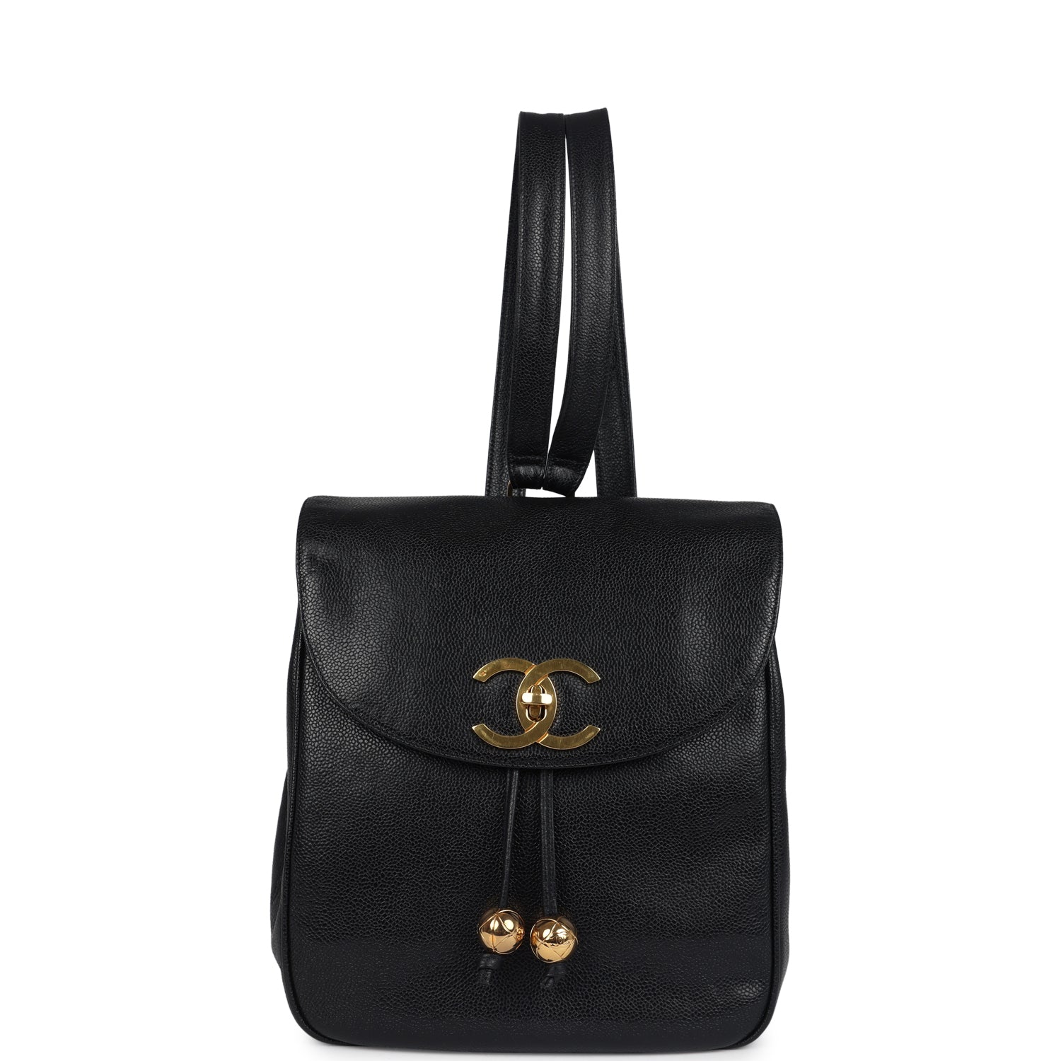 This vintage Chanel CC Backpack is of black caviar leather with gold tone hardware and has a round front flap with signature CC logo. a drawstring pull. a back exterior zip pocket. and leather and gold tone backpack shoulder straps.