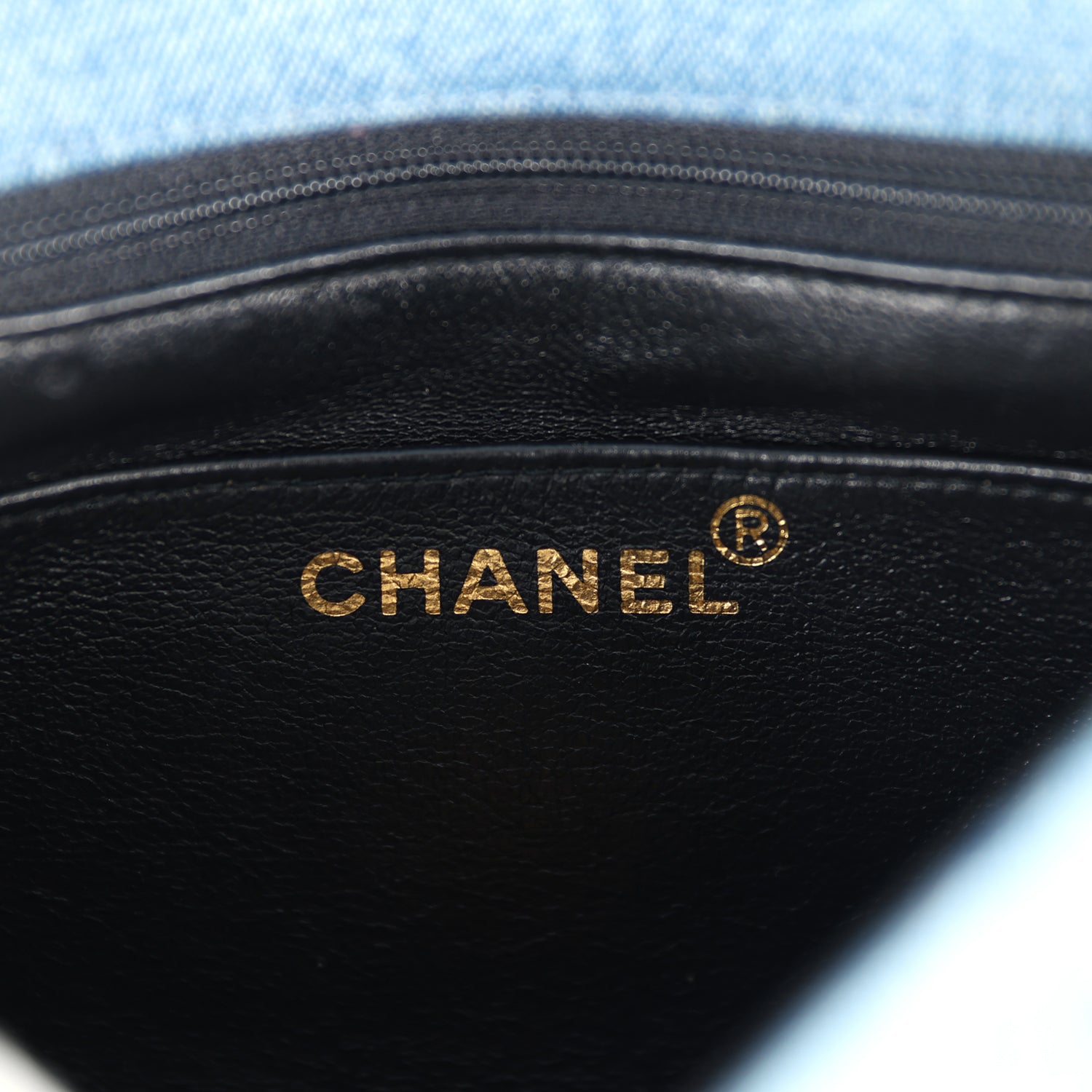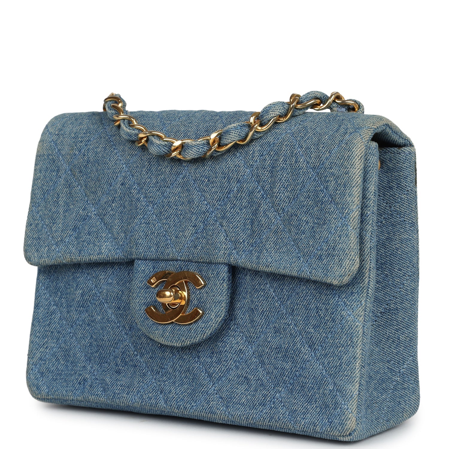 This Vintage Chanel Mini Square Flap Bag is in blue denim with gold hardware. front flap with CC turnlock closure. and an interwoven gold tone chain link with red leather shoulder/crossbody strap.
