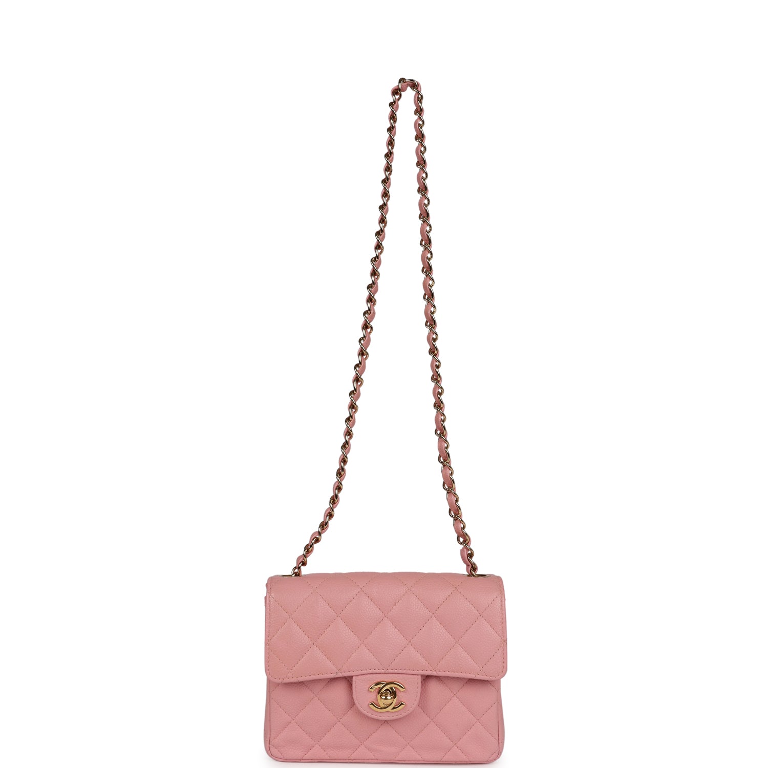 This vintage Chanel Mini Square Flap Bag is in pink caviar with gold hardware. front flap with CC turnlock closure. and an interwoven gold tone chain link with pink leather shoulder strap